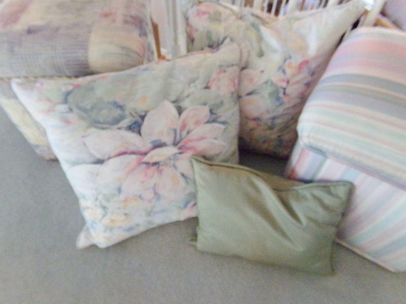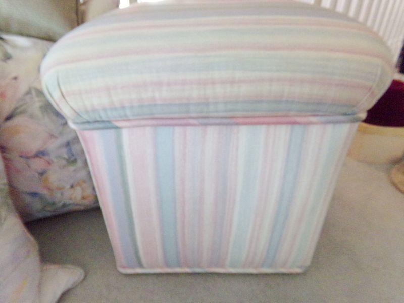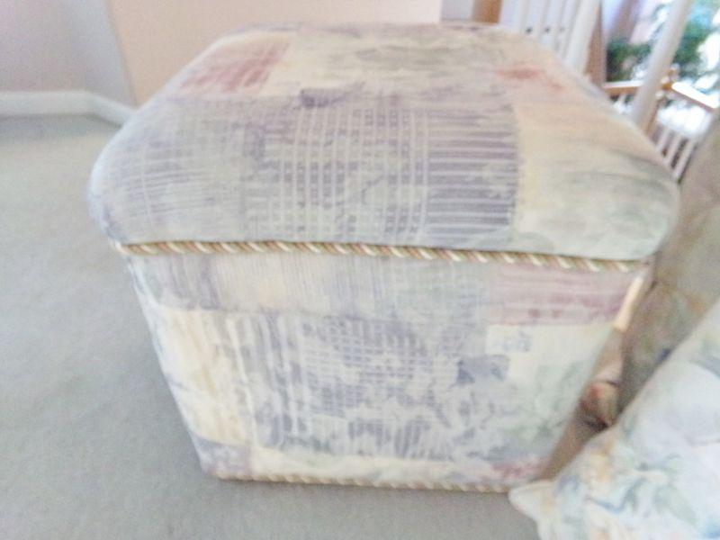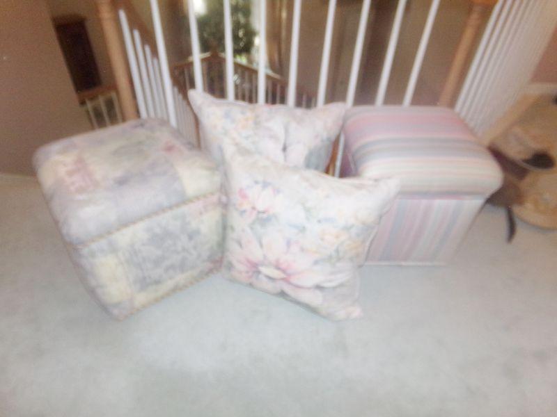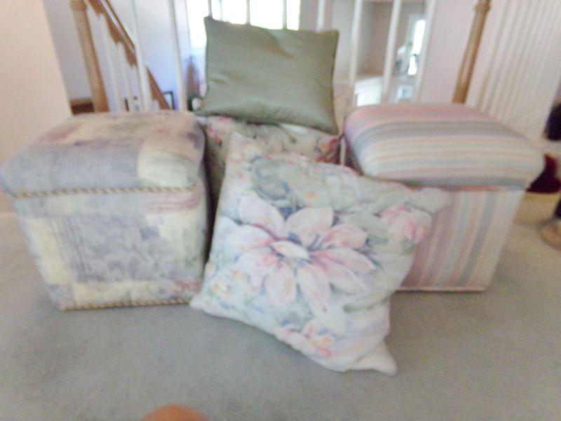 2 UPHOLSTERED OTTOMANS AND 2 LARGE THROW PILLOWS, 1 SMALL
