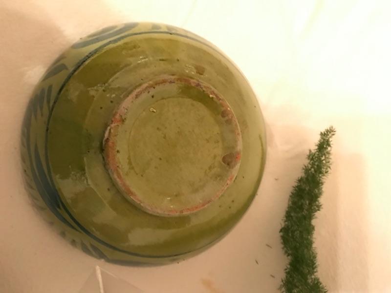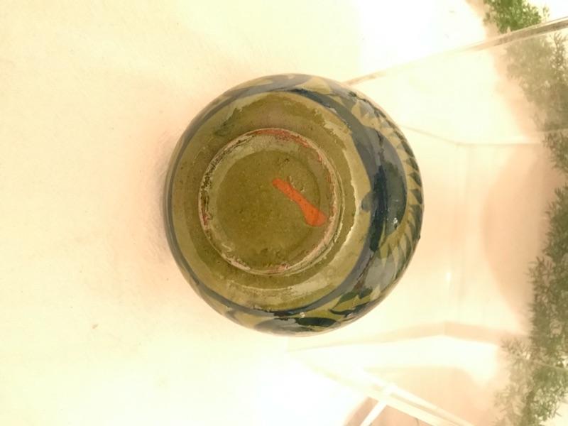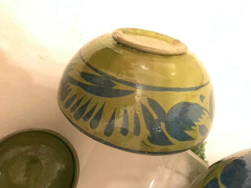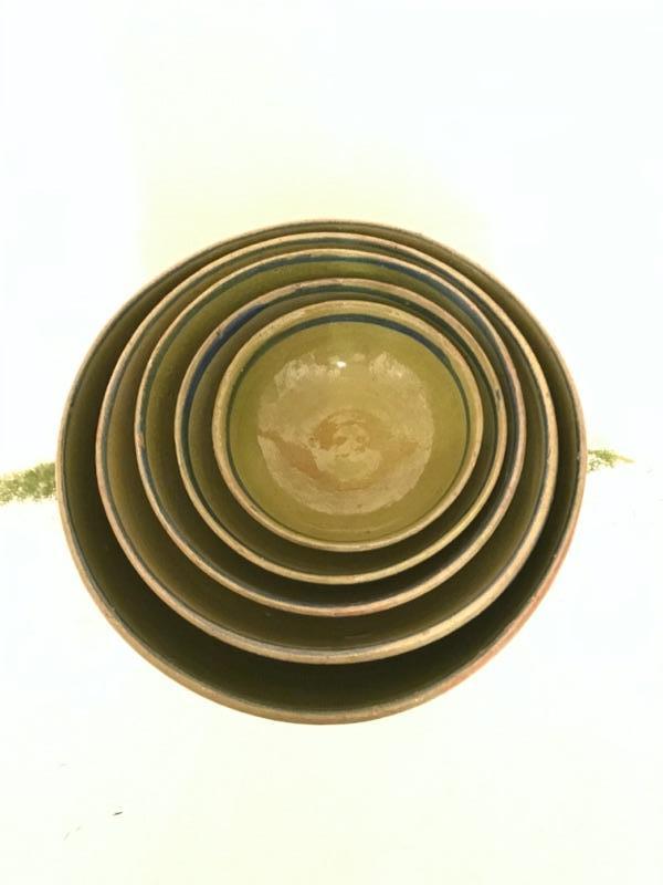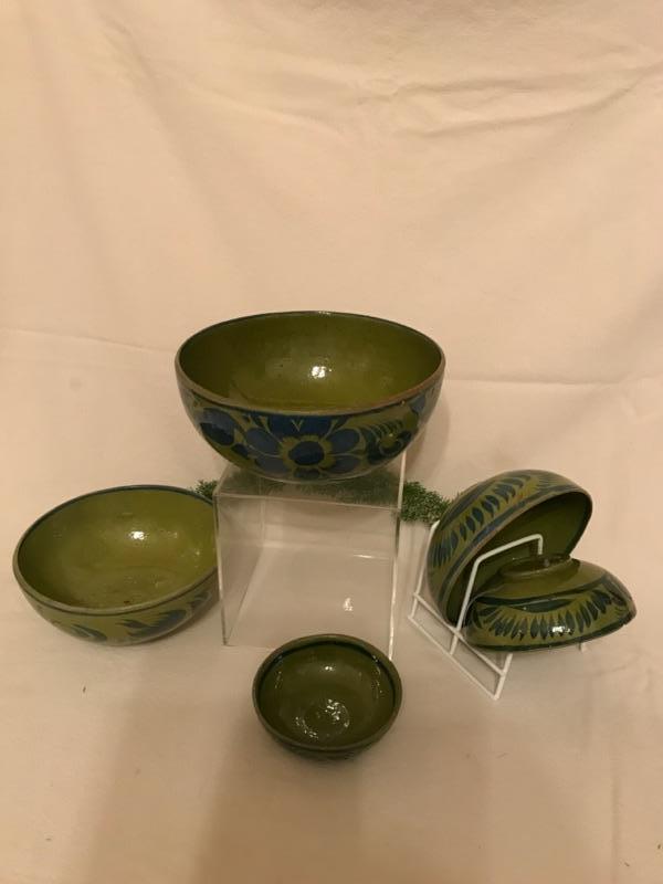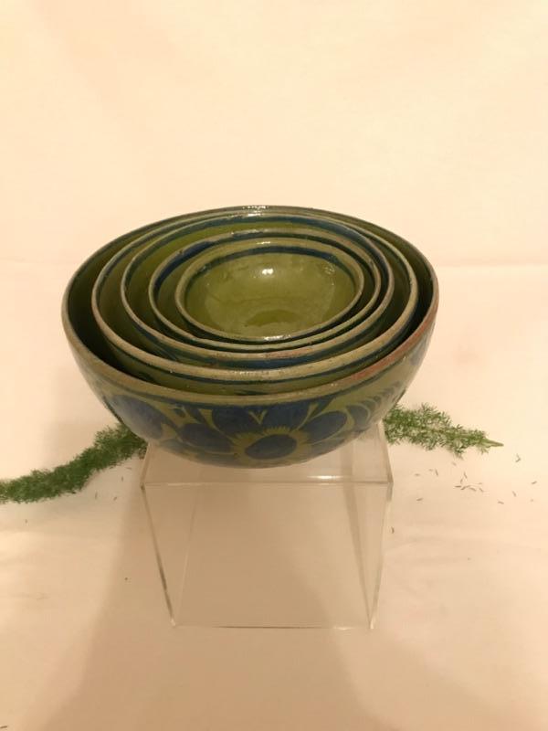 5 avocado green Mexican nesting bowls. Just lovely! All of us at Alta Luna Estate Sales lust over these bowls. The patina is fabulous, and the dark blue art on the outside is a work of art.