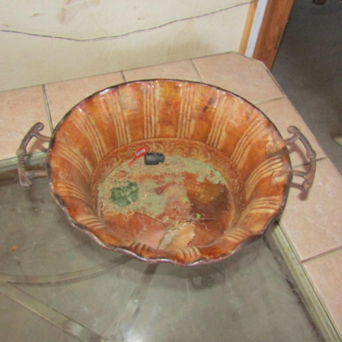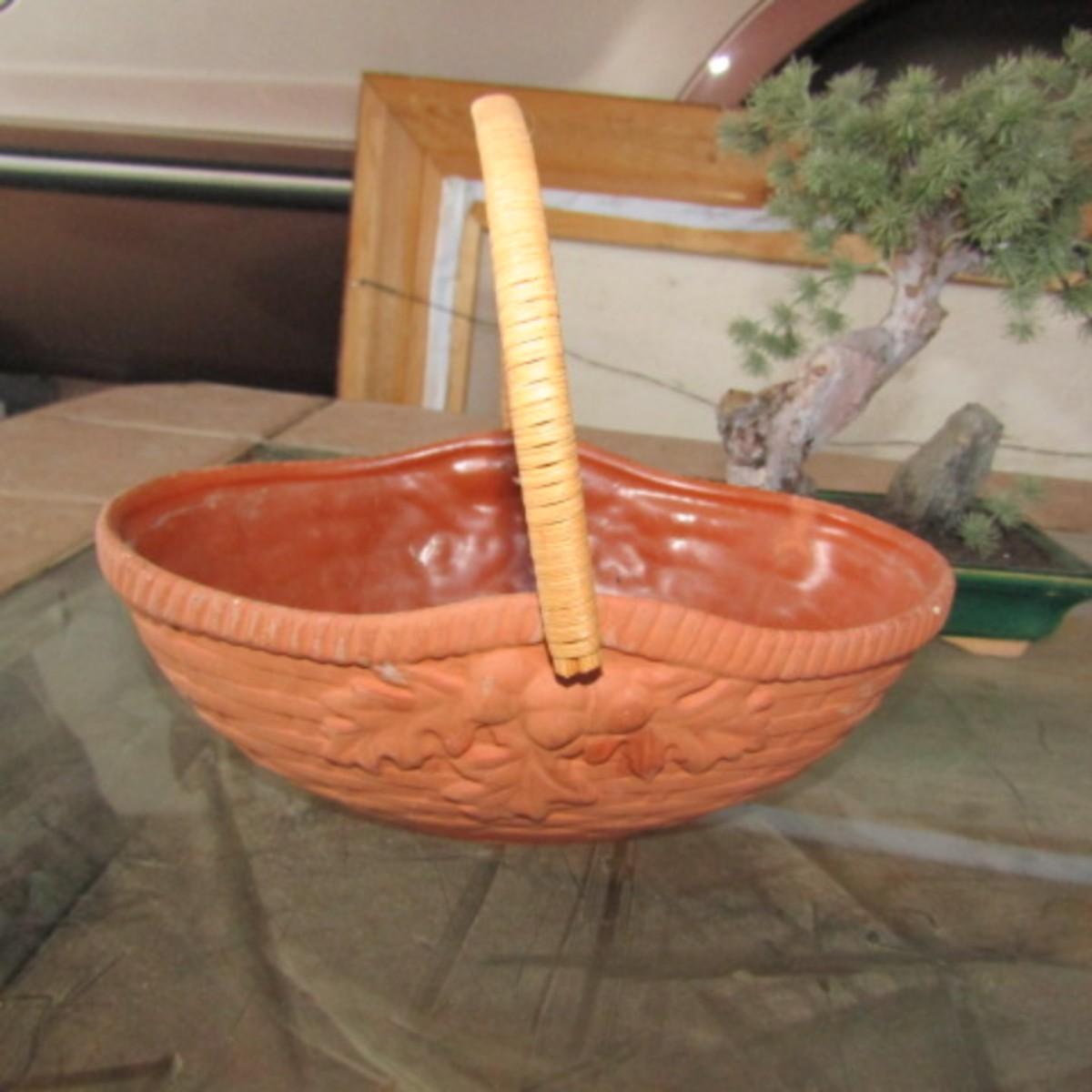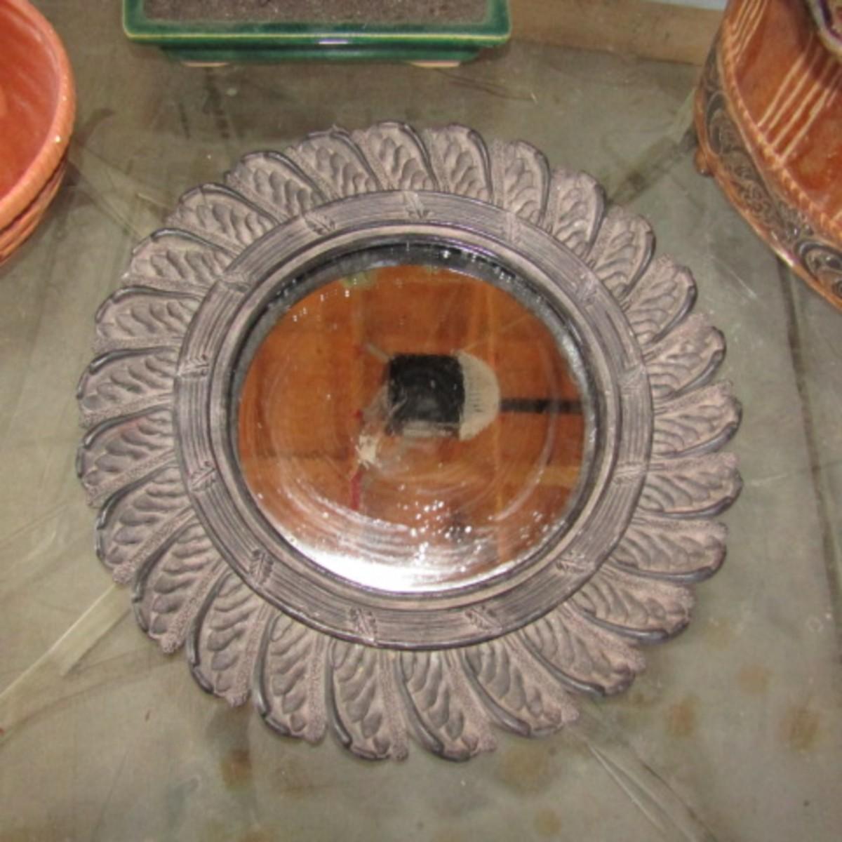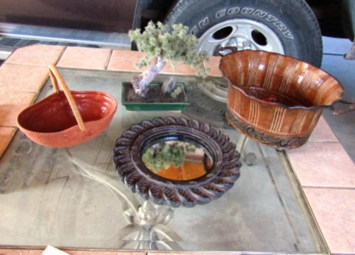 SMALL 12" ROUND WALL MIRROR, BONSAI TREE, METAL AND TERRA COTTA BASKETS