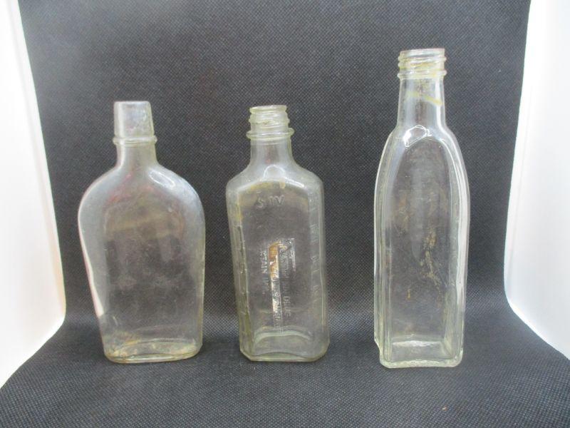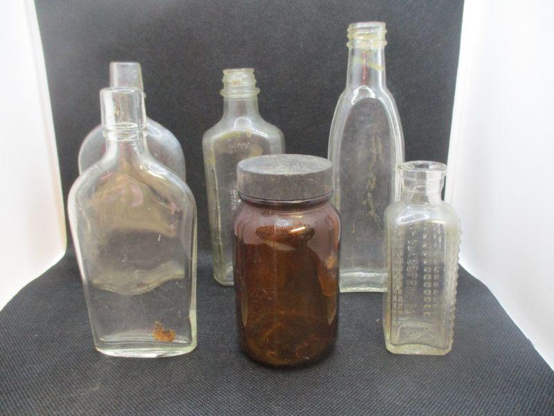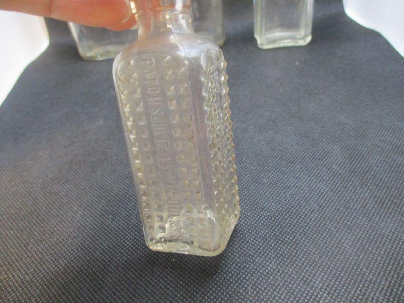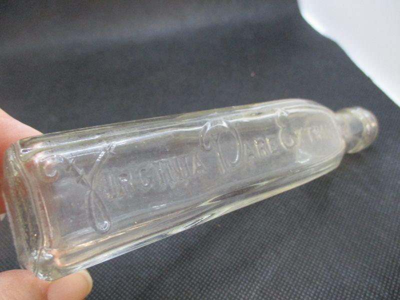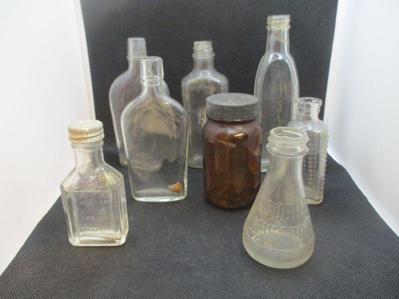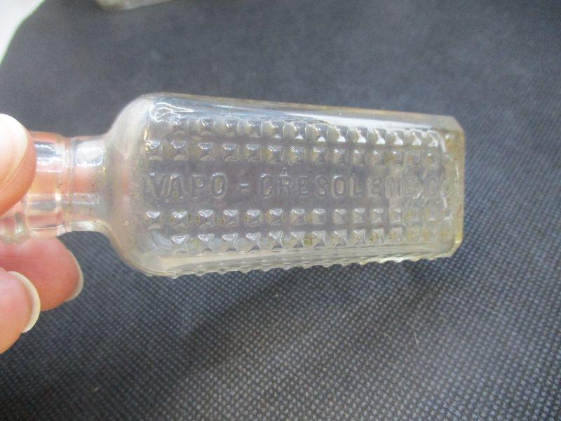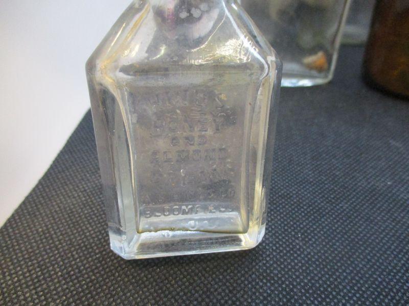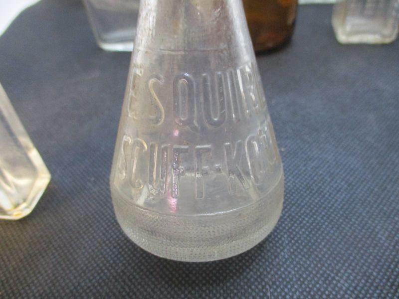 In the far back from left to right - a liquor bottle from Knox Glass Bottle Co (1932-1953), a medicine bottle from the Fountain Inn Drug Co., and a Virginia Dare Extract Co bottle. In the middle row, from left to right - a small liquor bottle with a small piece of cork inside, a brown glass bottle made by Owens Illinois and I believe is from the 1940s, and Vapo-Cresolene Co bottle made by Duraglas. The front row is Hinds Honey and Almond Cream by A S Hinds Co and Esquire Scuff-Kote bottle with the bottom embossed with "Knomark Mfg Co Inc Bklyn NY"