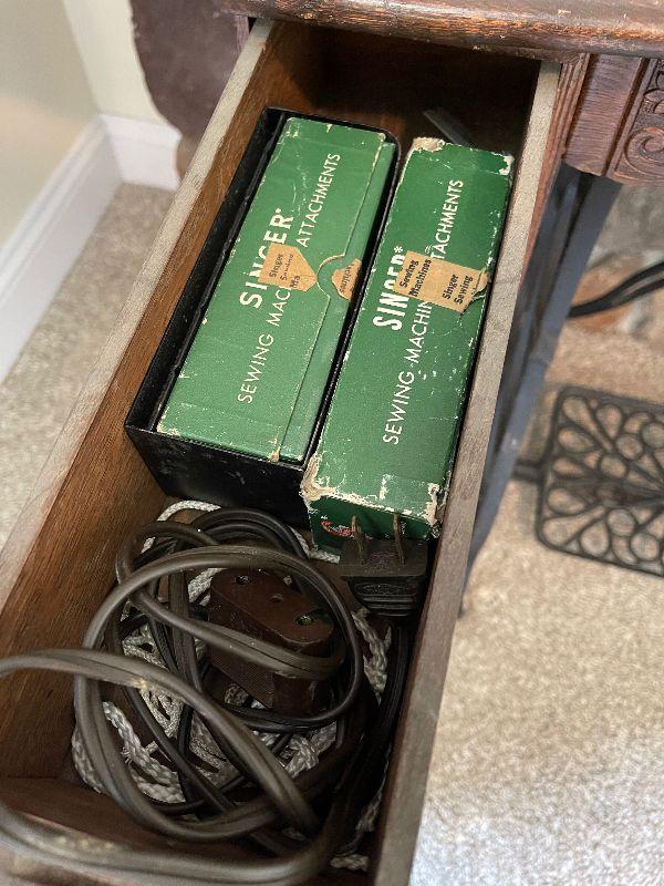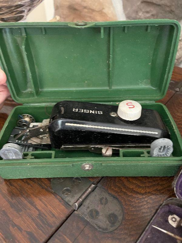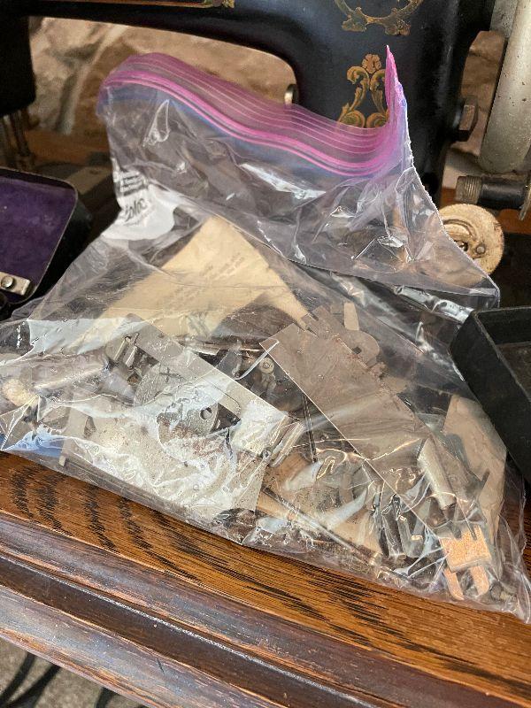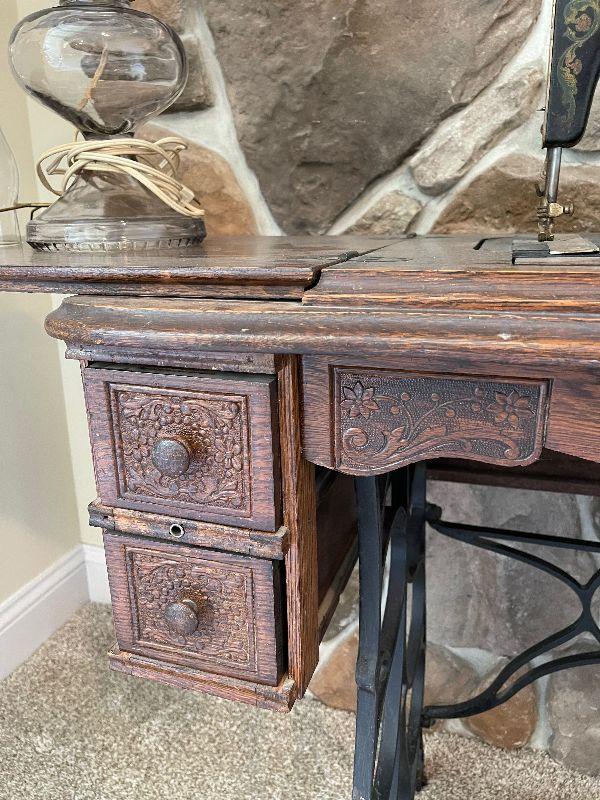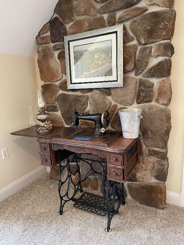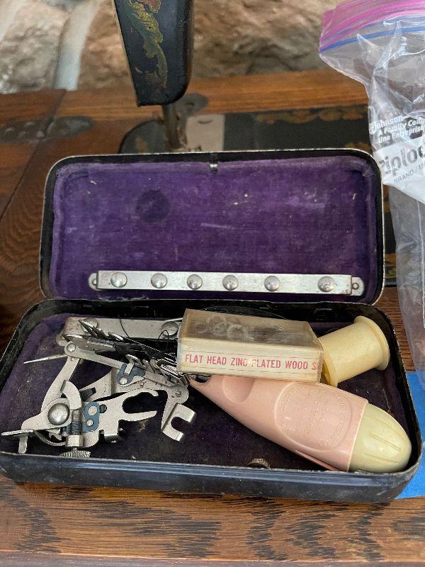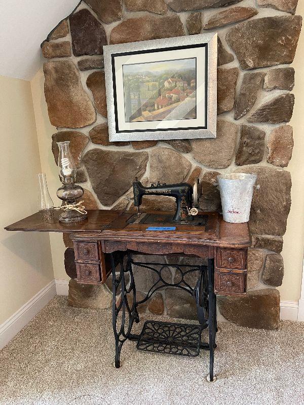 Antique Minnesota Sewing Machine with Cabinet and Sewing Attachemts, Electric Oil Lamp, Wall Art and Vintage Ice Bucket