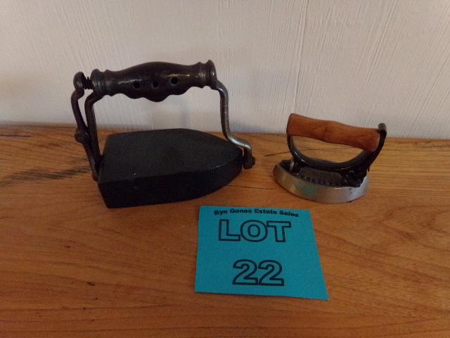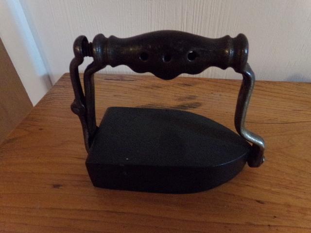 ANTIQUE SENSIBLE NO. 6 TOY SAD IRON BY NELSON R STREETER & CO. WITH WOODEN HANDLE. VINTAGE CAST SAD IRON WITH PERFORATED HANDLE. BOTH IN GOOD CONDITION,