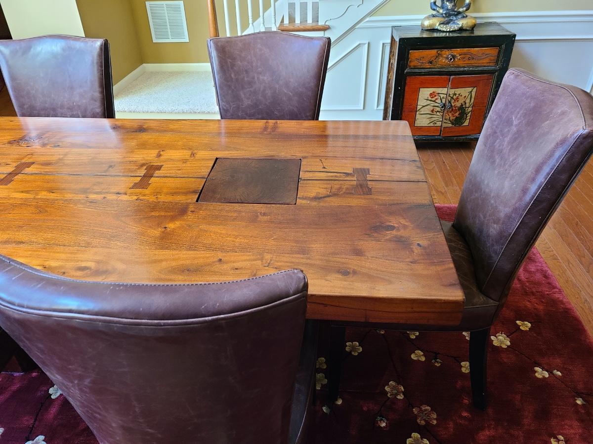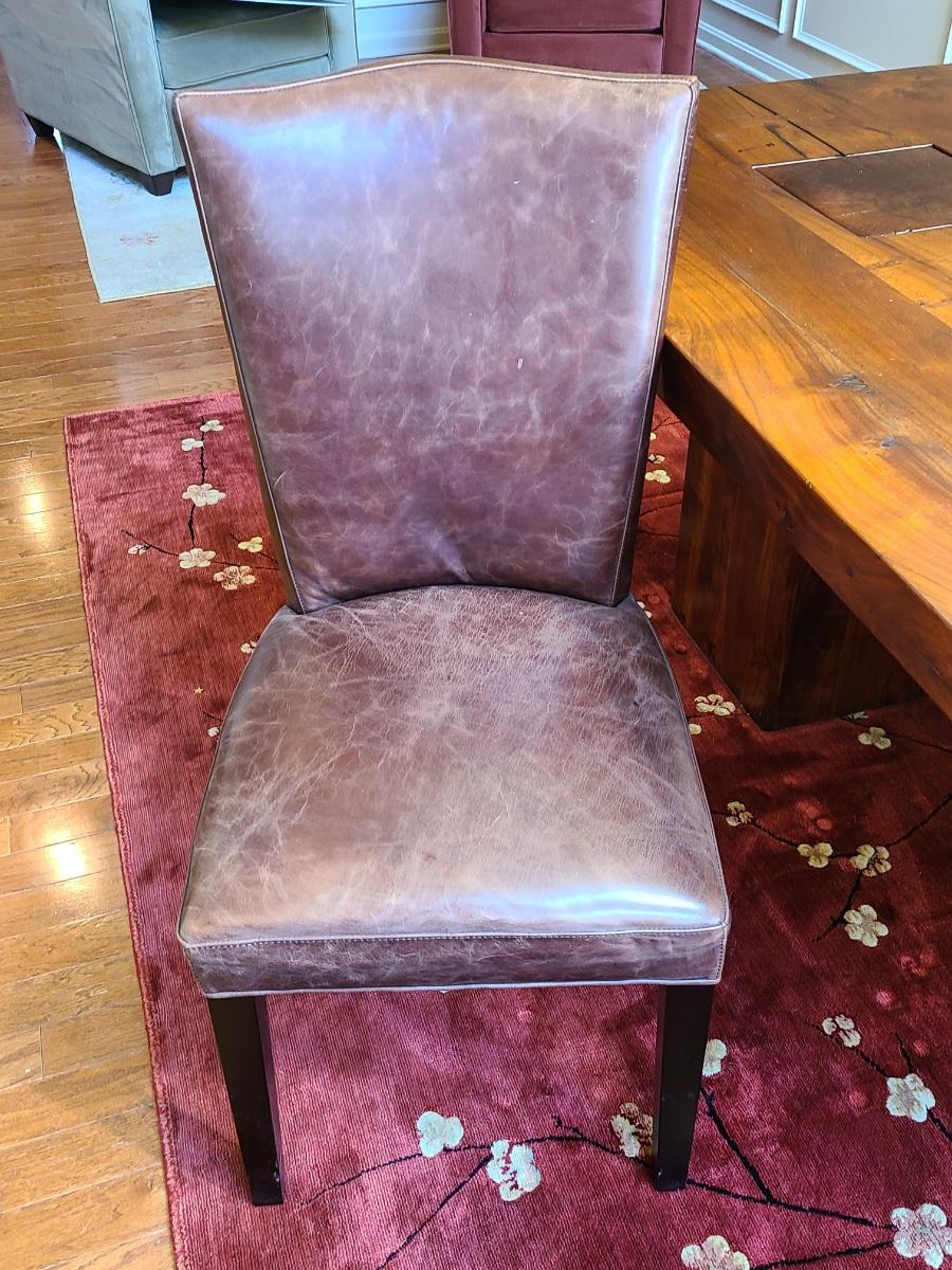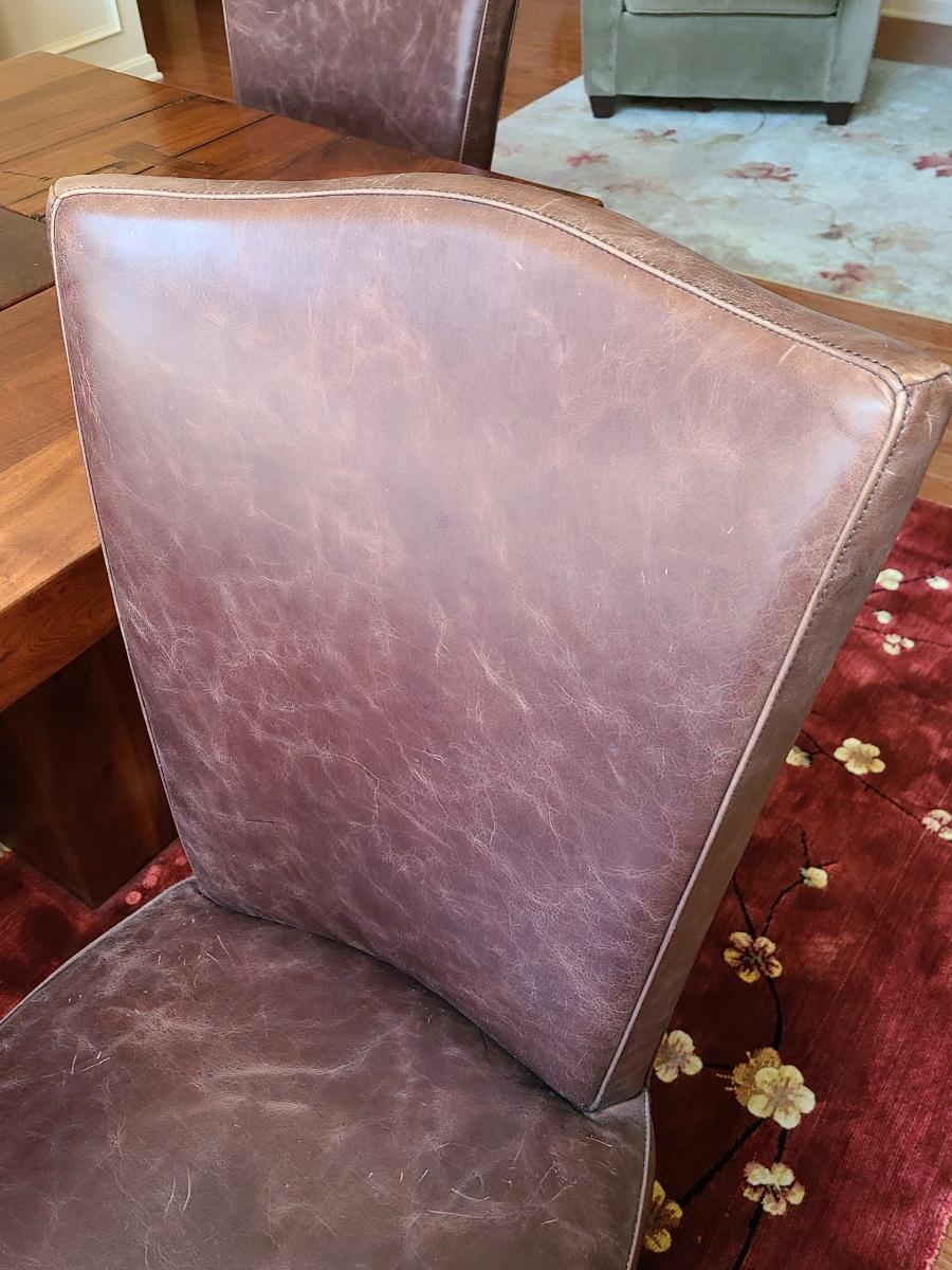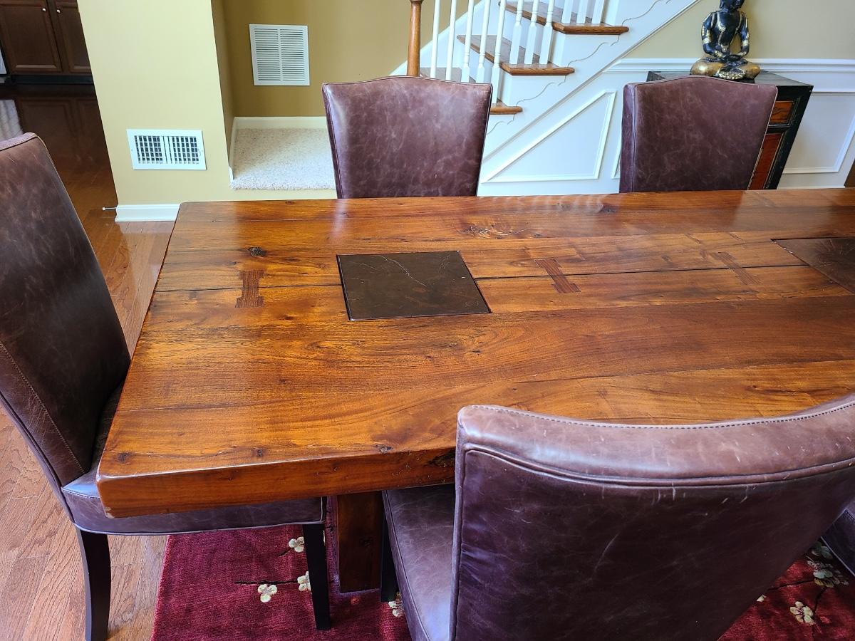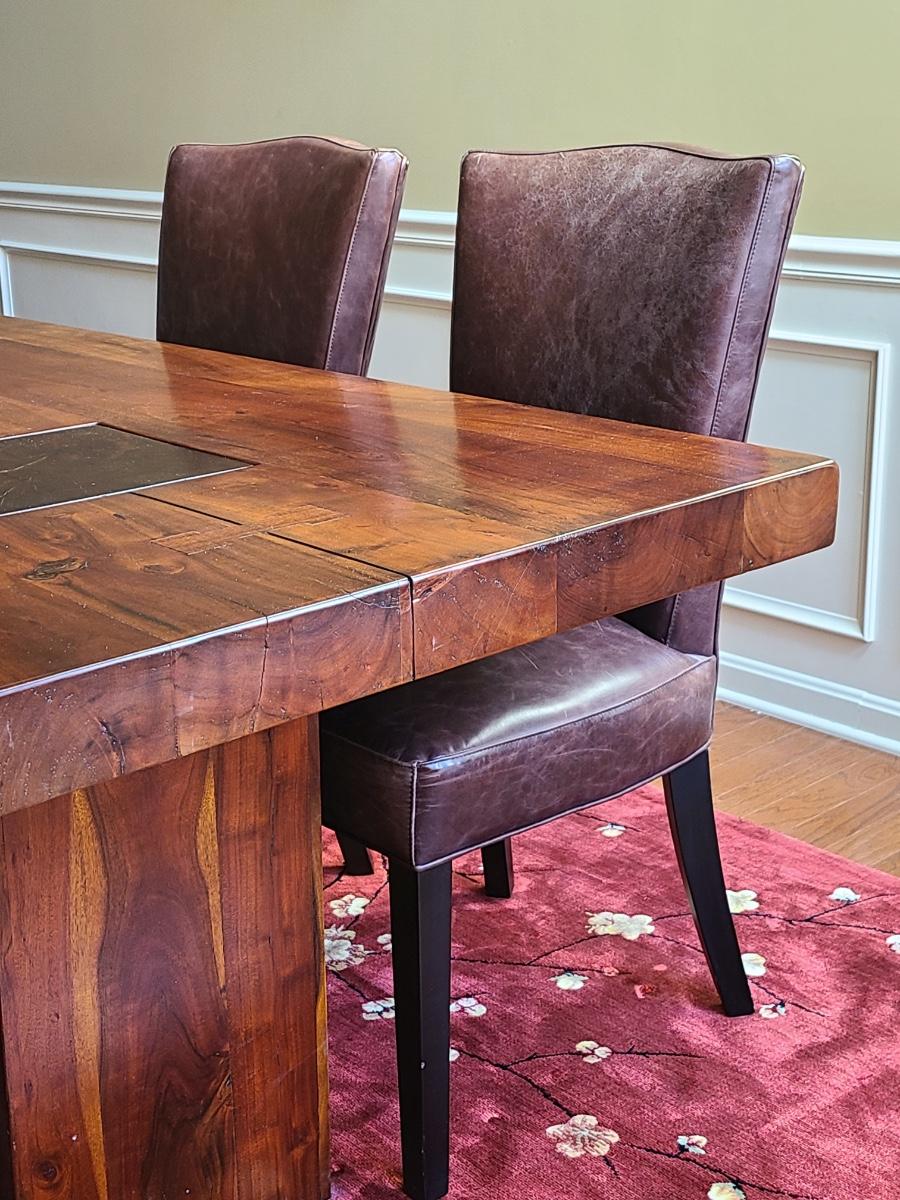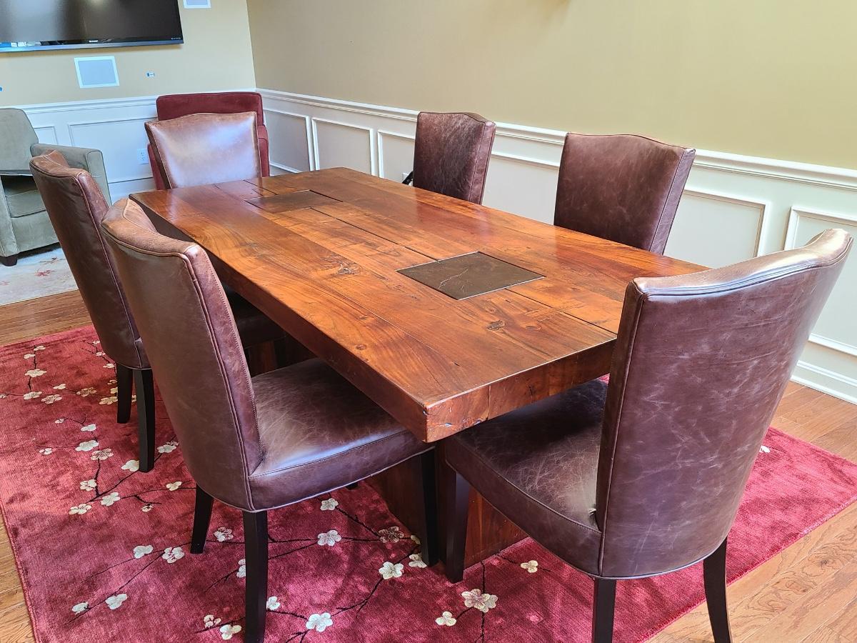 *now at its bottom line price! 30% off the already low price!* BUY NOW! Arhaus is known for exquisite design and custom craftsmanship. This is designer furniture that will last a lifetime. Stuning in design and function. 82x39x30 inches tall. 3 inch slab top. Comes apart in 3 pieces. Must bring help to move. Chairs are designed to have character scratches and markings. Can be leather reconditioned every so often if the owner chooses.