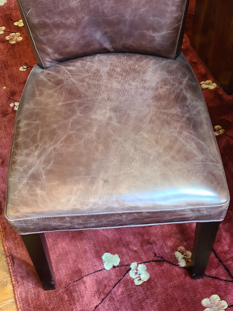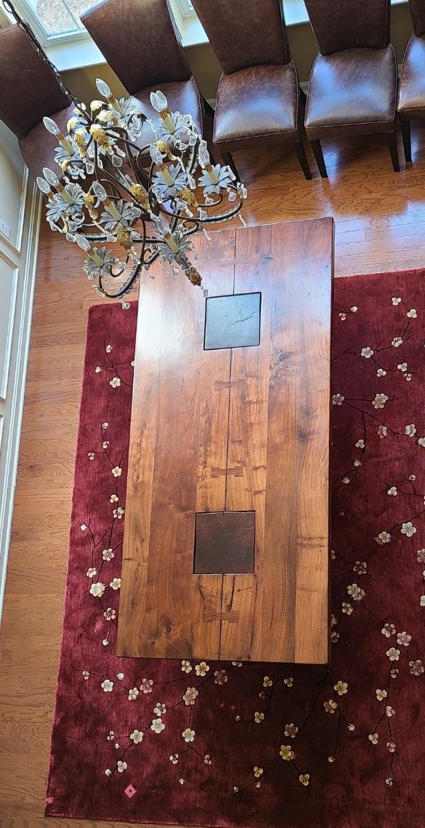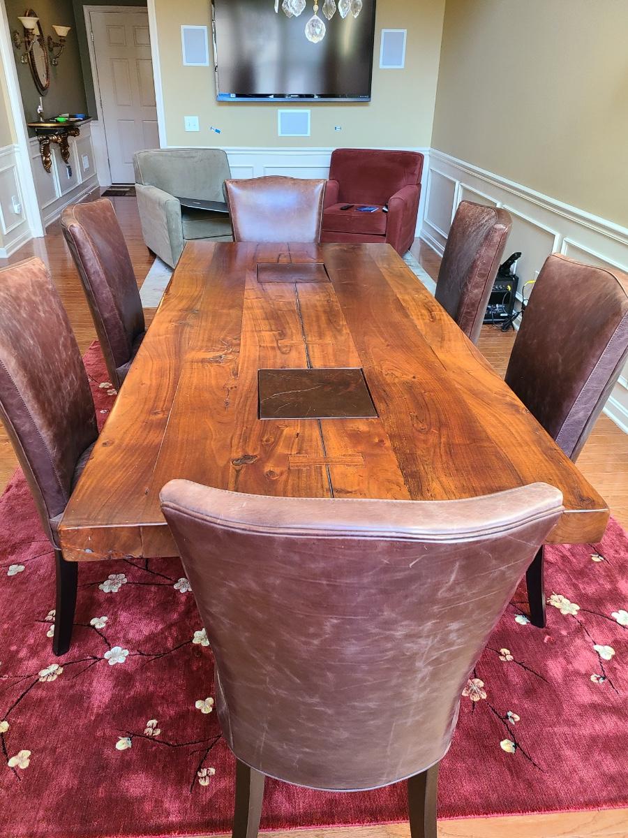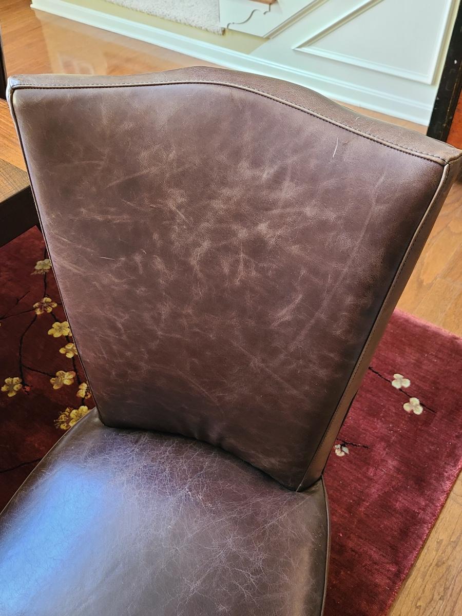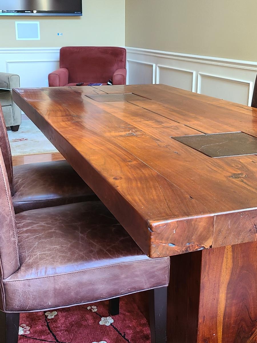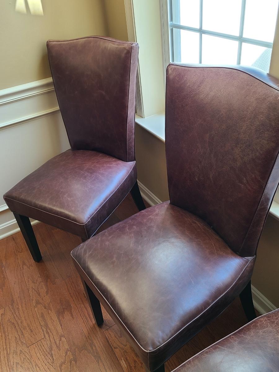 *now at its bottom line price! 30% off the already low price!* BUY NOW! Arhaus is known for exquisite design and custom craftsmanship. This is designer furniture that will last a lifetime. Stuning in design and function. 82x39x30 inches tall. 3 inch slab top. Comes apart in 3 pieces. Must bring help to move. Chairs are designed to have character scratches and markings. Can be leather reconditioned every so often if the owner chooses.
