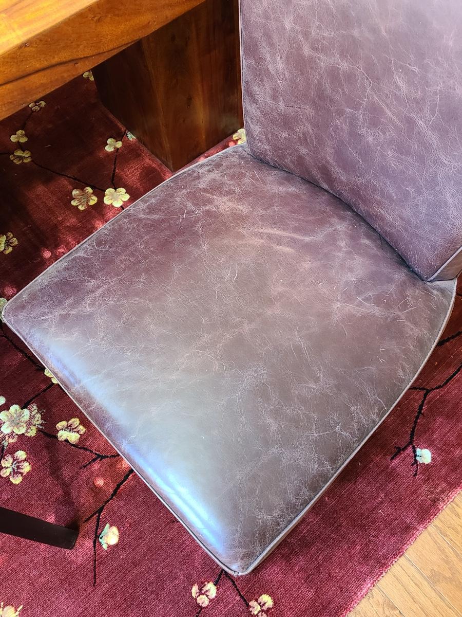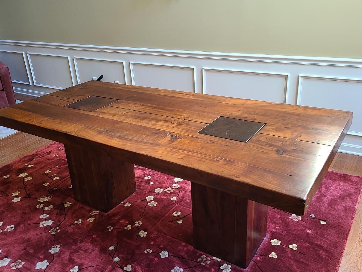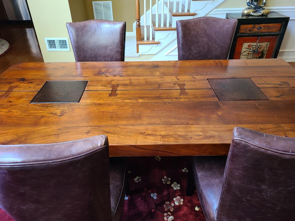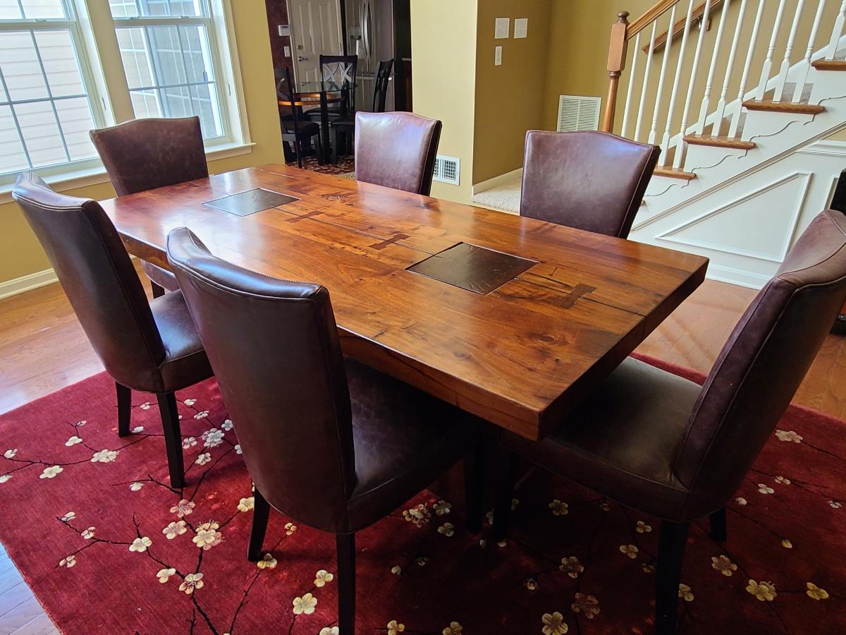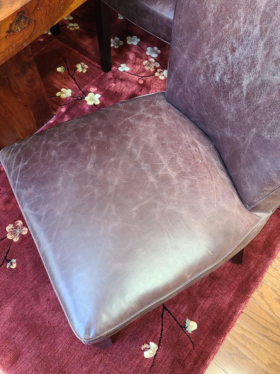 *now at its bottom line price! 30% off the already low price!* BUY NOW! Arhaus is known for exquisite design and custom craftsmanship. This is designer furniture that will last a lifetime. Stuning in design and function. 82x39x30 inches tall. 3 inch slab top. Comes apart in 3 pieces. Must bring help to move. Chairs are designed to have character scratches and markings. Can be leather reconditioned every so often if the owner chooses.