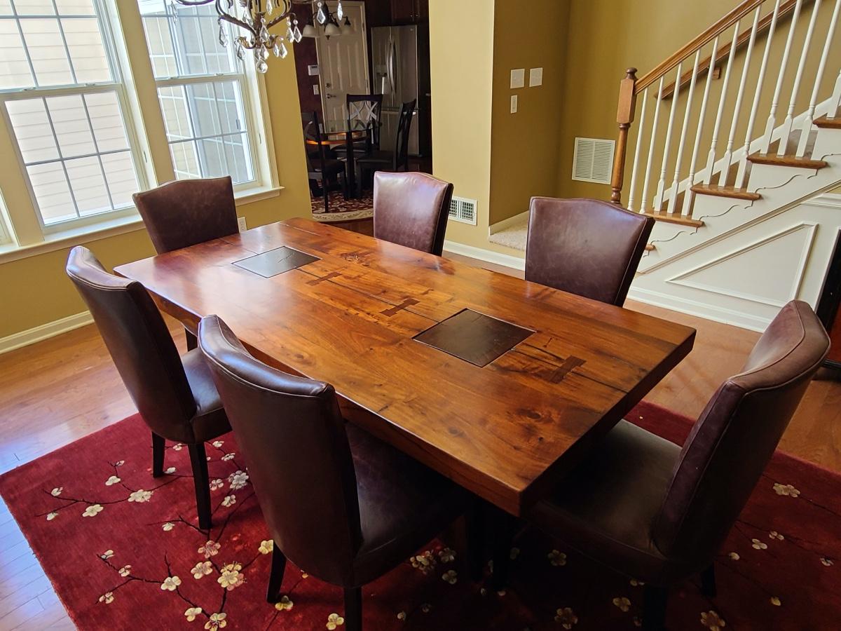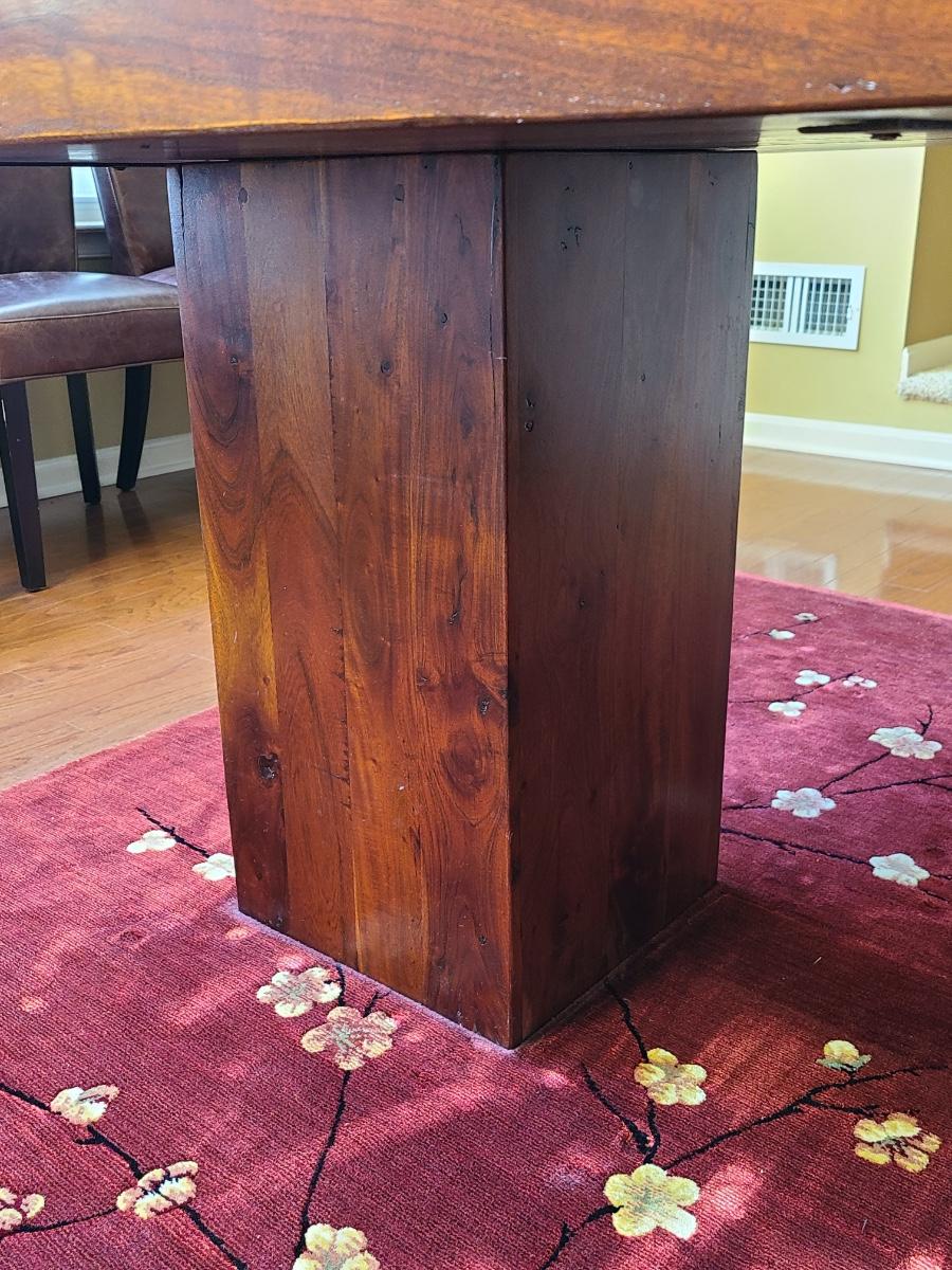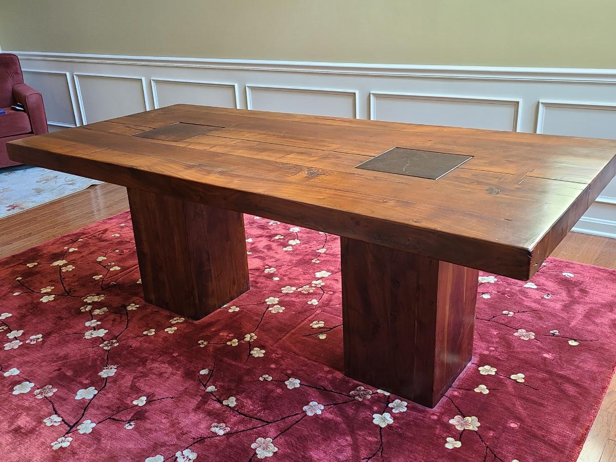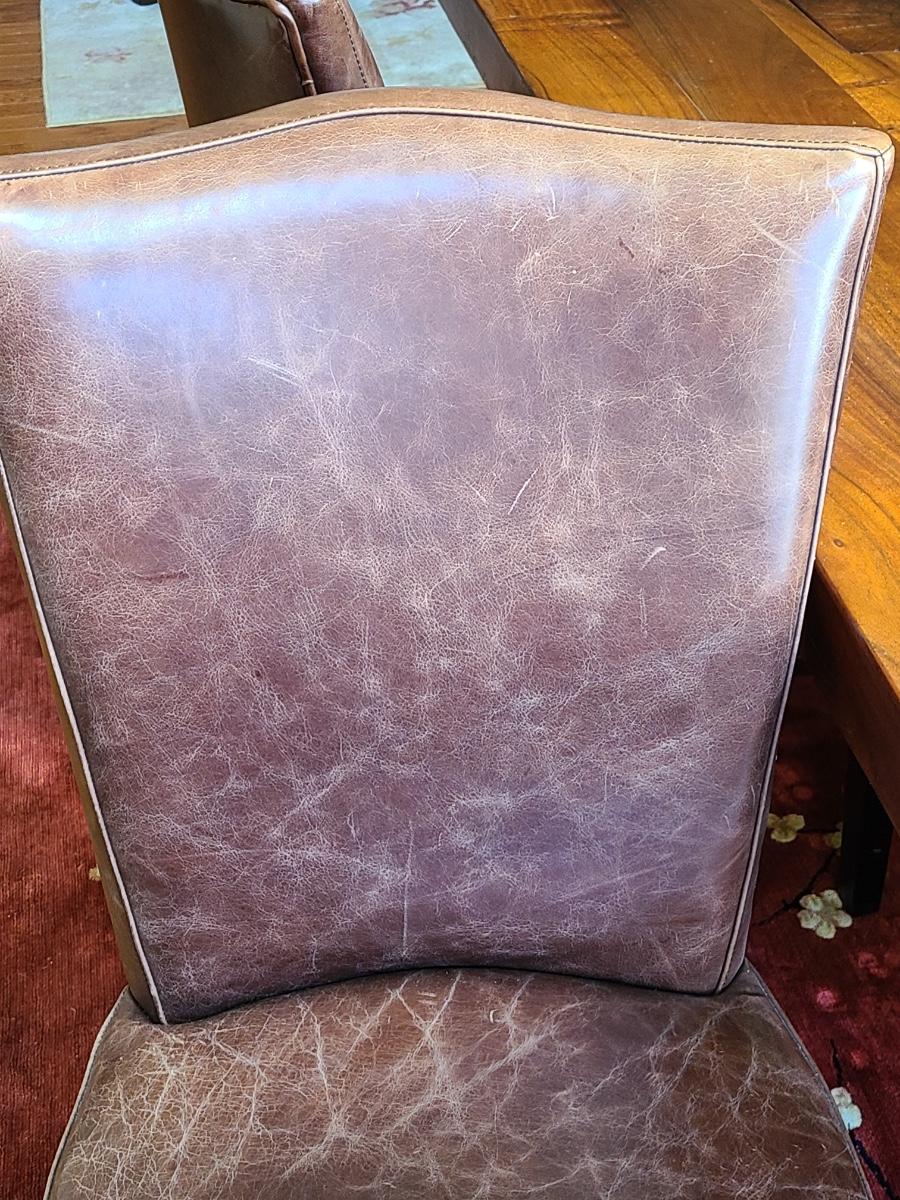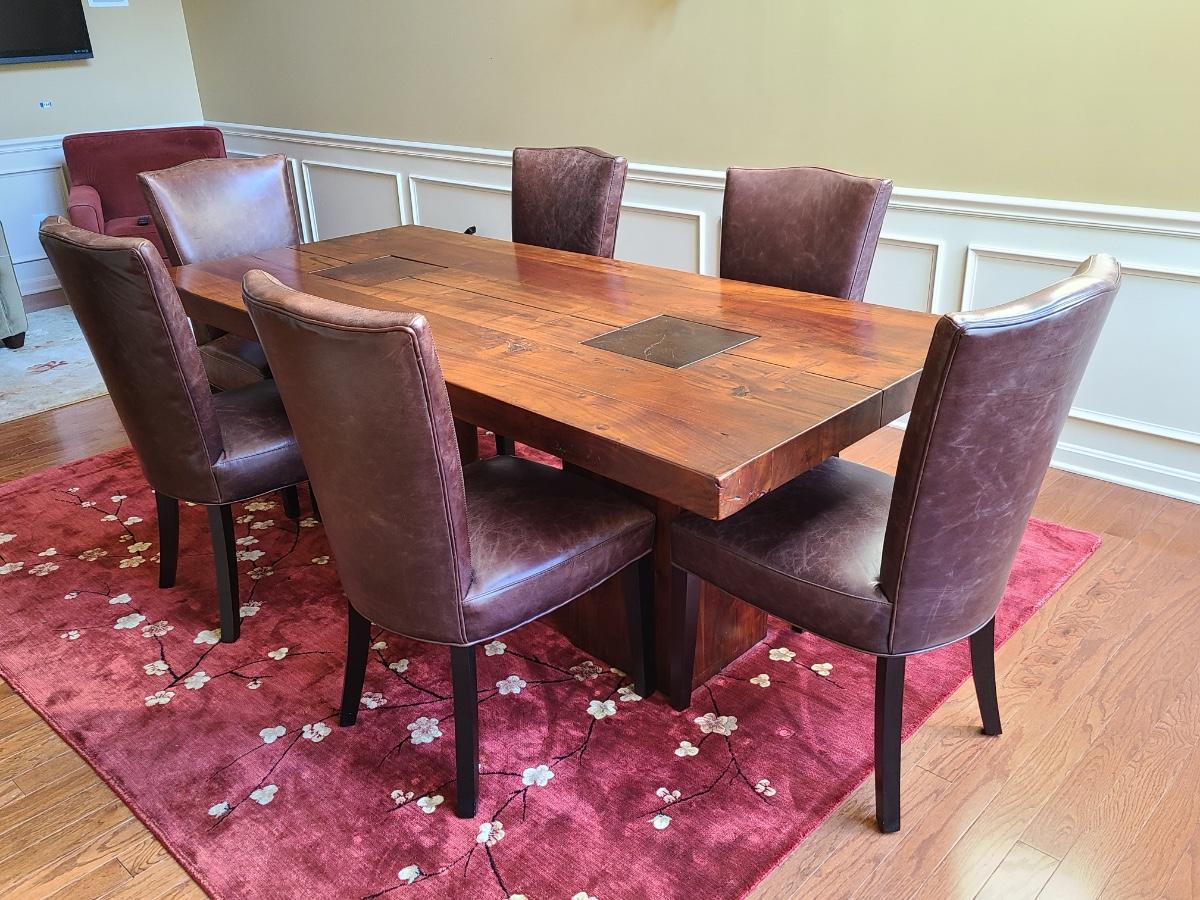 Lot 22: Arhaus Aiden Distressed Leather Dining Chairs and Double Pedestal Slab Table Retail $5000.00