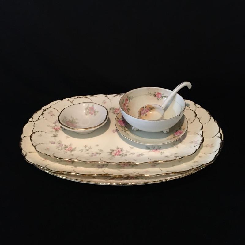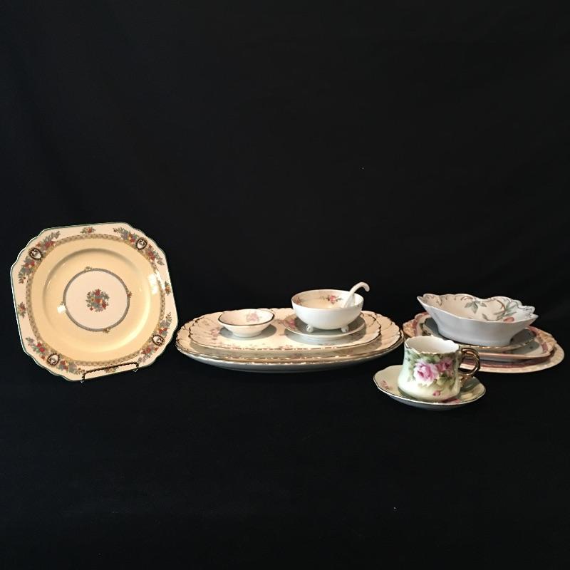 Array of China includes Mikasa Bone China, Popegosser China, Crescentware, hand painted Nippon China, Walker China, Wedgewood and Lefton China, see pictures. Largest platter measures 1.5” x 15”.