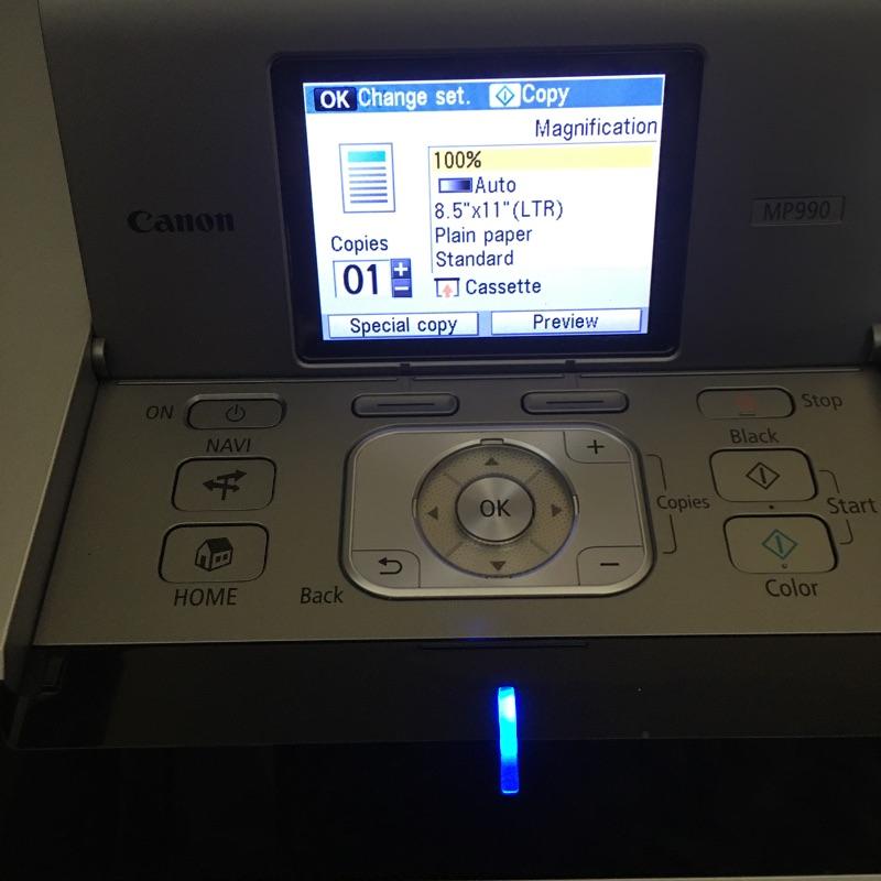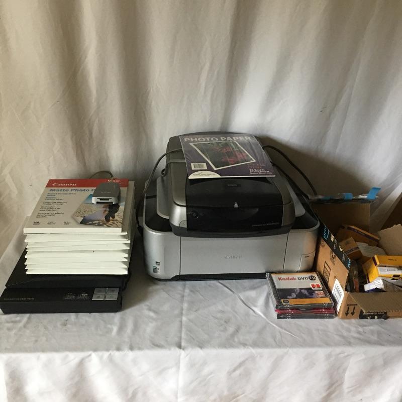 Canon printer and more. Lot includes Canon MP990 printer, Epson G860B and V300 scanners, photo paper and ink for printer. Printer and scanners all powered on when tested.