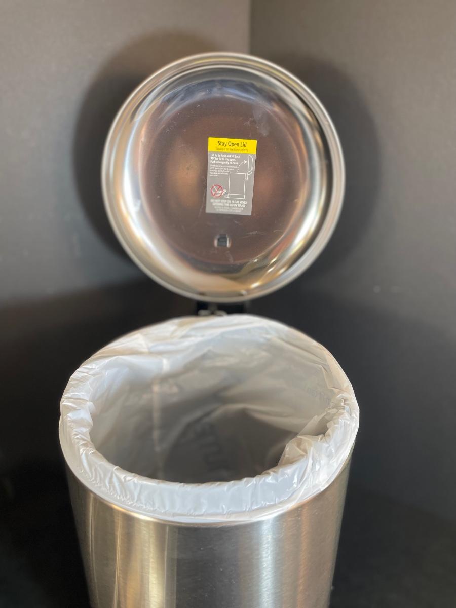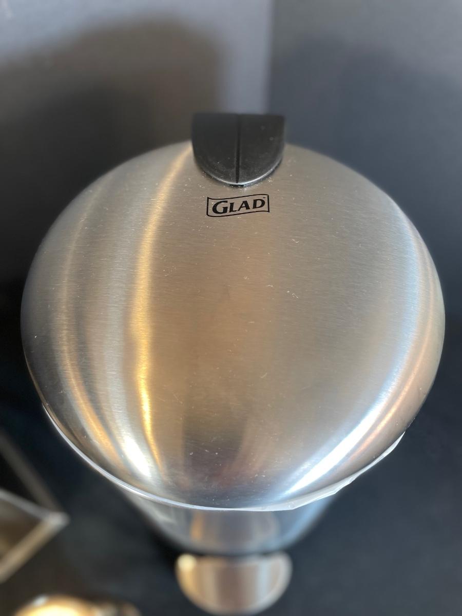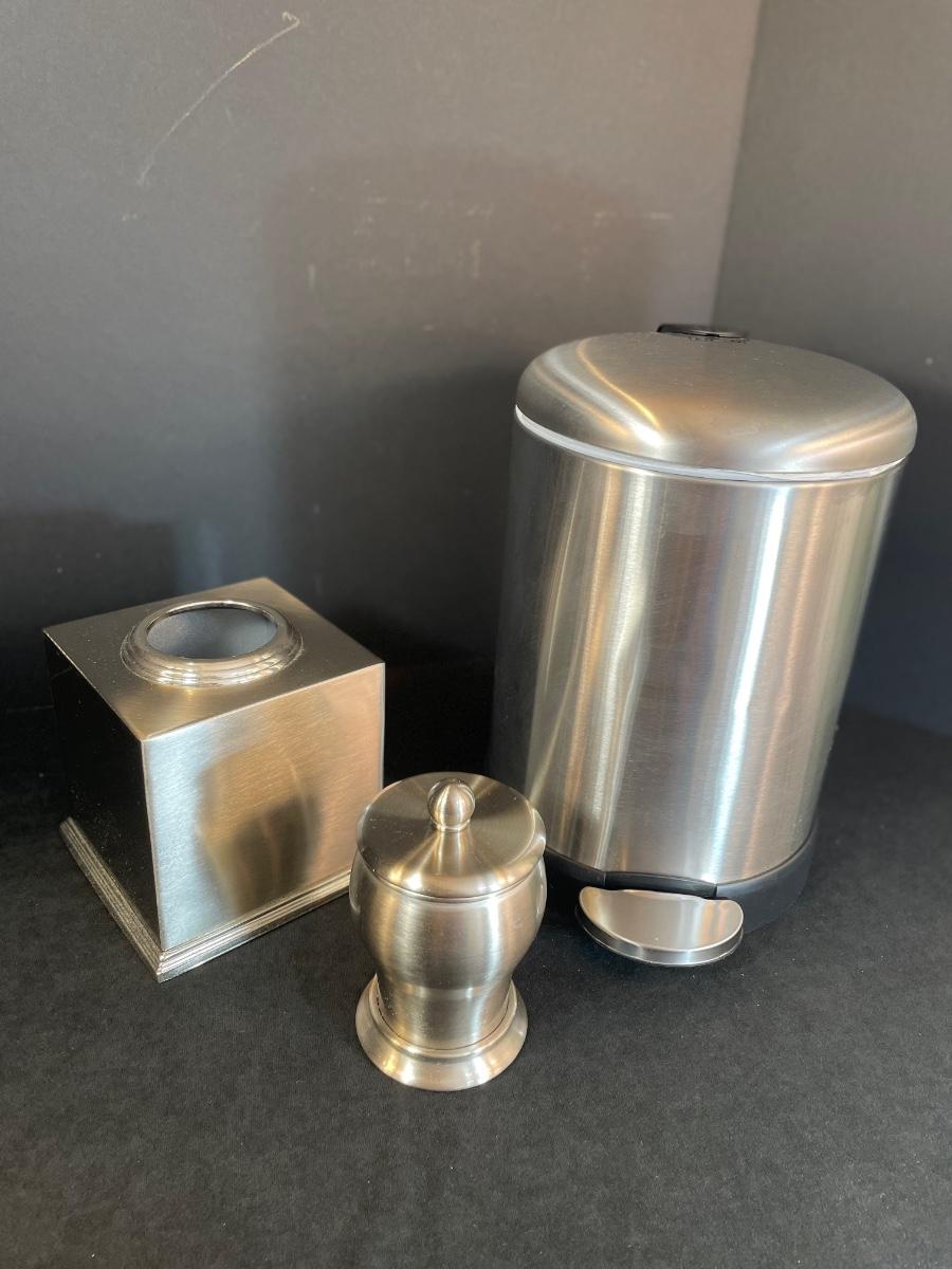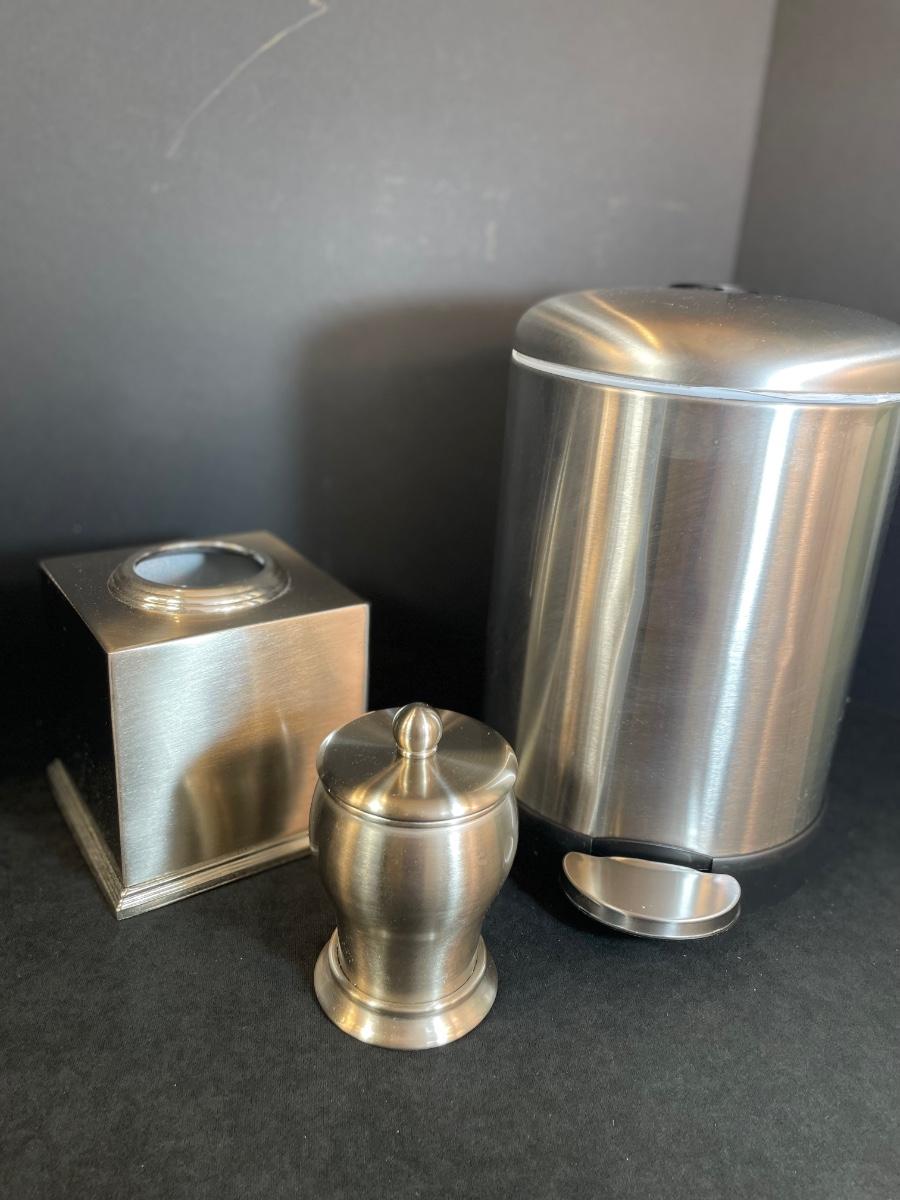 3-piece Brushed nickel step trash can, cup and soap dish