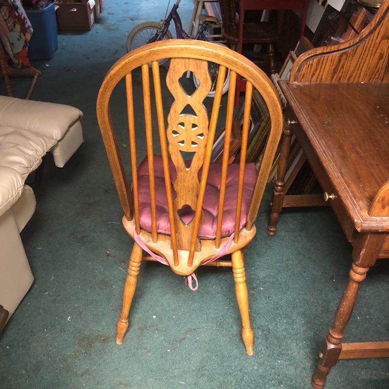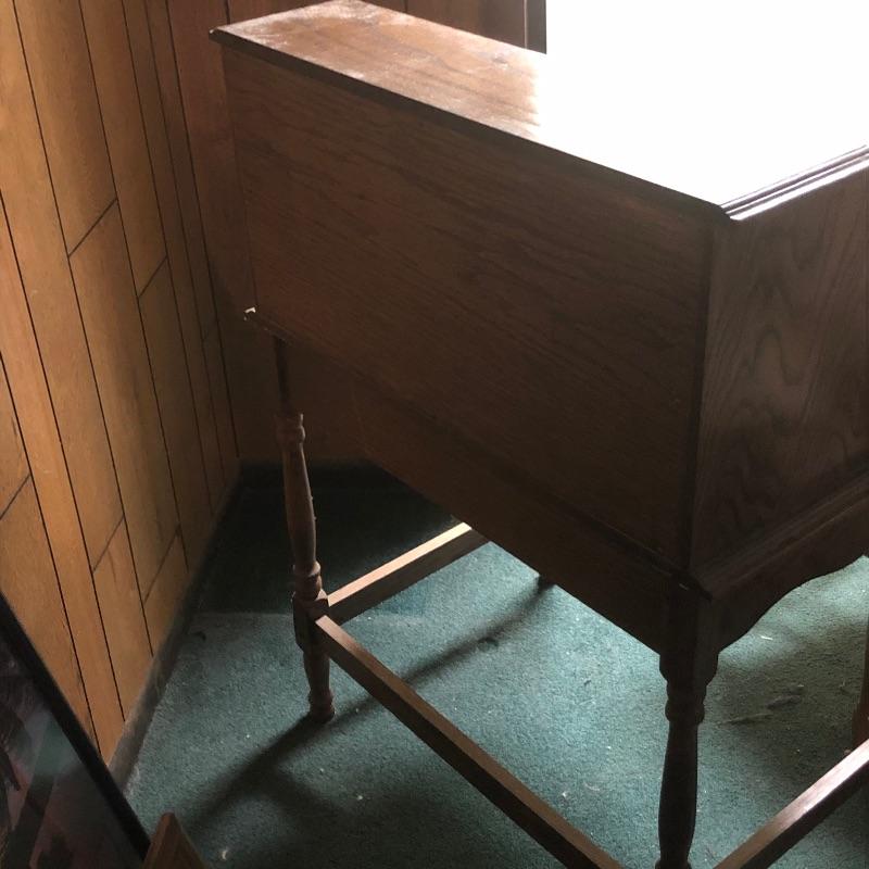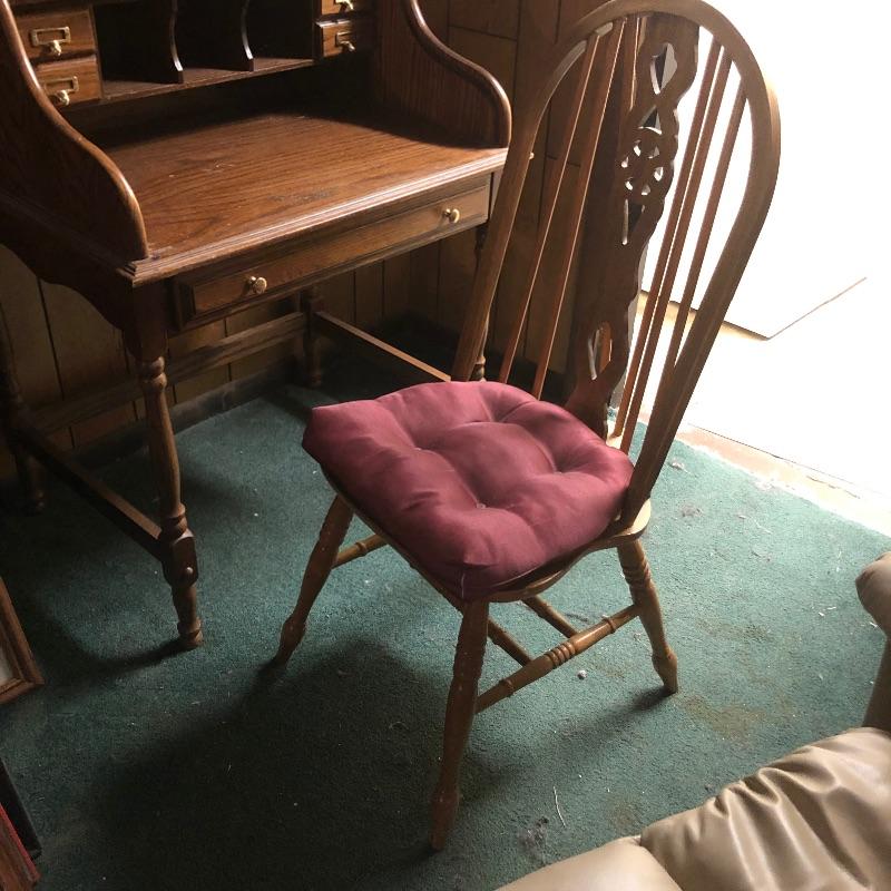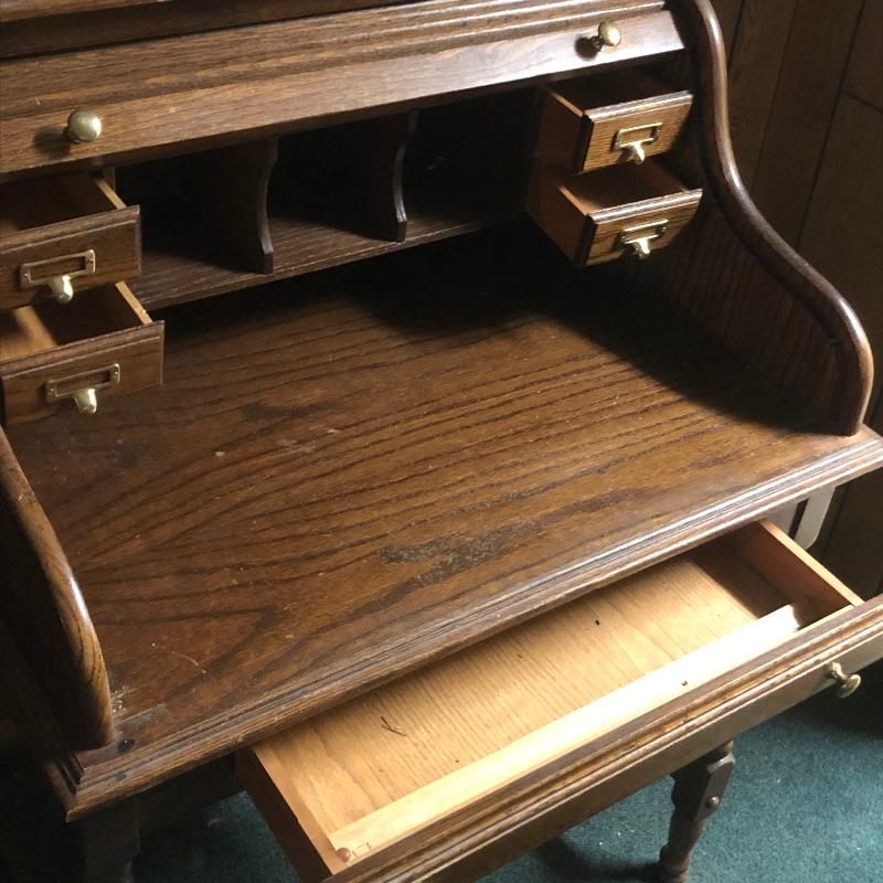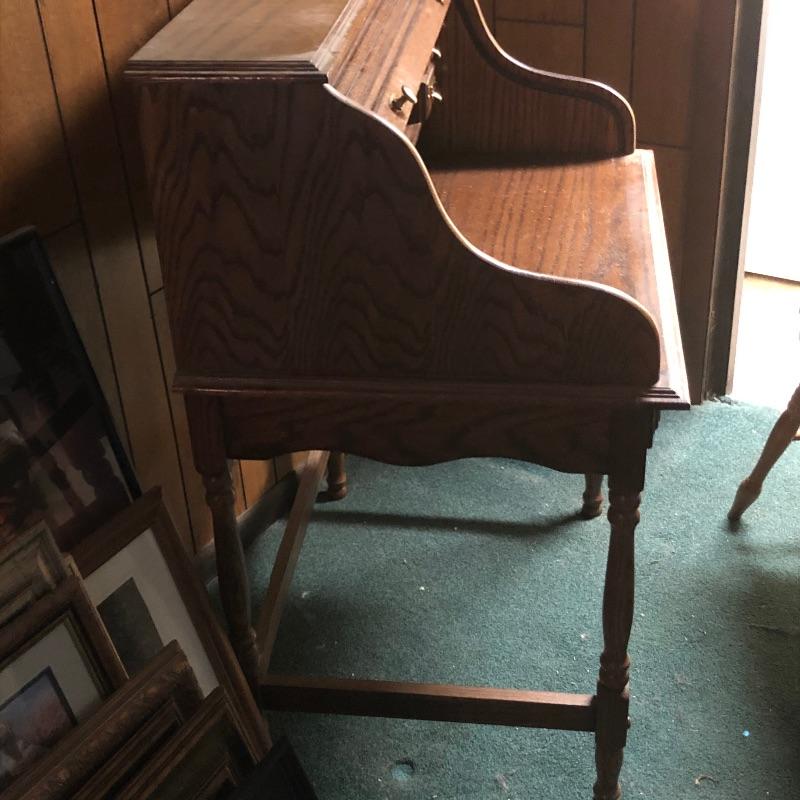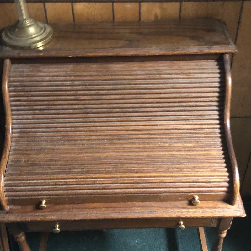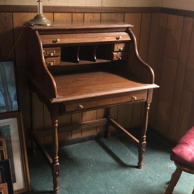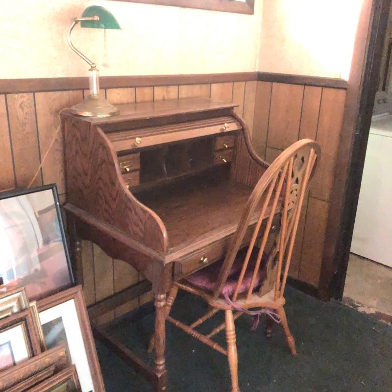 We have paired this chair with a small roll top writing desk, spindle backed chair with a removable red seat cushion and a bankers lamp. The desk is a great size that is very functional without taking up too much space. There are a few scratches on wood. It measures 24” deep x 32” wide x 43” tall.