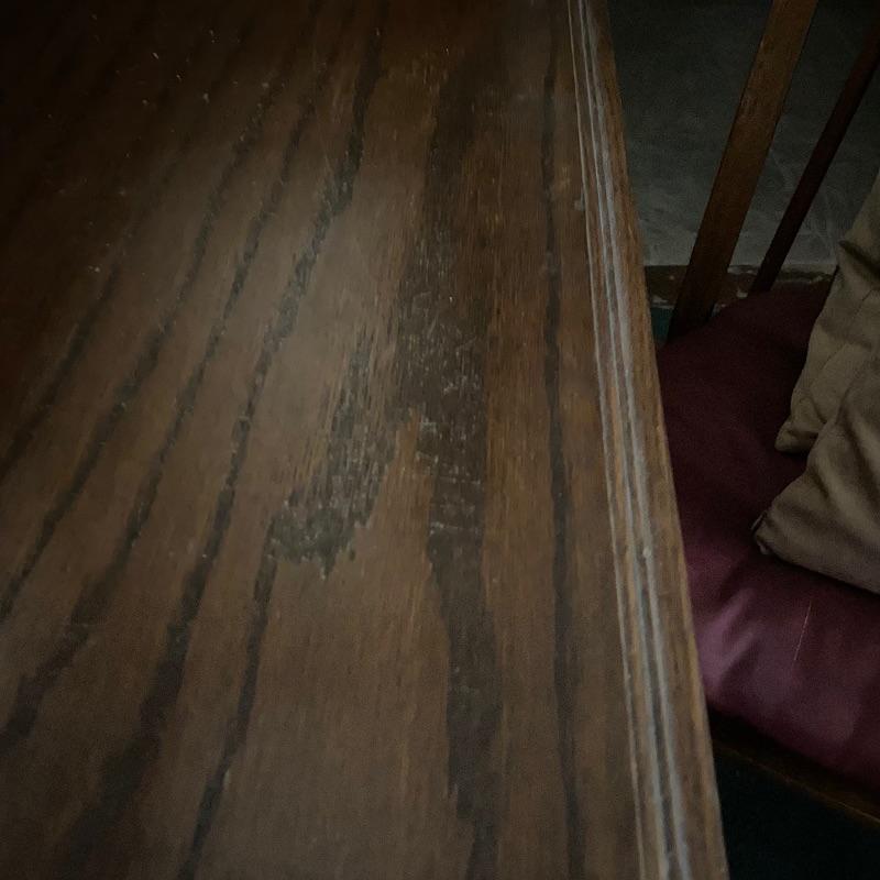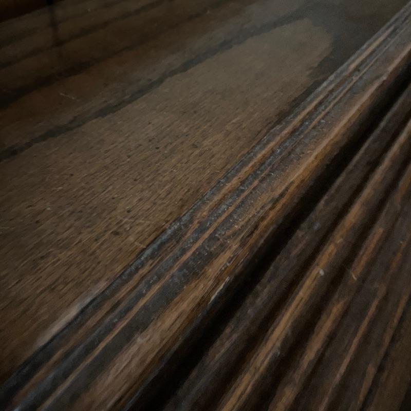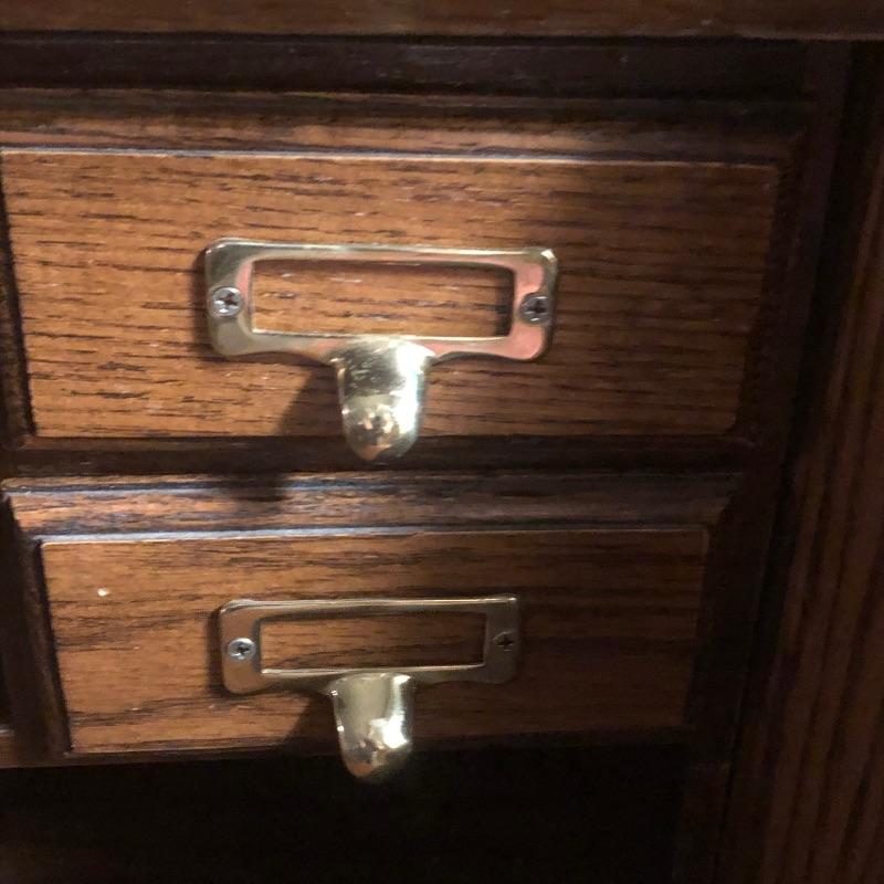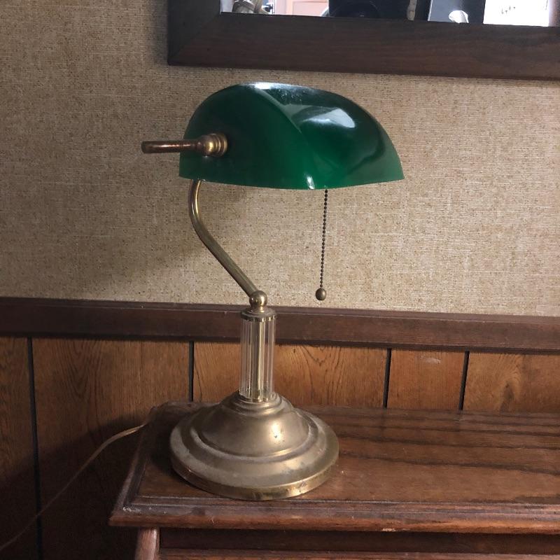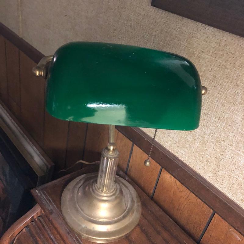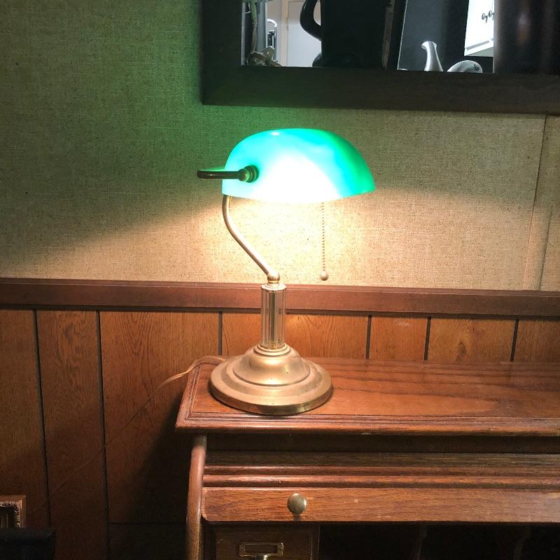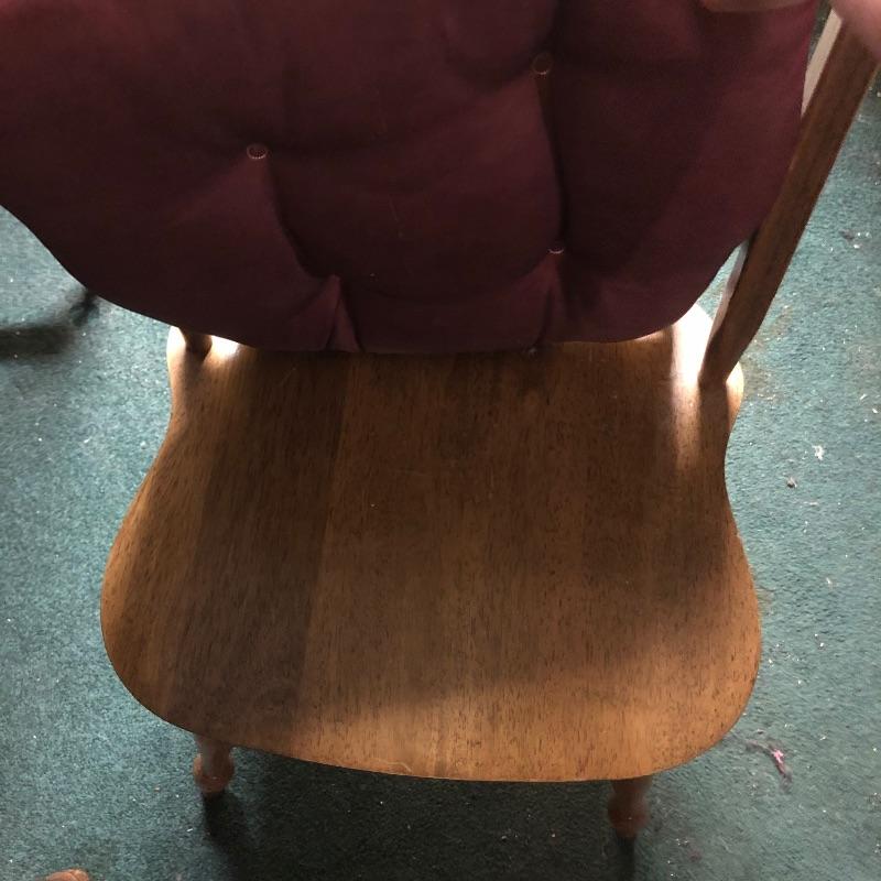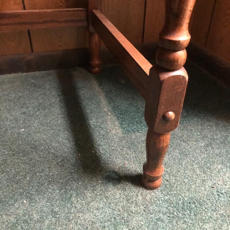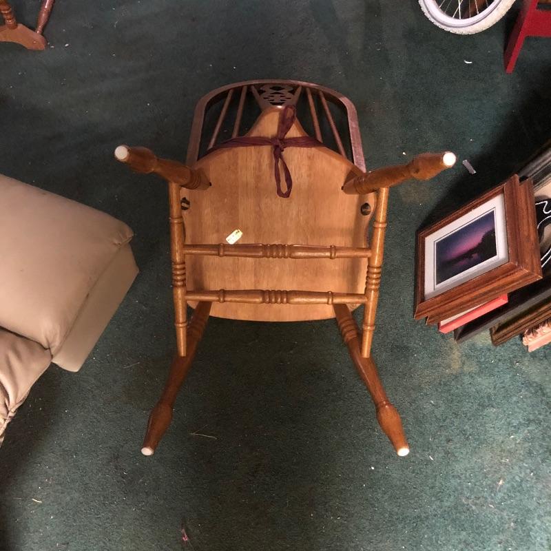 We have paired this chair with a small roll top writing desk, spindle backed chair with a removable red seat cushion and a bankers lamp. The desk is a great size that is very functional without taking up too much space. There are a few scratches on wood. It measures 24” deep x 32” wide x 43” tall.