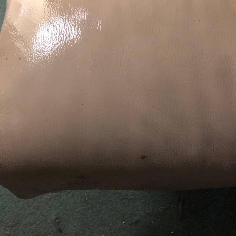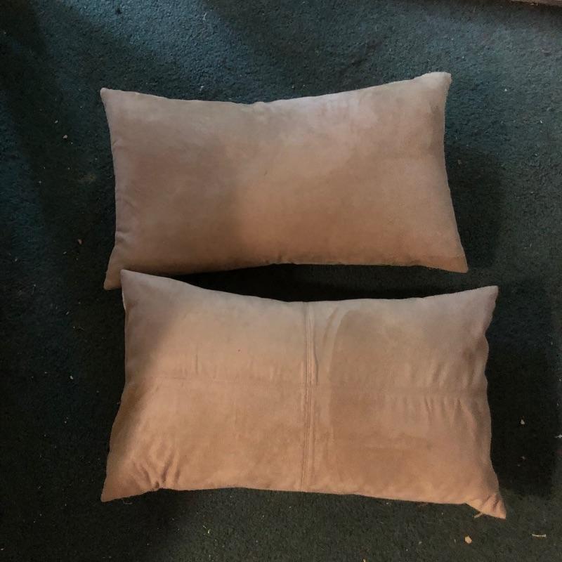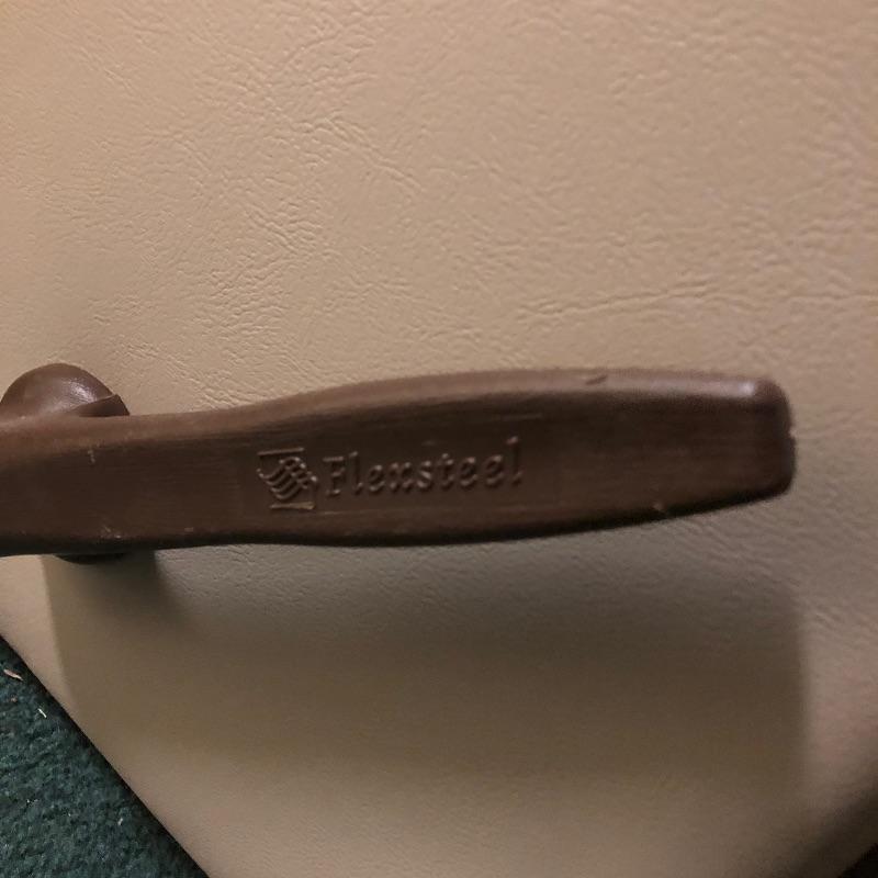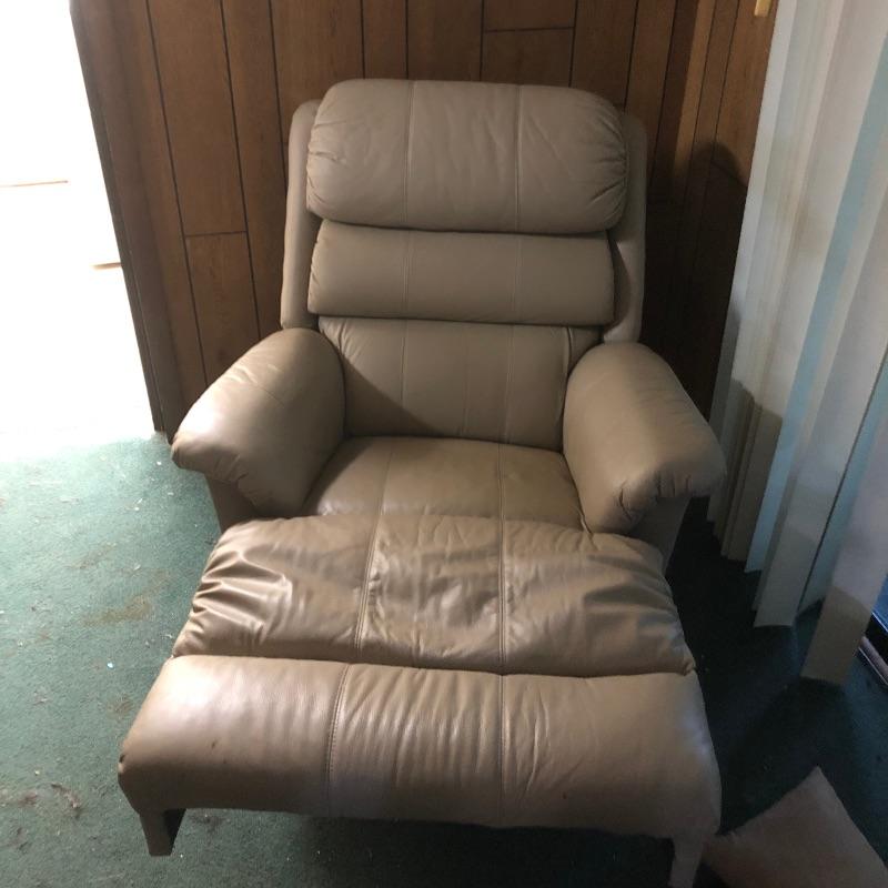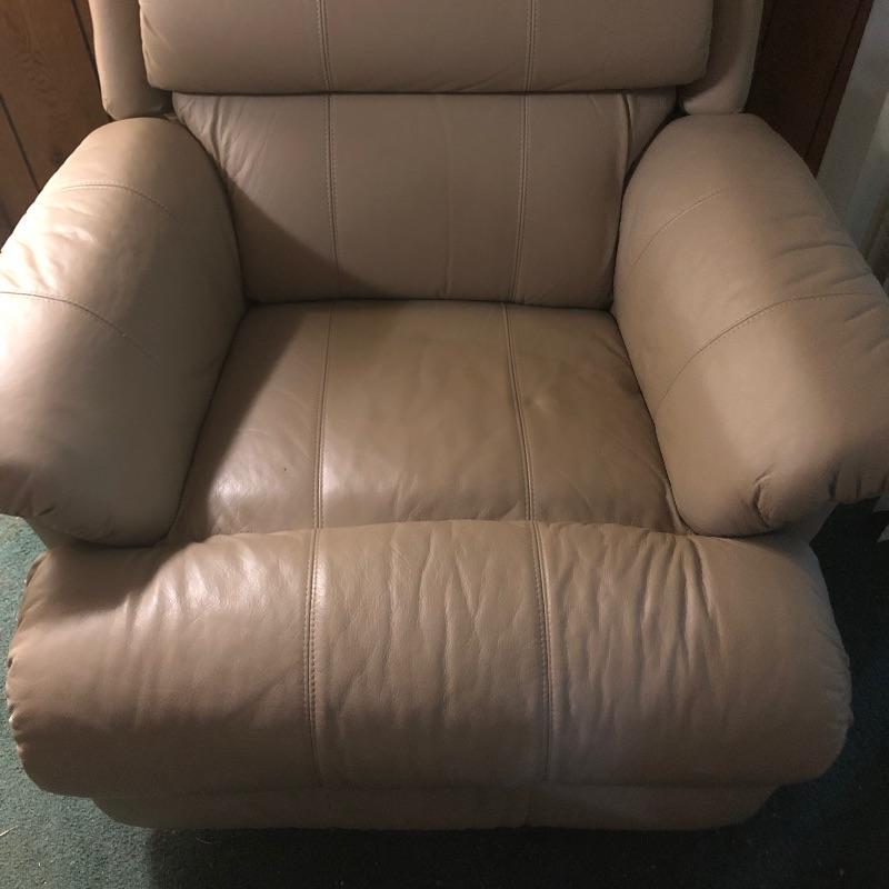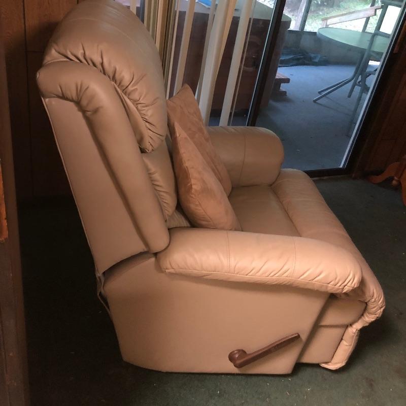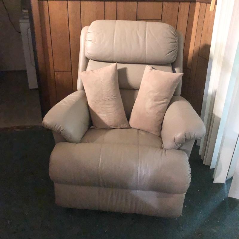 Our title doesn’t lie, this is one very comfortable recliner! It’s a manual operation with a smooth transition. The lever says Flexsteel. It’s a very practical light tan color that will go well with any decor. Looks and feels like leather but can’t verify. There are a few small marks on the footrest that appear to be just dirt. It also comes with two suede tan pillows. Approximate chair measurements are 37” deep x 35” wide x 40” tall. Foot rest adds an additional 22” when extended.