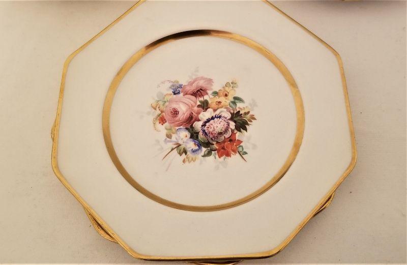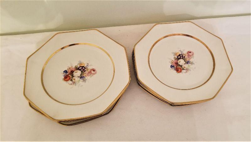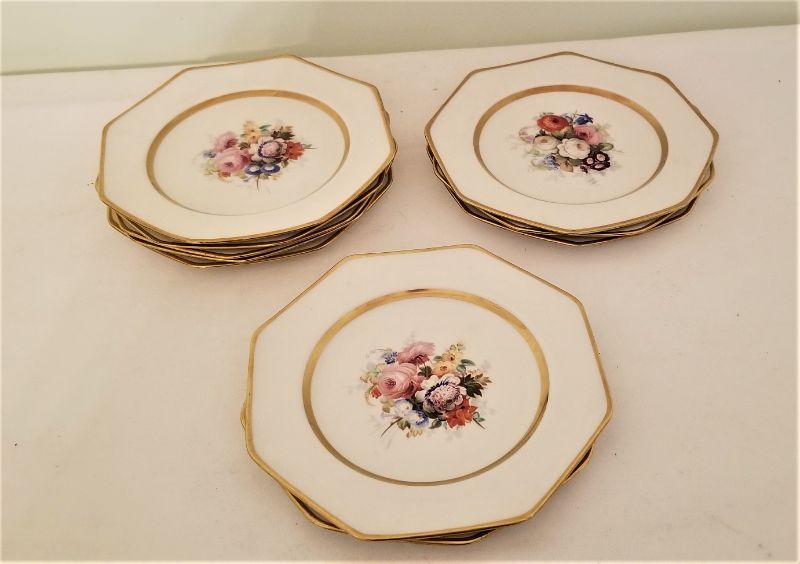 There are 11 dessert plates and 10 matching Dinner plates - Johnson Bros. (England) - late 19th century. Pretty and vivid floral design. Gold rims. Octagonal shape. A few have a bit of age related crazing. Dessert plates are 6.5" across - dinner plates are in good condition and are 9.75" across. 21 pieces in all.