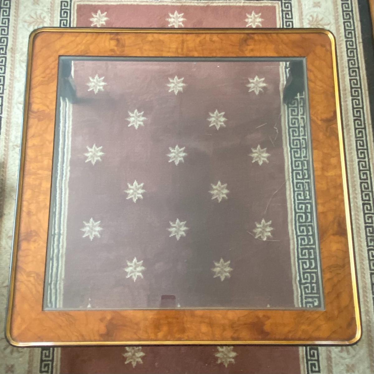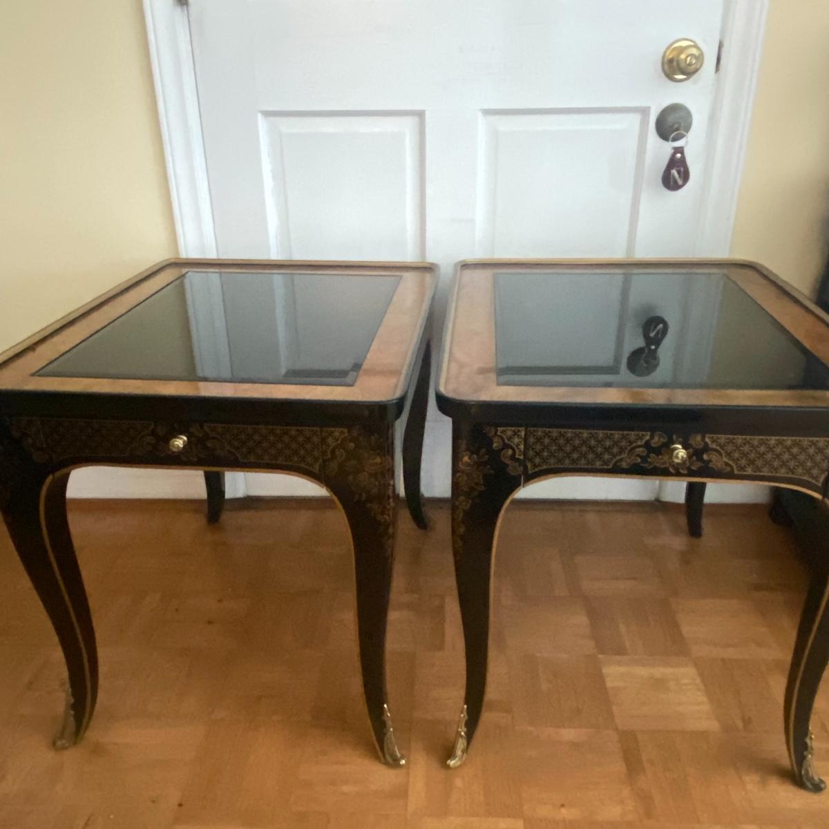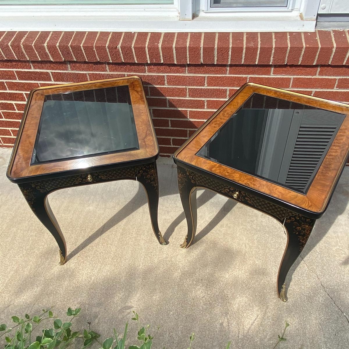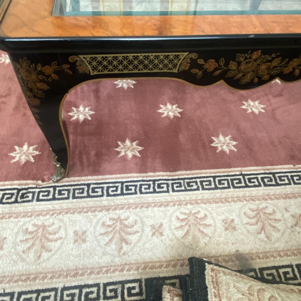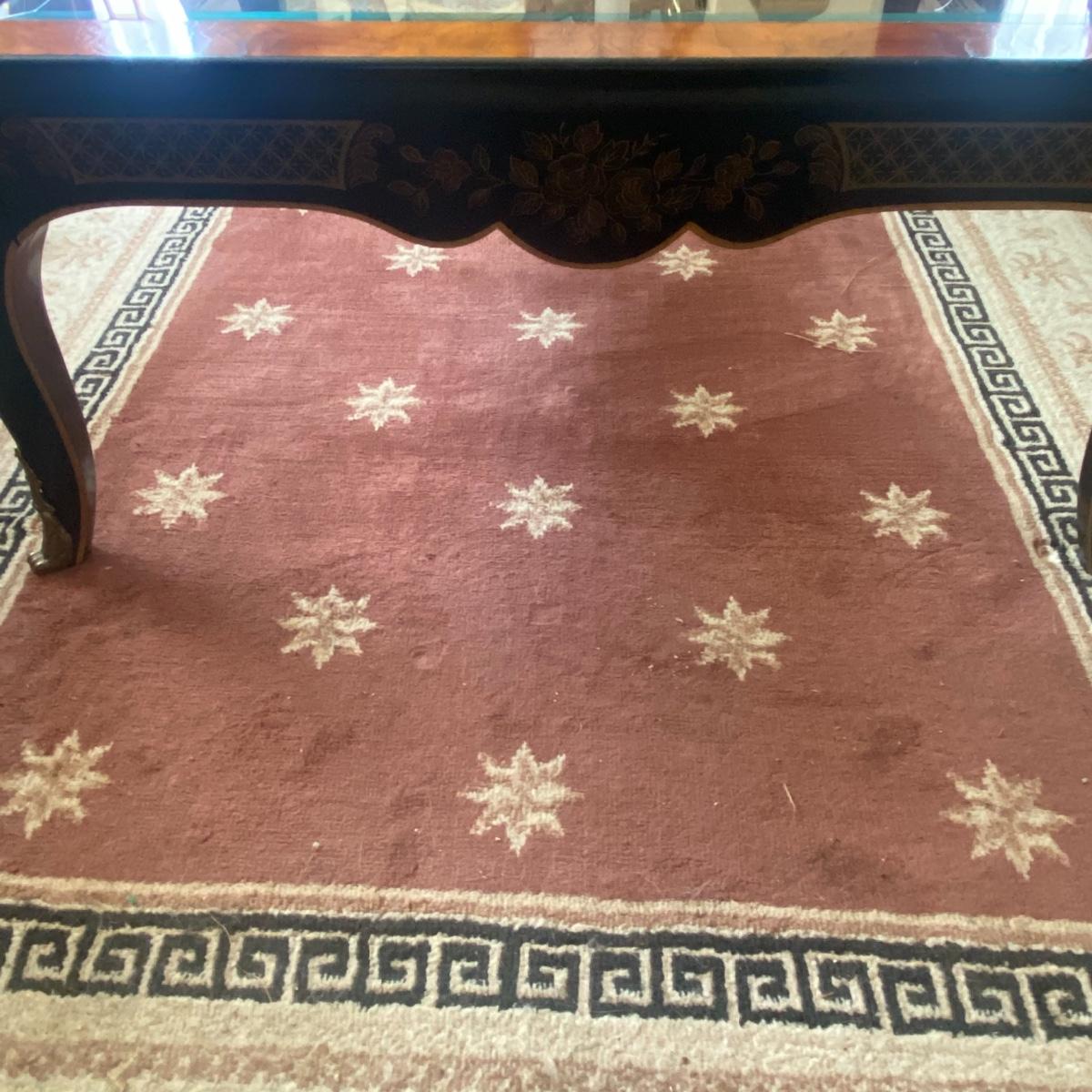 Lot includes beautiful Drexel furniture set! Coffee table with glass top insert and wood details measures out to 36”x36”x16”. Coffee table and two side tables have matching all black legs and floral and golden designs, see photos. Side tables with an all black glass top insert measures out to be 20.5”x26”x23”. See photos. Local pickup only.