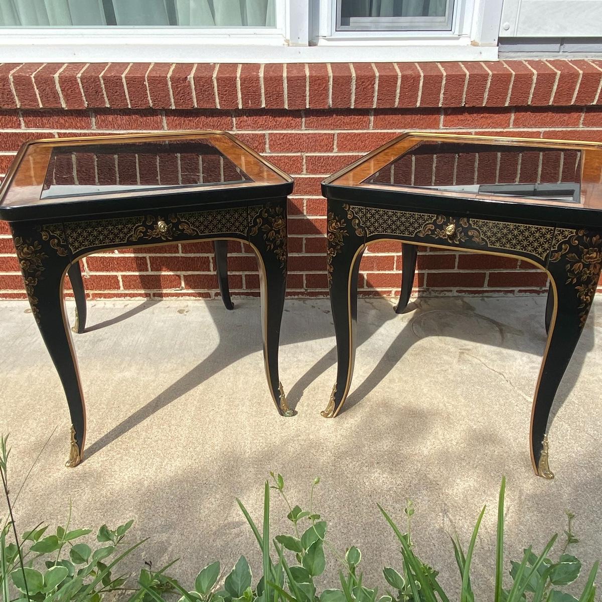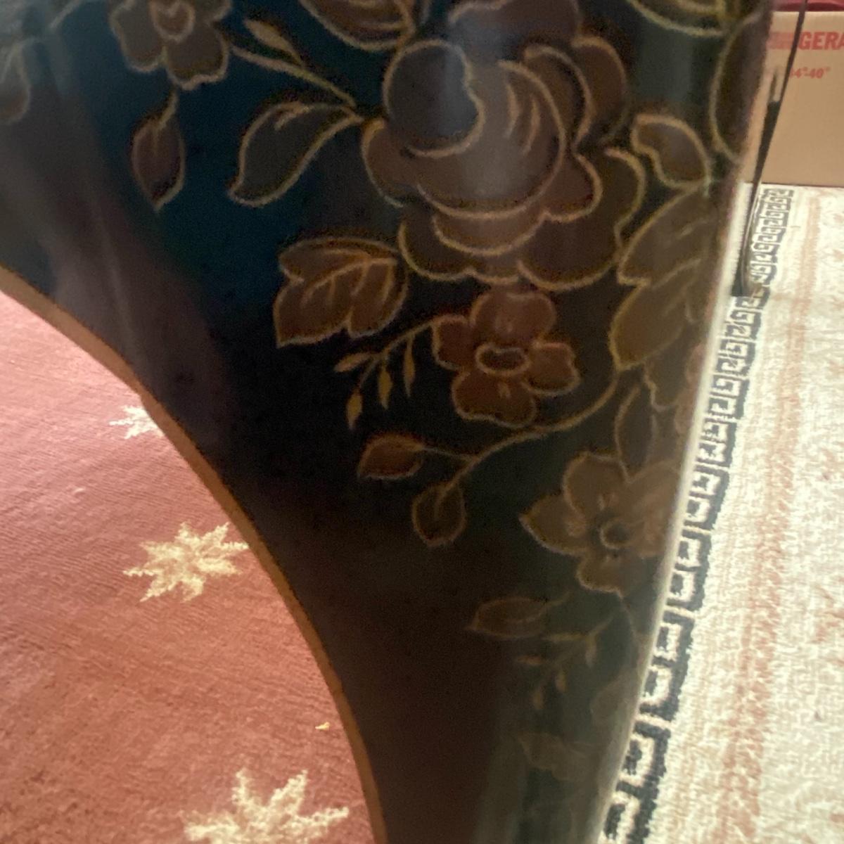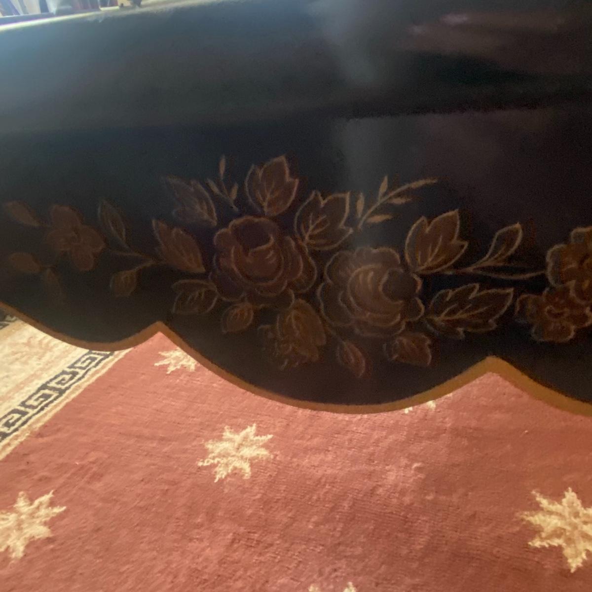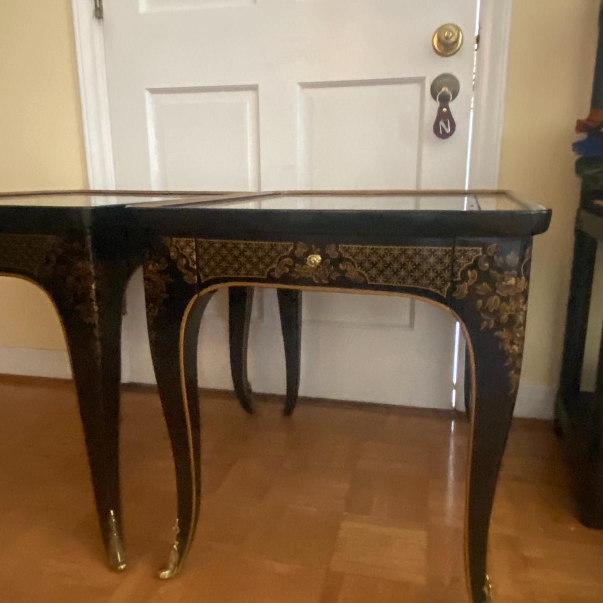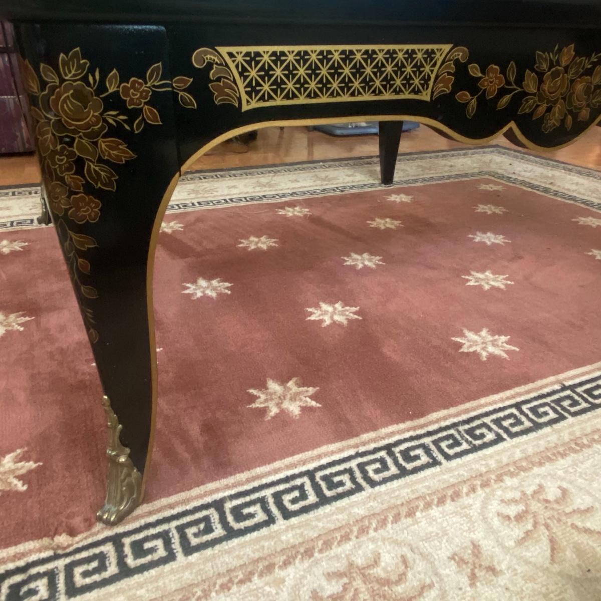 Lot includes beautiful Drexel furniture set! Coffee table with glass top insert and wood details measures out to 36”x36”x16”. Coffee table and two side tables have matching all black legs and floral and golden designs, see photos. Side tables with an all black glass top insert measures out to be 20.5”x26”x23”. See photos. Local pickup only.