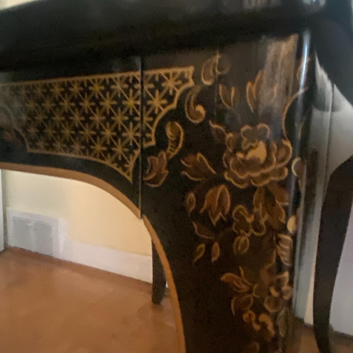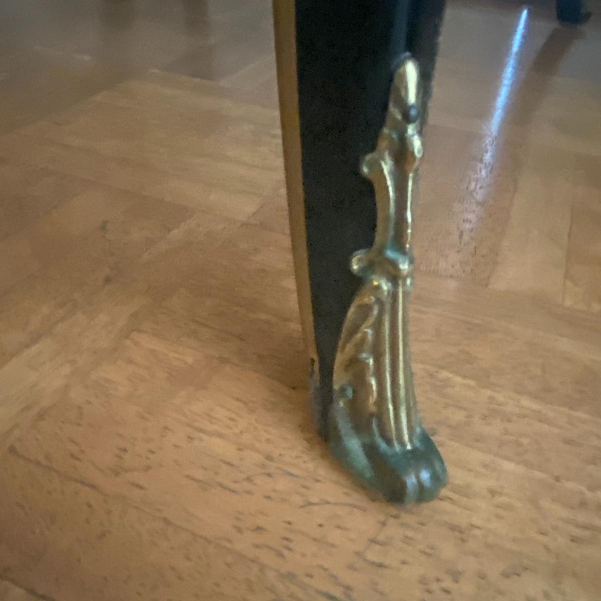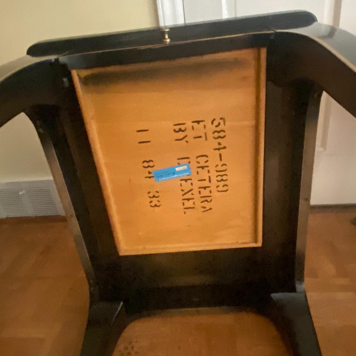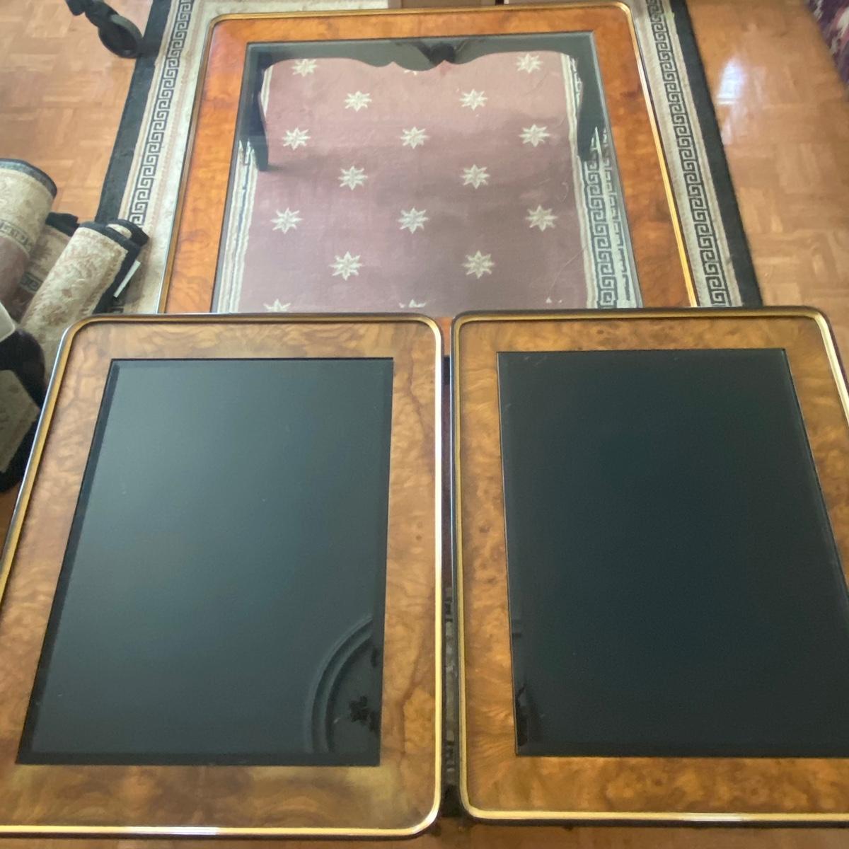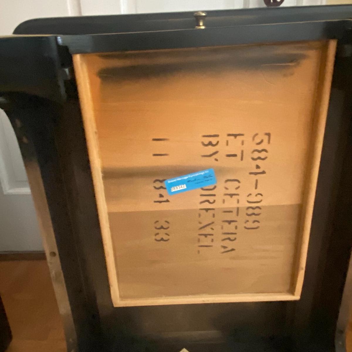 Lot includes beautiful Drexel furniture set! Coffee table with glass top insert and wood details measures out to 36”x36”x16”. Coffee table and two side tables have matching all black legs and floral and golden designs, see photos. Side tables with an all black glass top insert measures out to be 20.5”x26”x23”. See photos. Local pickup only.