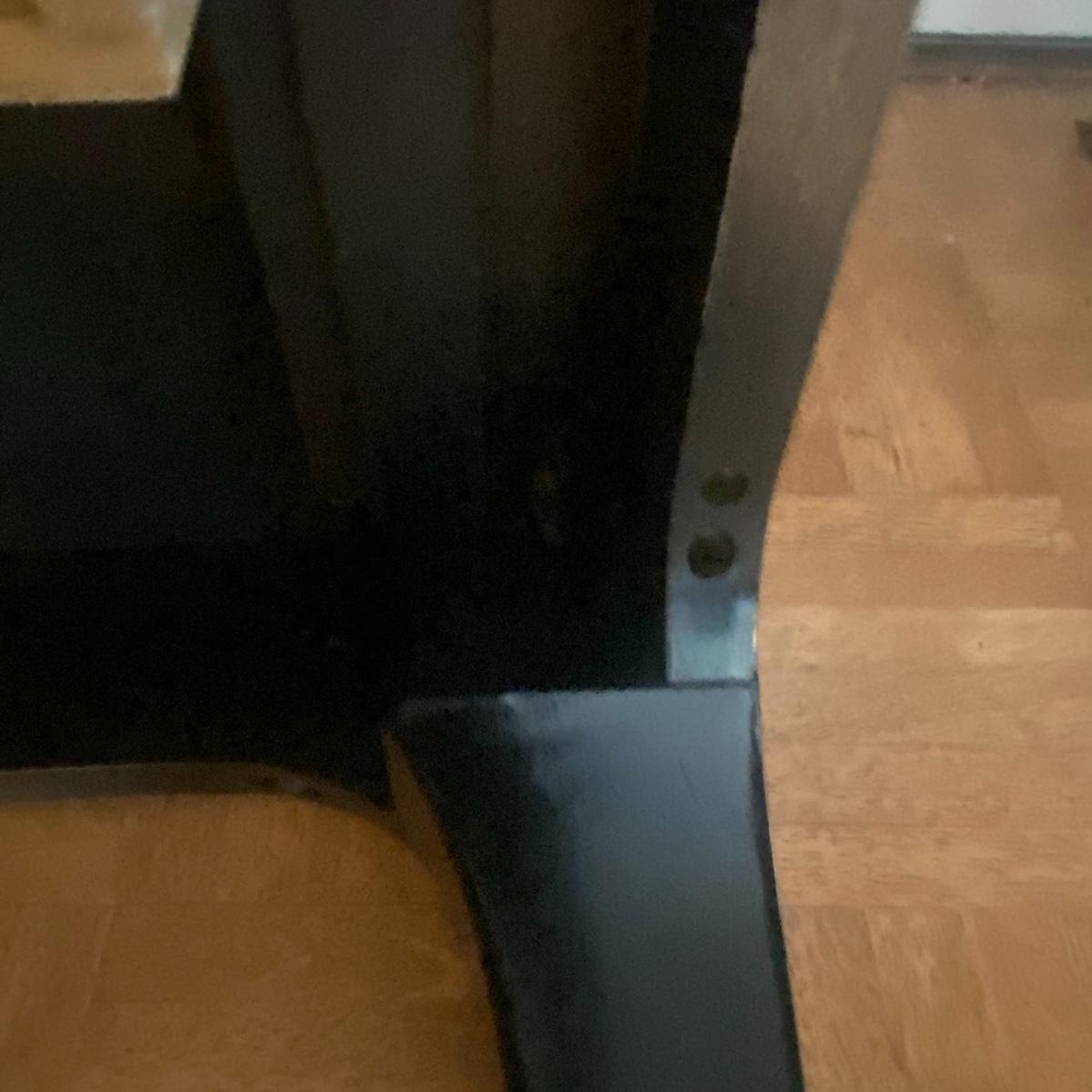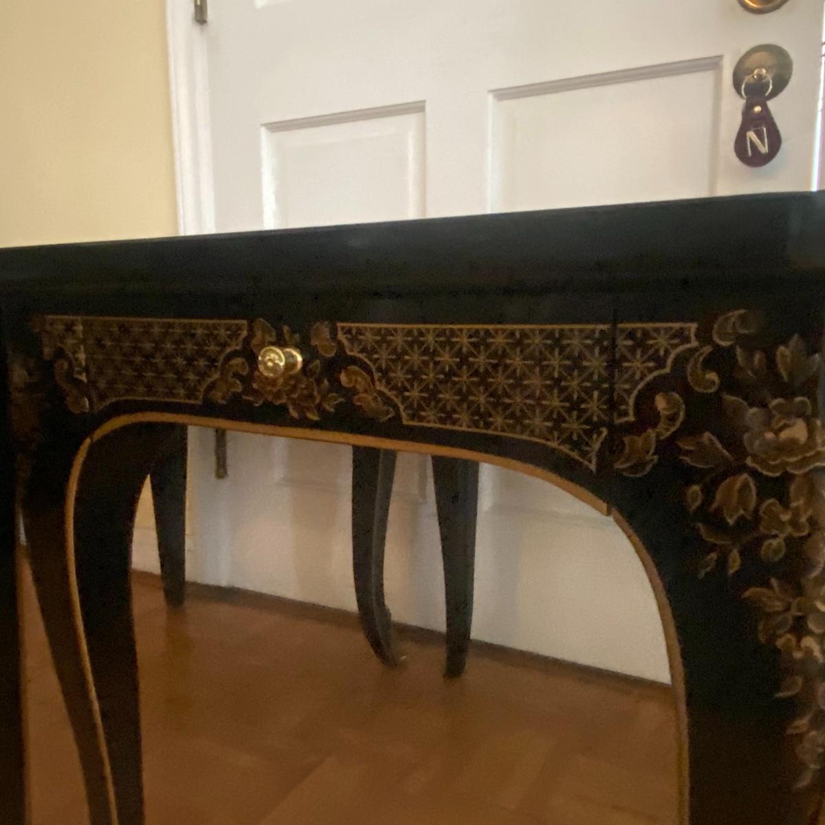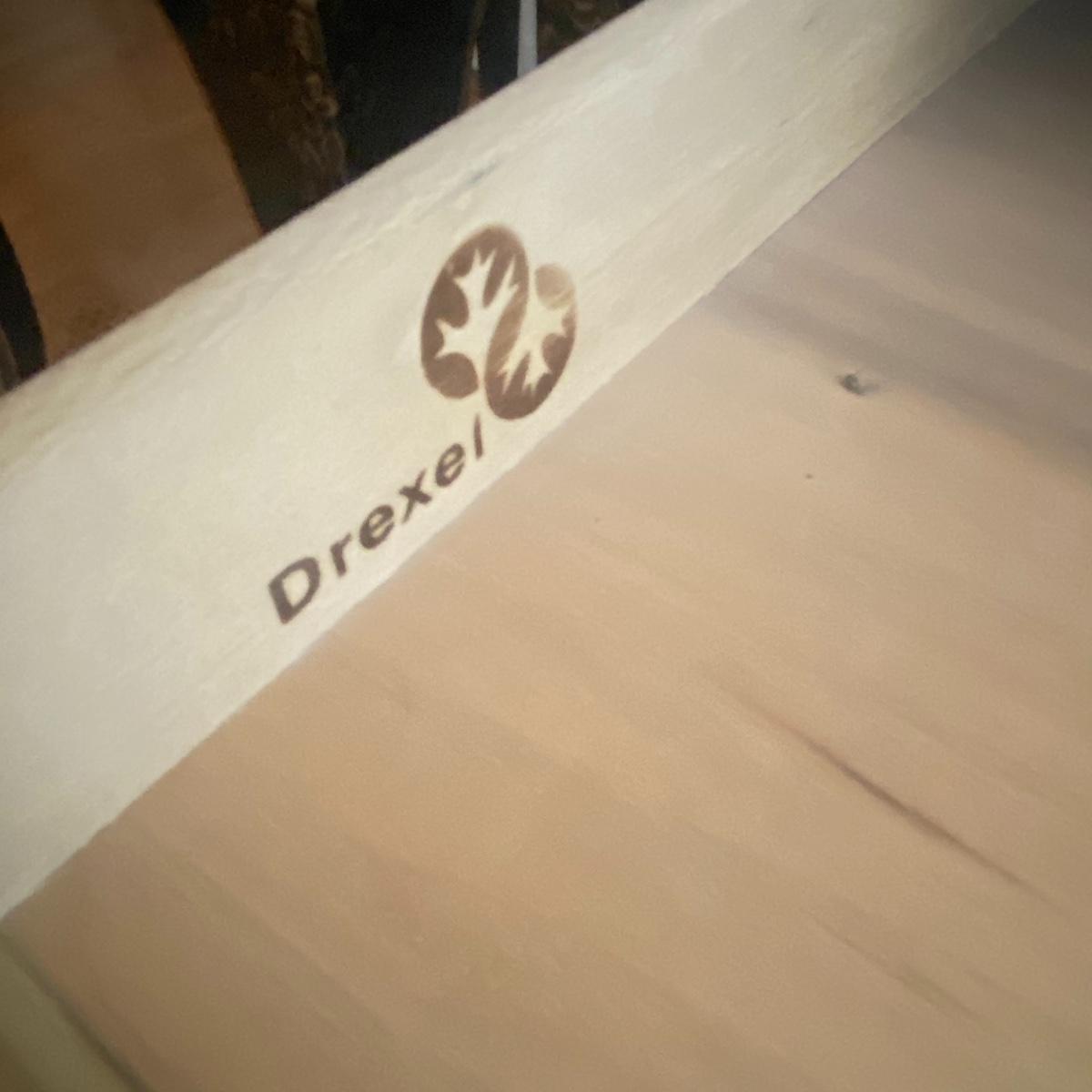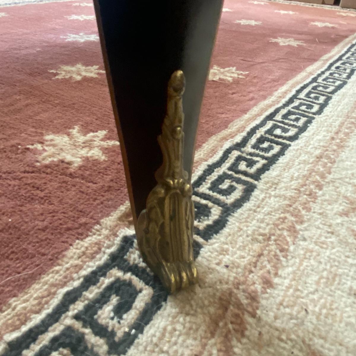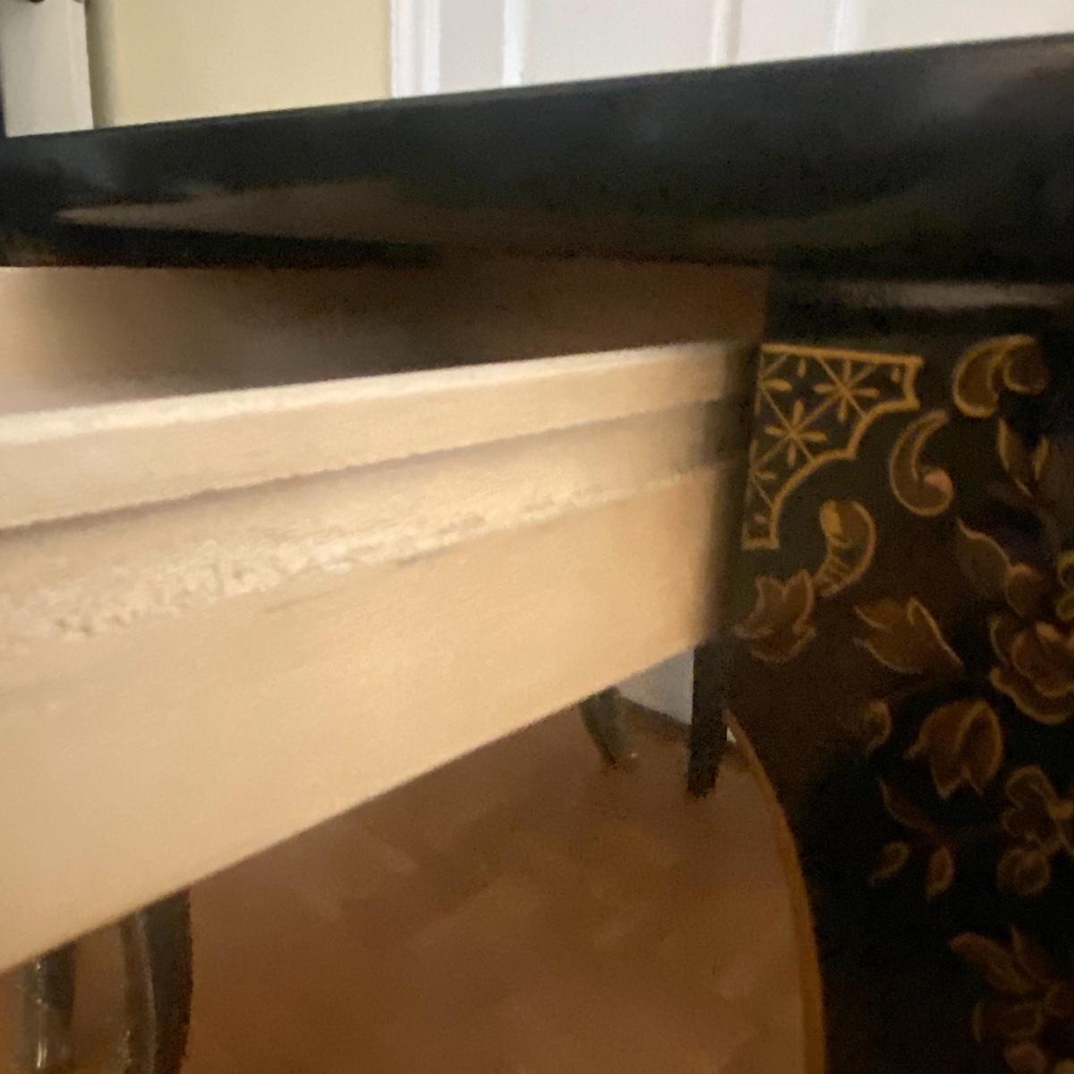 Lot includes beautiful Drexel furniture set! Coffee table with glass top insert and wood details measures out to 36”x36”x16”. Coffee table and two side tables have matching all black legs and floral and golden designs, see photos. Side tables with an all black glass top insert measures out to be 20.5”x26”x23”. See photos. Local pickup only.