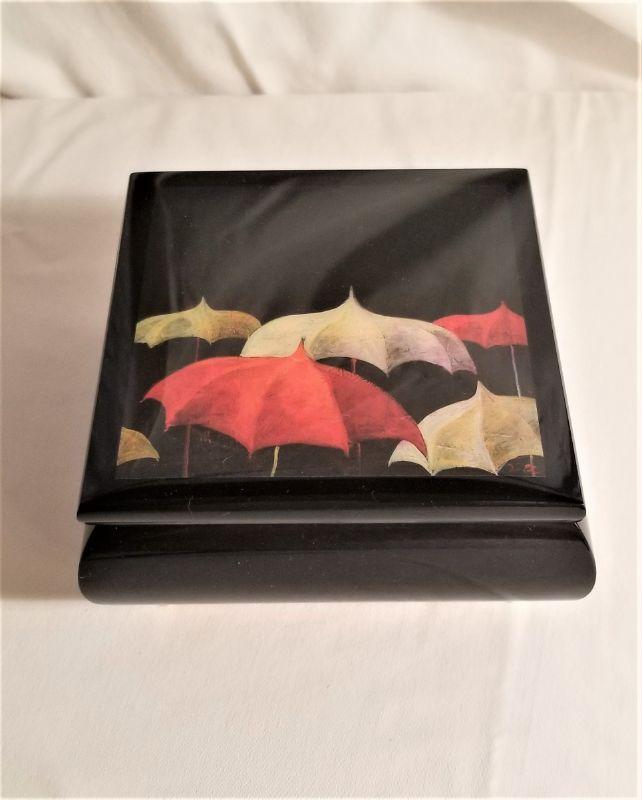 Lovely vintage lacquer music box by the Erealano Company - umbrella motif. Plays "Raindrops Keep Fallin' on my Head." Measures 5" x 5". Nice condition. No box.