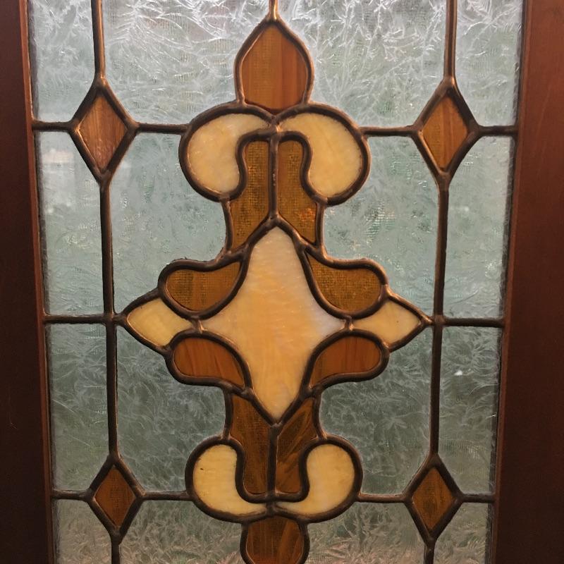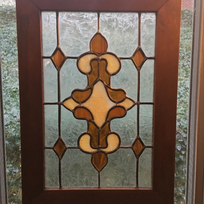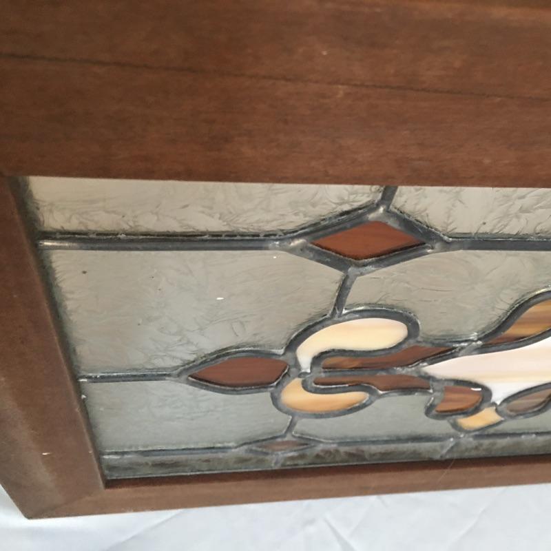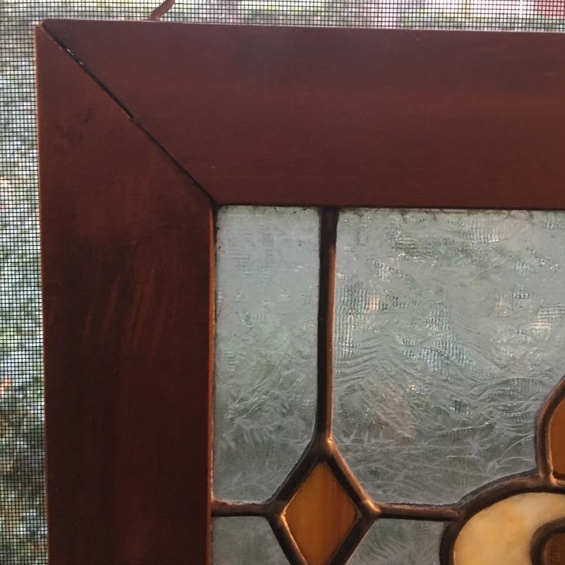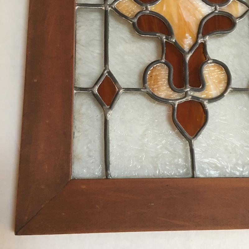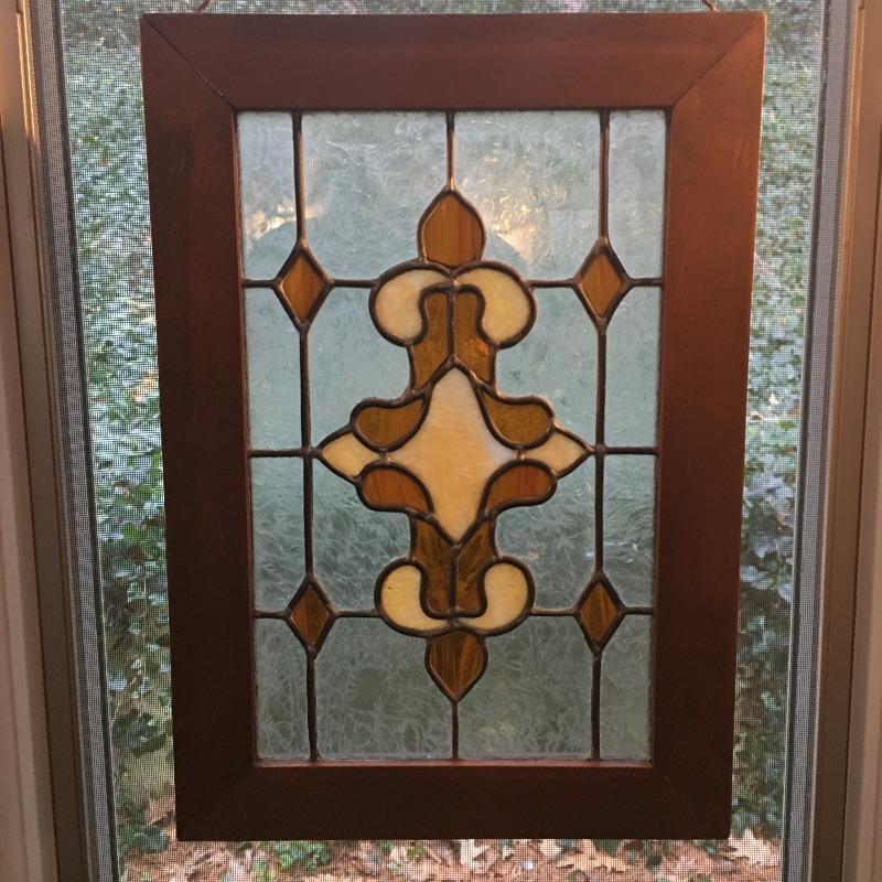 Stunning cream and gold colored stained glass in a wooden frame. A great piece to hang in your window and enjoy for years to come. Frame measures 13.75” x 19.5” x .75”.