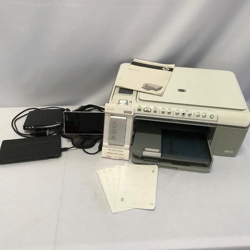 Nice electronic lot to fulfill your home or business computer needs! First, an unopened Moshi Thunderbolt 3 compatible USB-C Multiport Adapter! Lot also includes HP Photosmart C5280 printer/scanner/copier. Copier has owner manual and a small stack of photo paper included. Printer turns on when prompted. Garmin GPS with friction mount perfect for these mountain roads without phone service! Garmin is complete with car adapter, working condition is unknown, but Garmin looks to be in fine condition. There is also a nice Amazon Fire Tablet with Infiland case, and an LG Portable DVD. Amazon Fire turns on when plugged in. Shipping available.