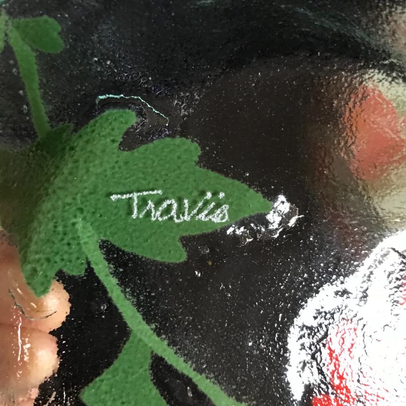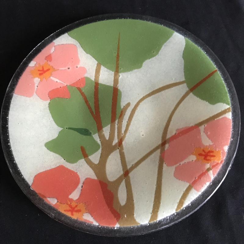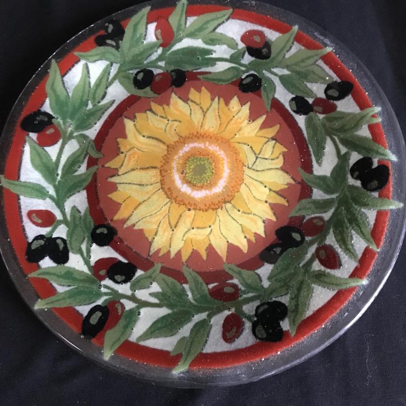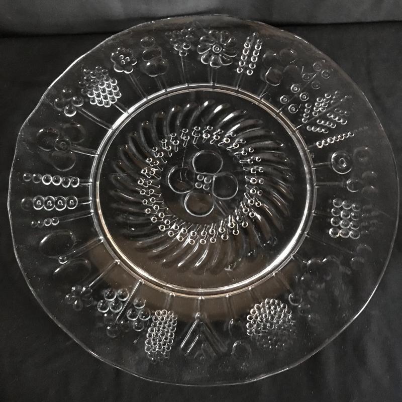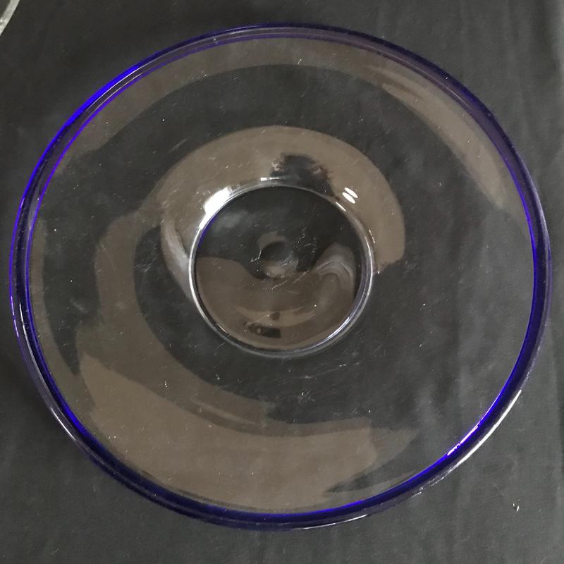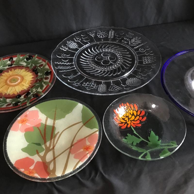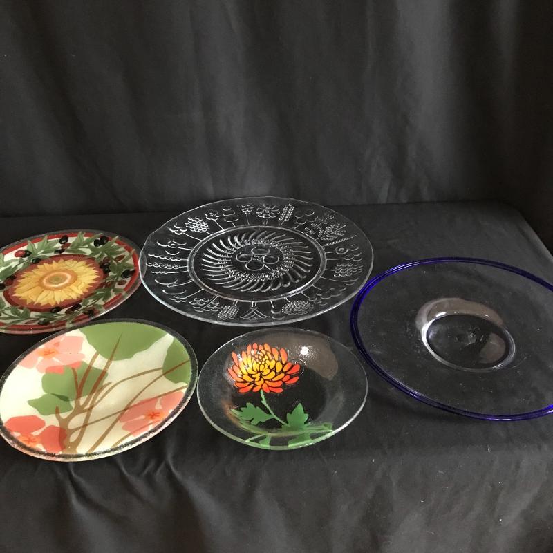 Lot includes five glass serving plates, some handmade. Largest is approx. 15” in diameter.