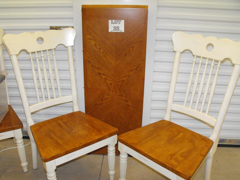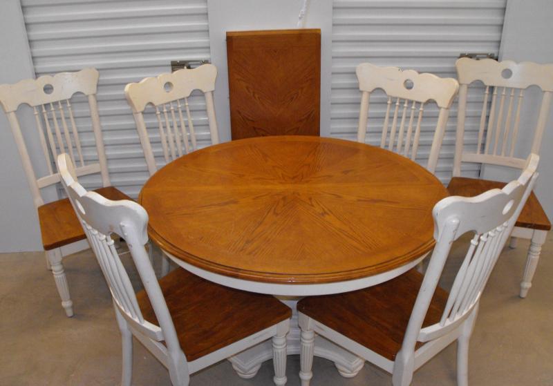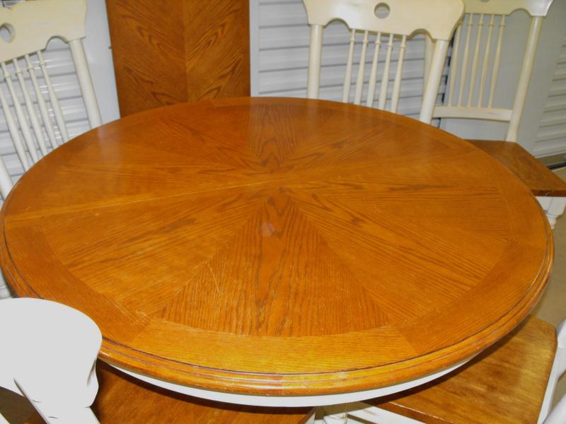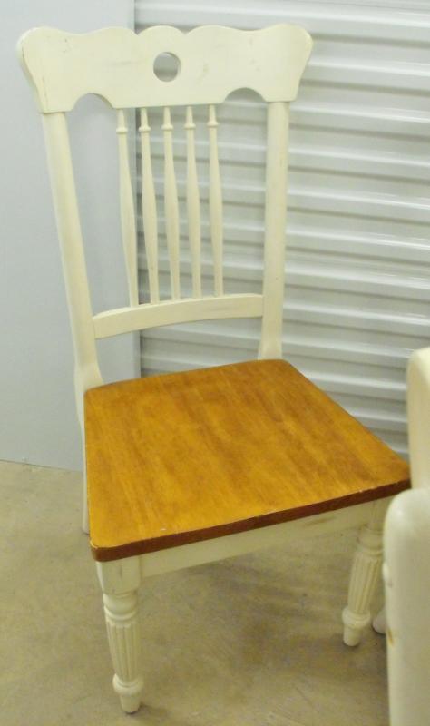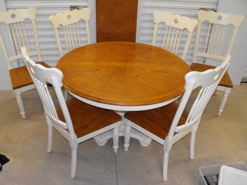 Includes 6 Solid Wood and Very Sturdy Chairs. The white paint could use some touch up or elbow grease in places but both table and chairs are sturdy and solid. Quality Set