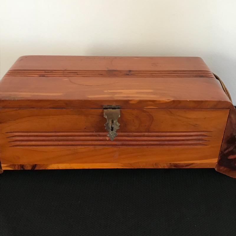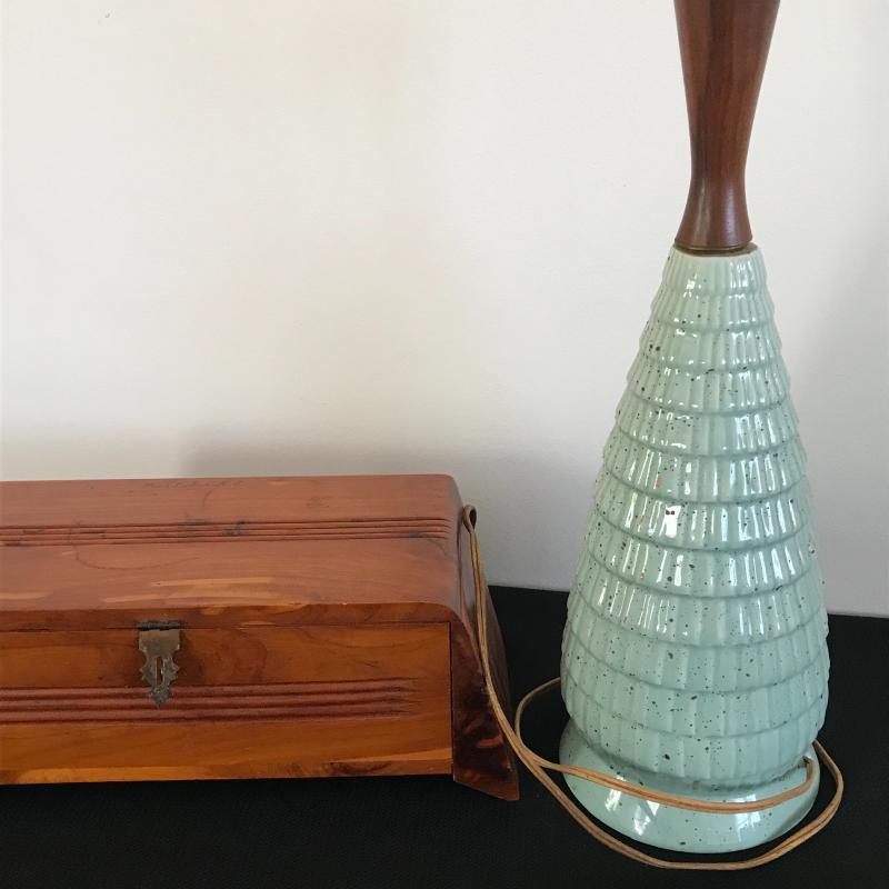 Lot includes vintage MCM turquoise lamp (approx. 26.5” tall) and wooden treasure box is from Point Lookout, NC (approx. 12” long). Shipping available or Local pickup in Asheville, NC.