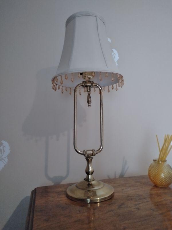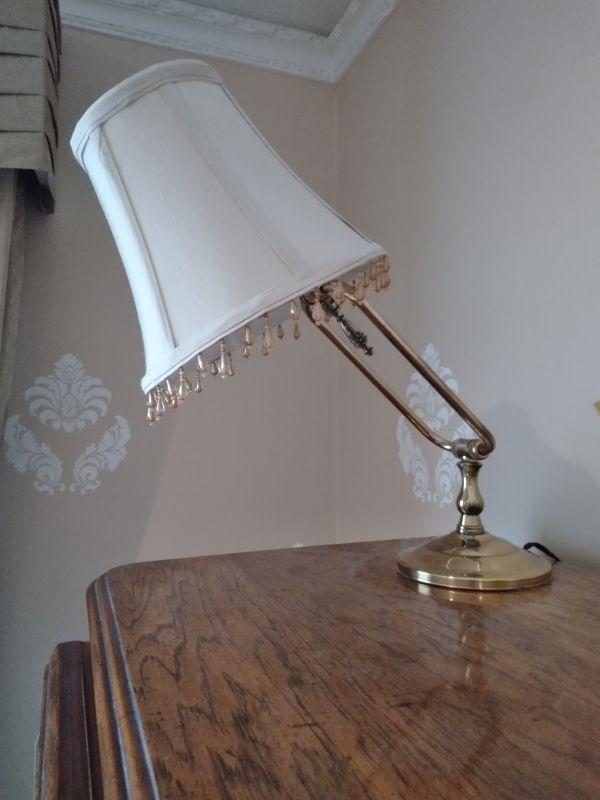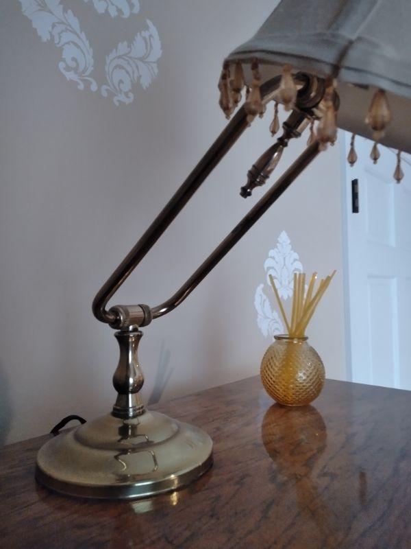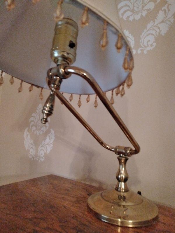 BRASS COLORED LAMP WITH ADJUSTABLE BASE WITH LAMP SHADE.