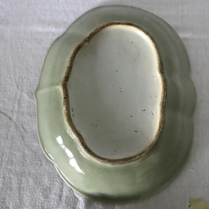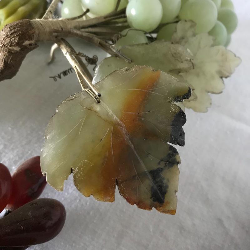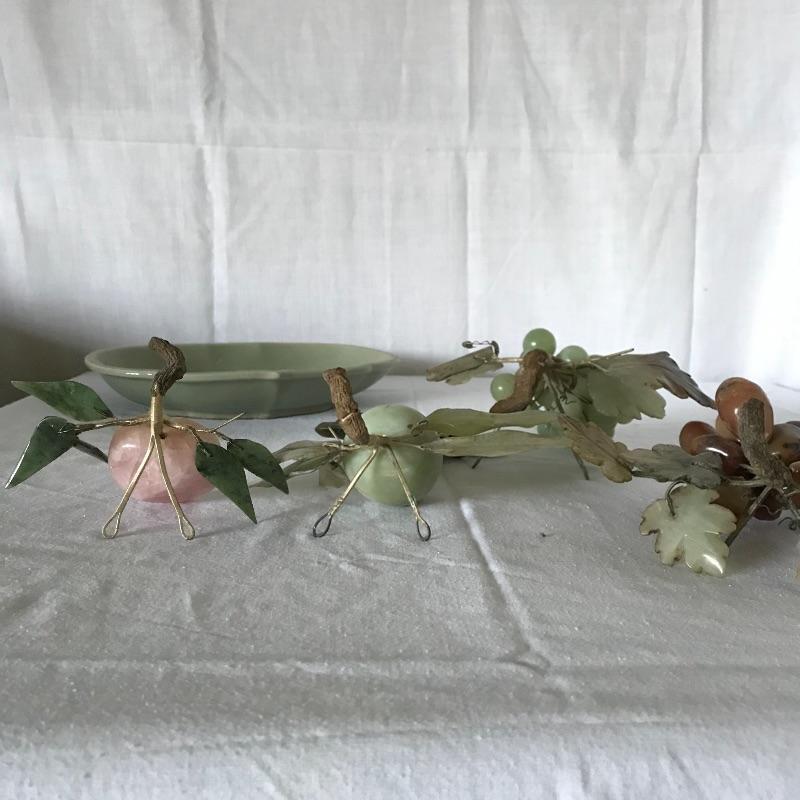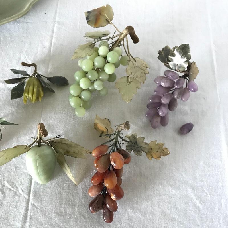 Lovely light olive colored plate measuring approximately 11” x 9” with an array of marble grapes and other fruit. The fruit is complete with gorgeously designed leaves and stands. A chartreuse fruit appears to have some damage and one lavender grape has come off. See photos. Shipping available.