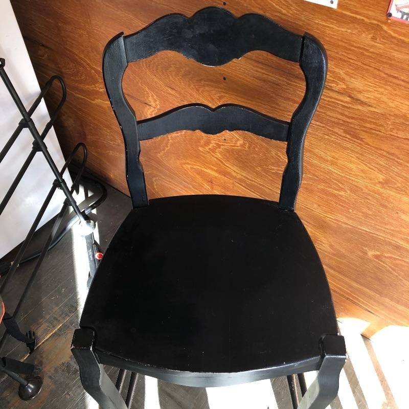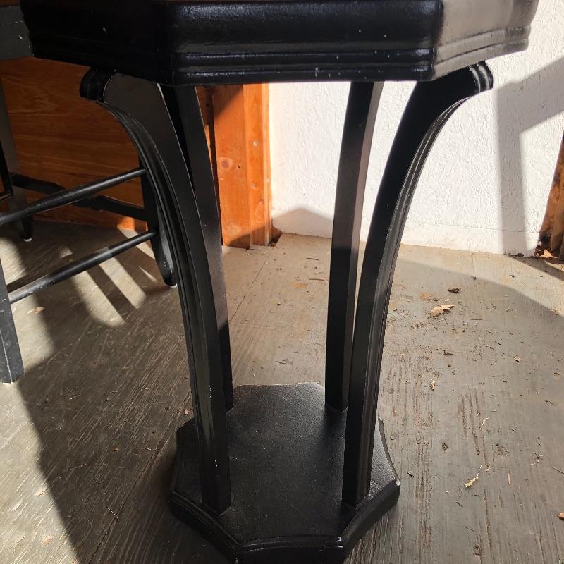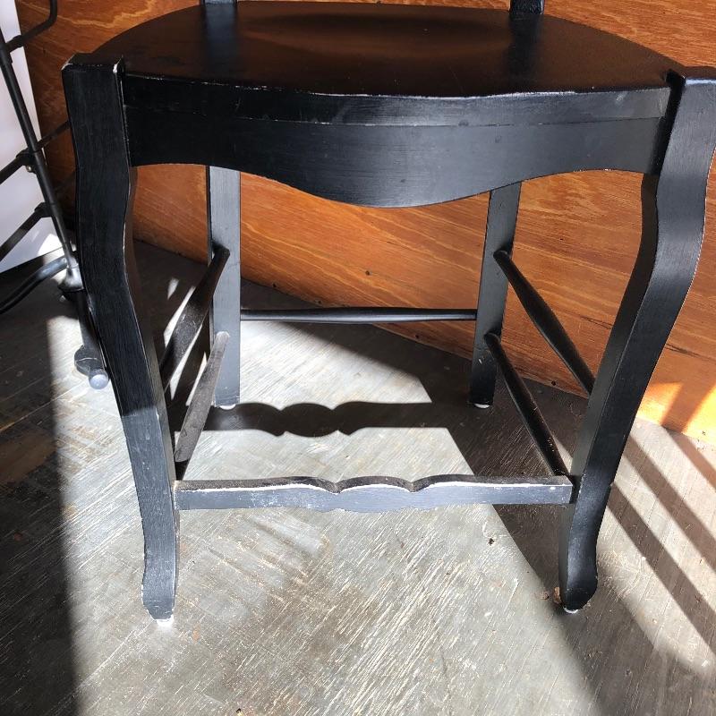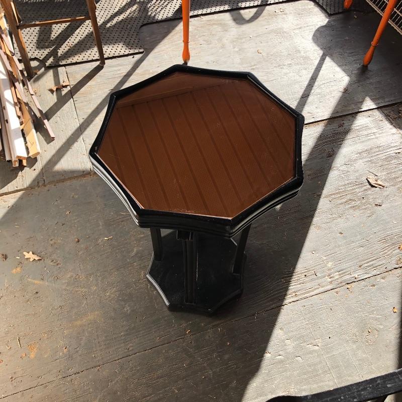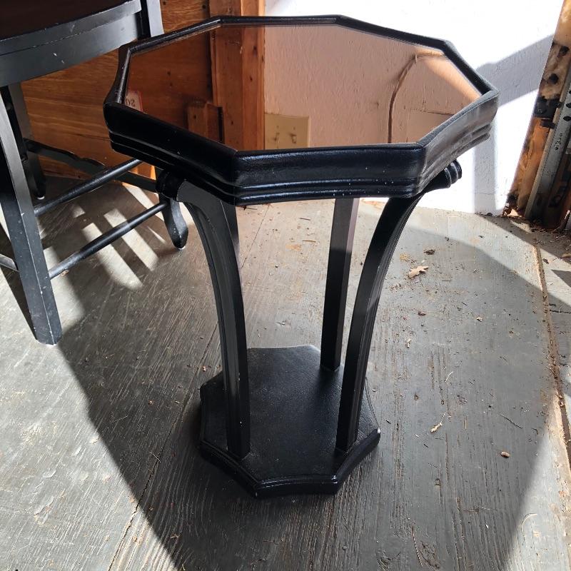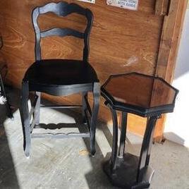 This nice black wood duo includes a heavy wood chair and a mirrored table. Both pieces are wood painted black. The top of the table is a lovely rose hued tinted mirror that will show off a few precious display ornaments very nicely. The mirror is in good shape with just a few very minor blemishes shown in an image.