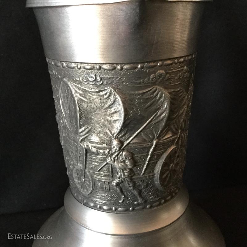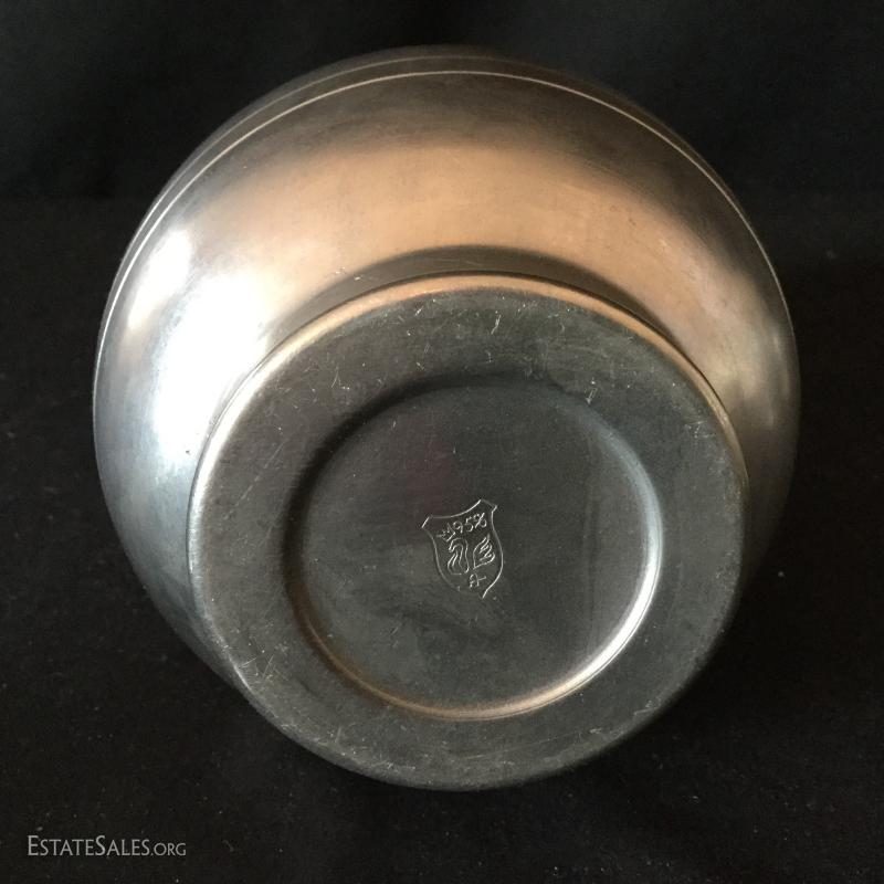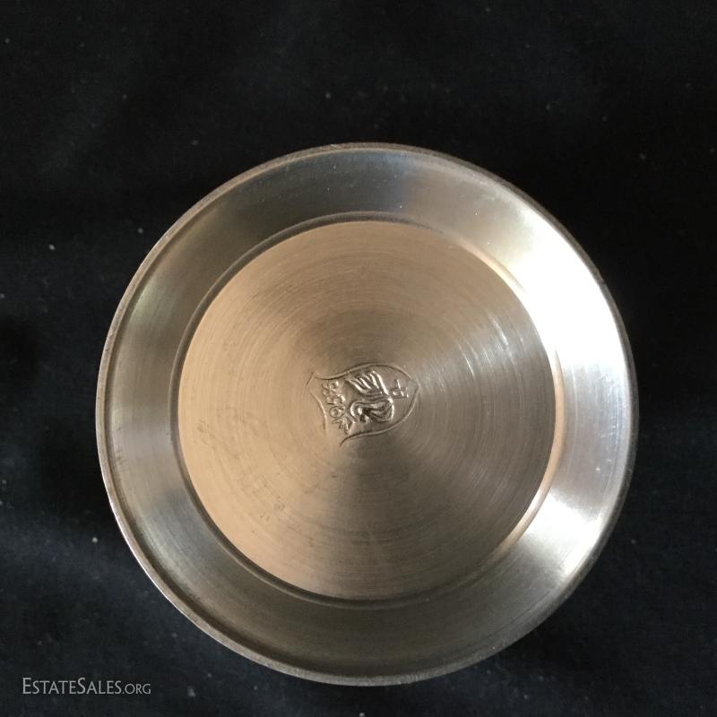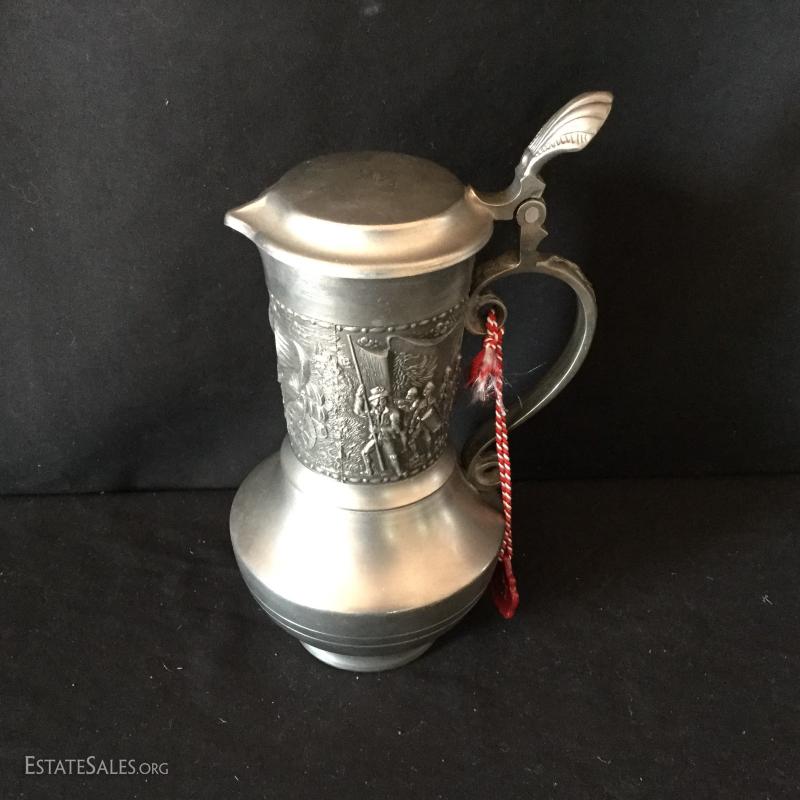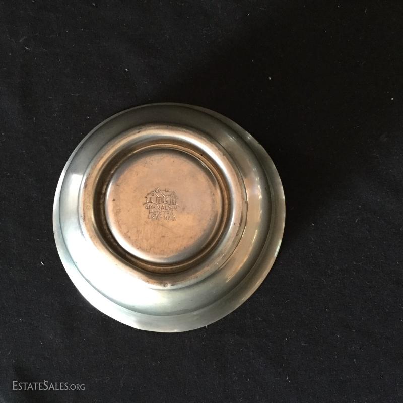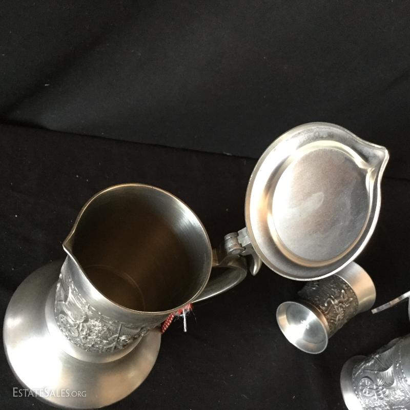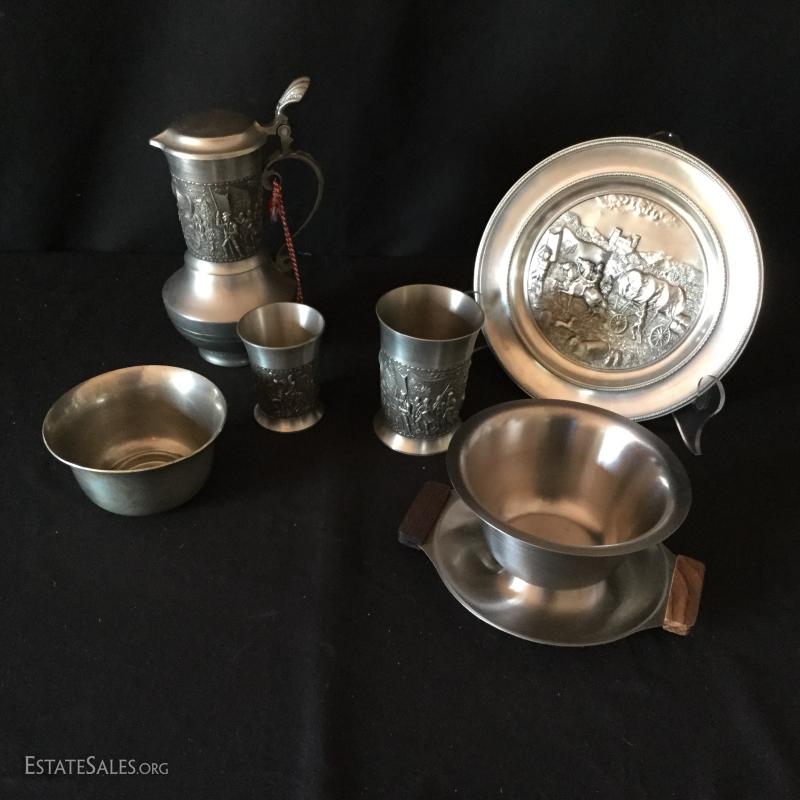German Pewter plate 8.5"d, pitcher 9"h, tumblers, serving dishes, and small bowl by John Alden.