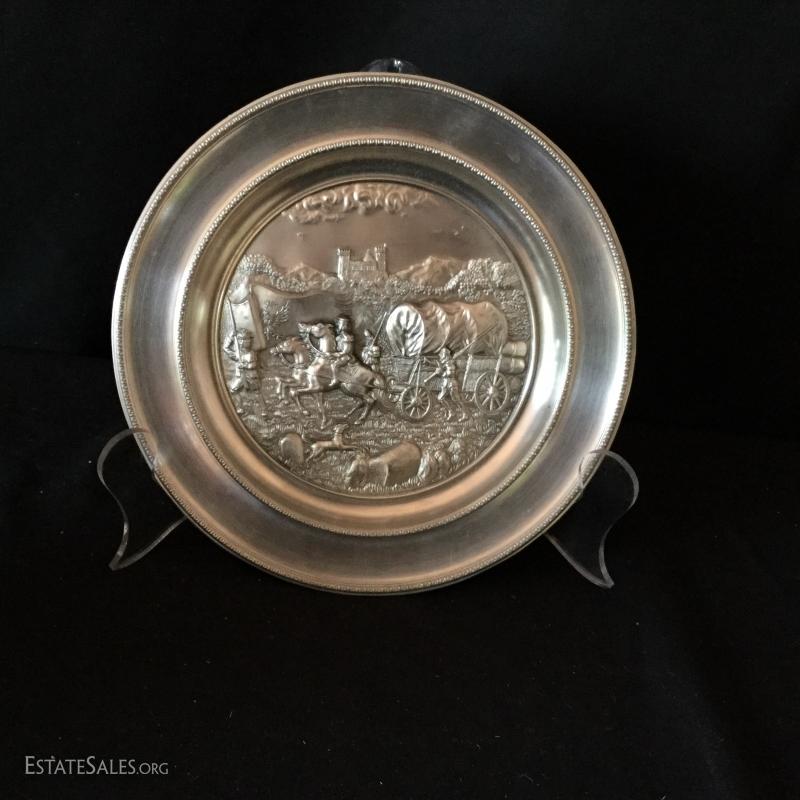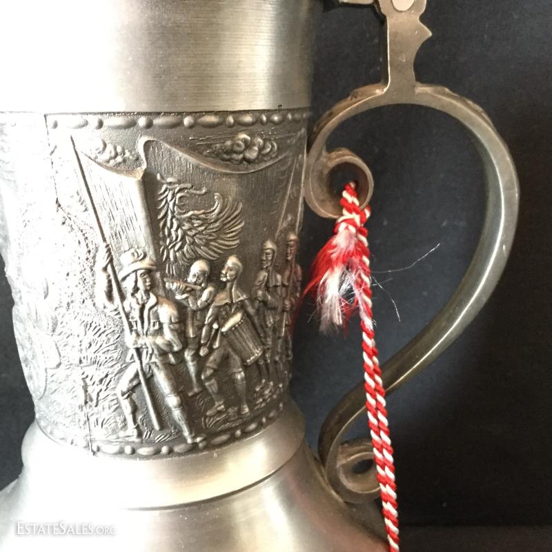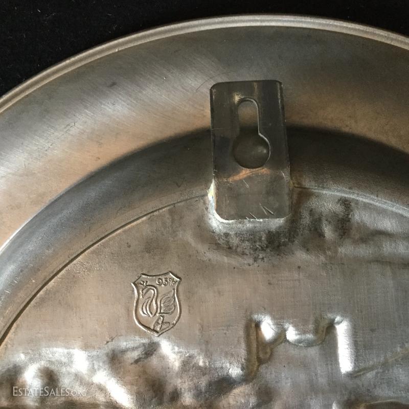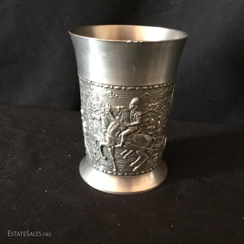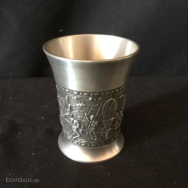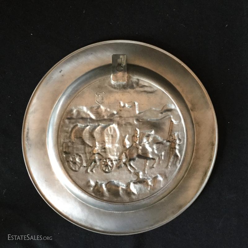 German Pewter plate 8.5"d, pitcher 9"h, tumblers, serving dishes, and small bowl by John Alden.