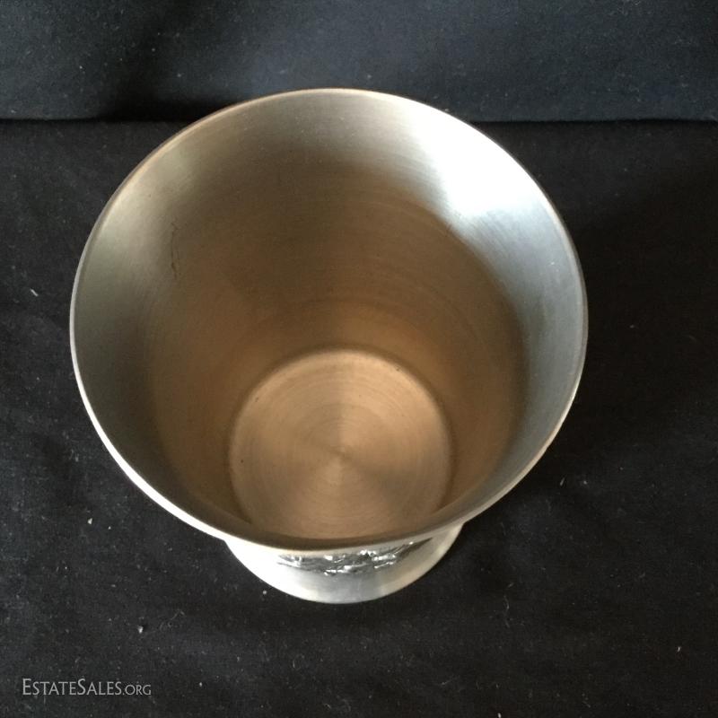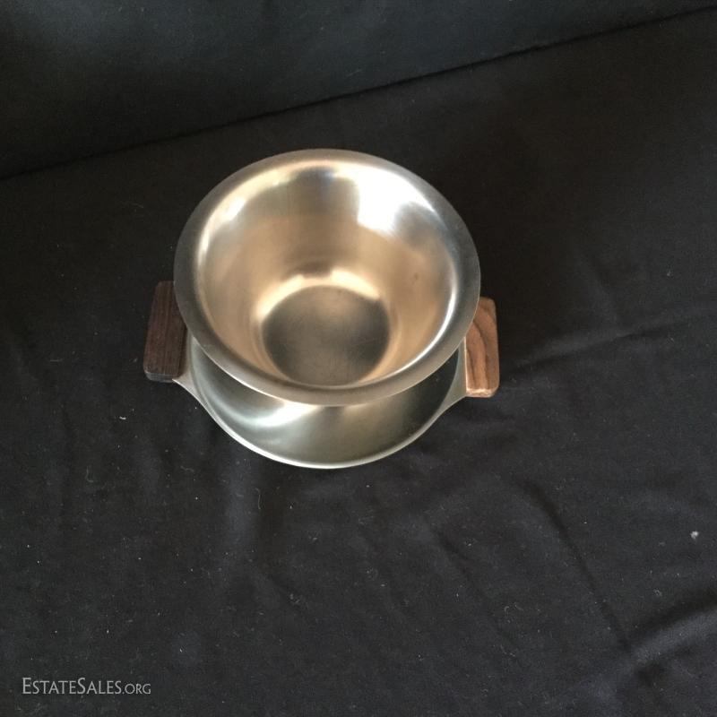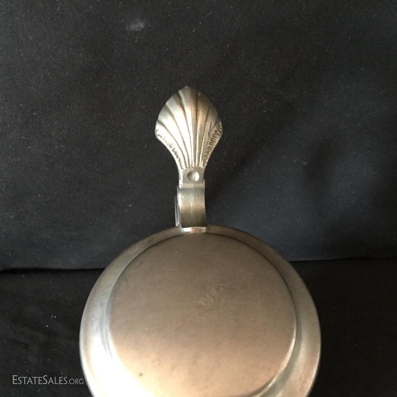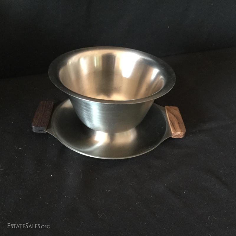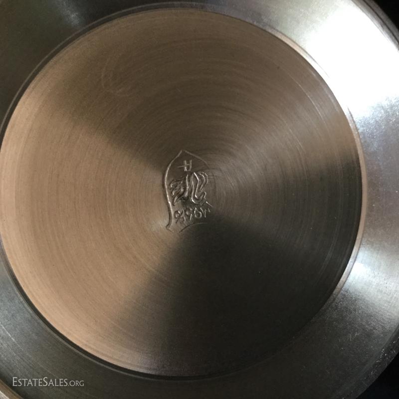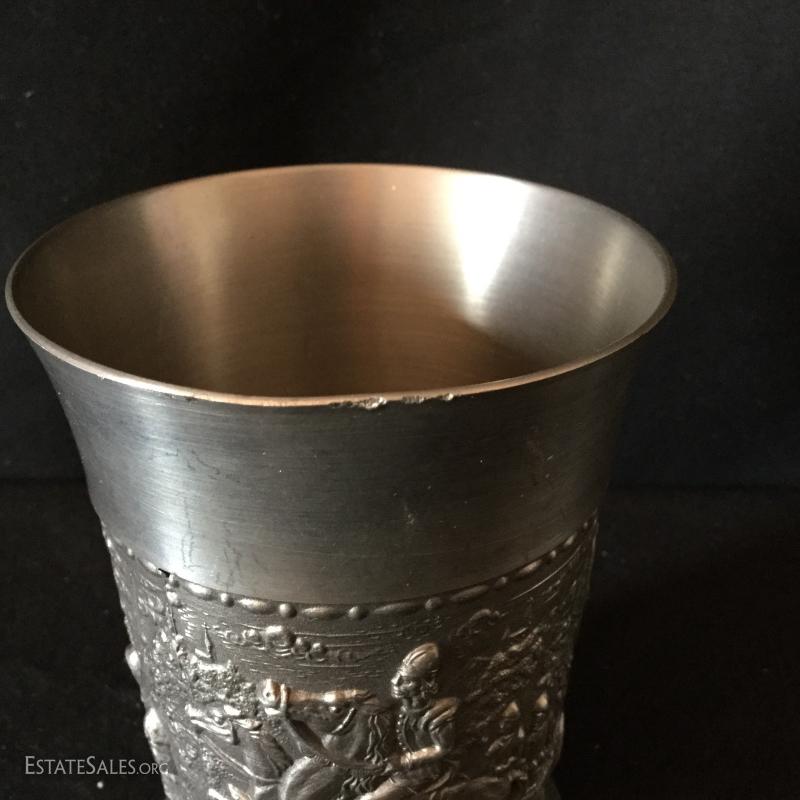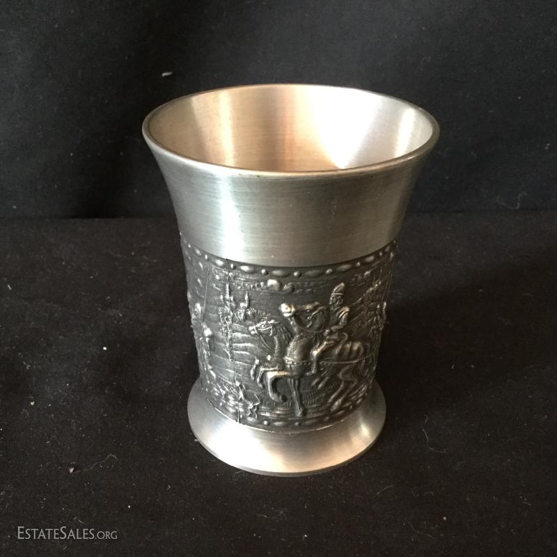 German Pewter plate 8.5"d, pitcher 9"h, tumblers, serving dishes, and small bowl by John Alden.