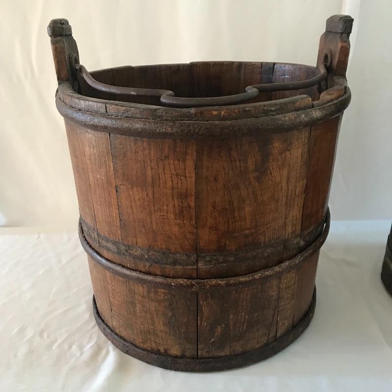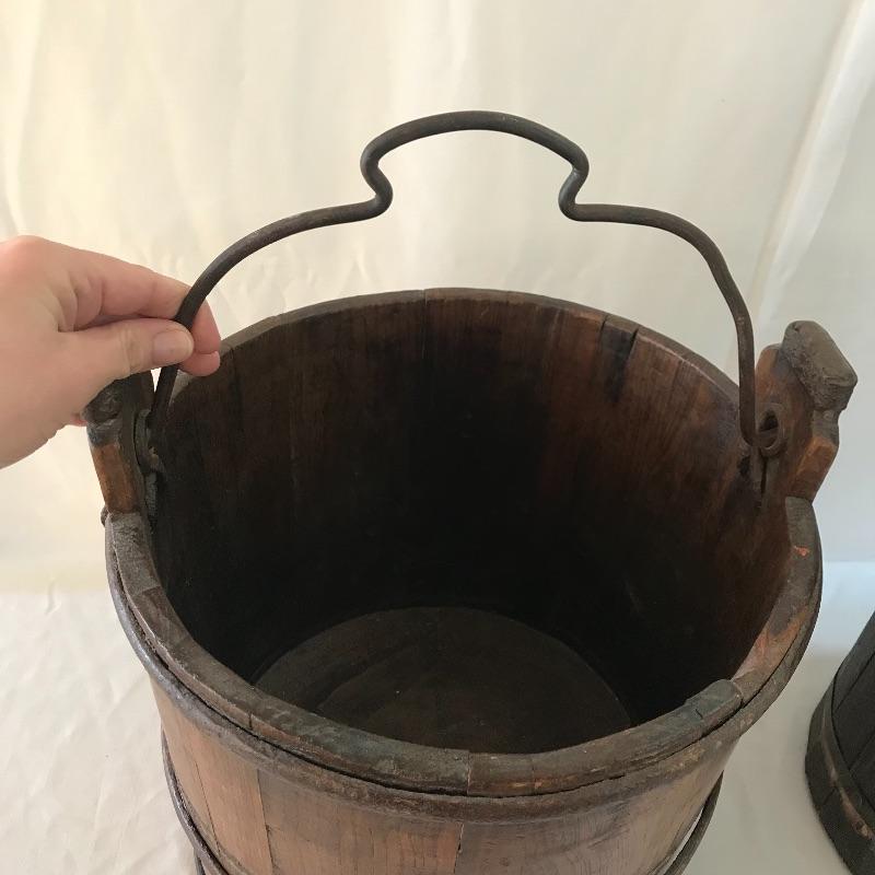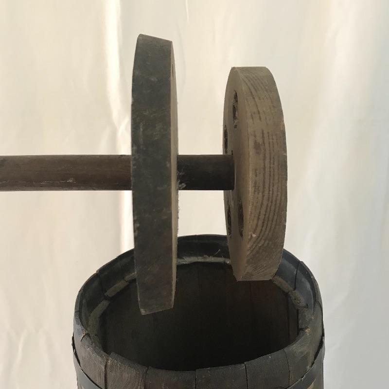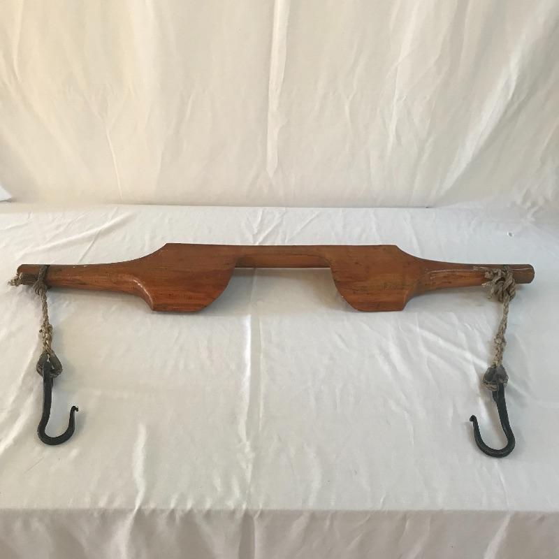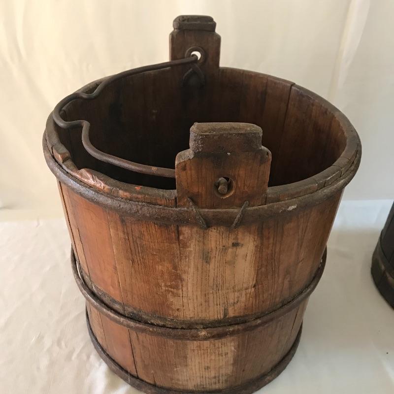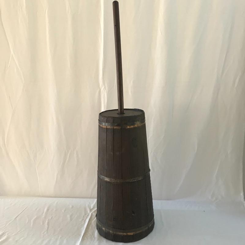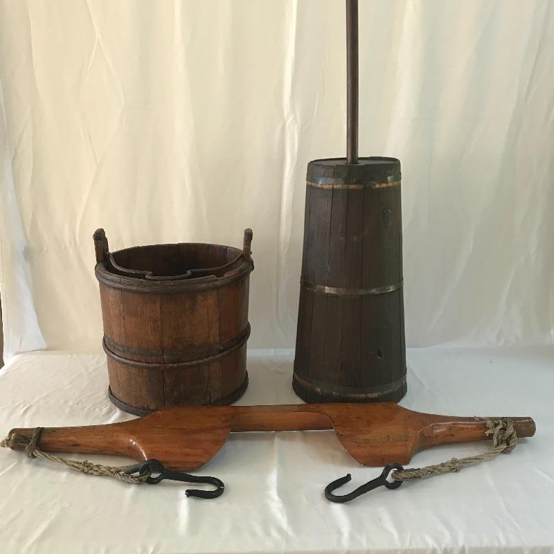 Three wooden classics! A dark brown butter churn, oak bucket and yoke. All three appear in working order with great primitive decor capabilities. Yoke measures approximately 37.75” long. No shipping.