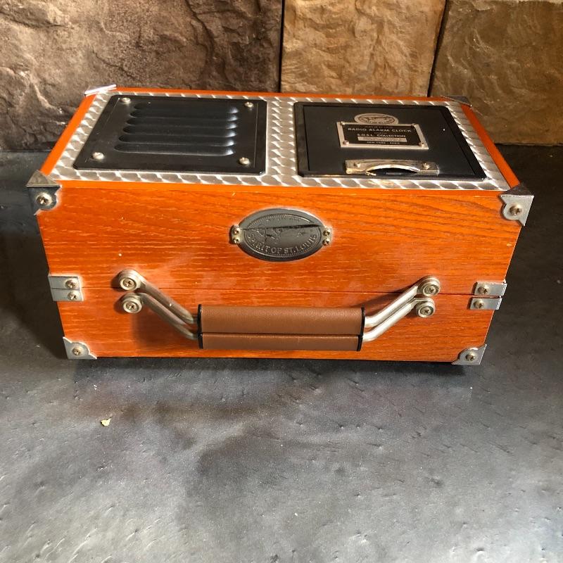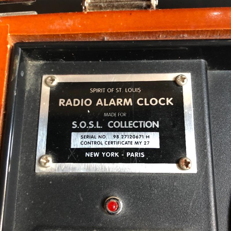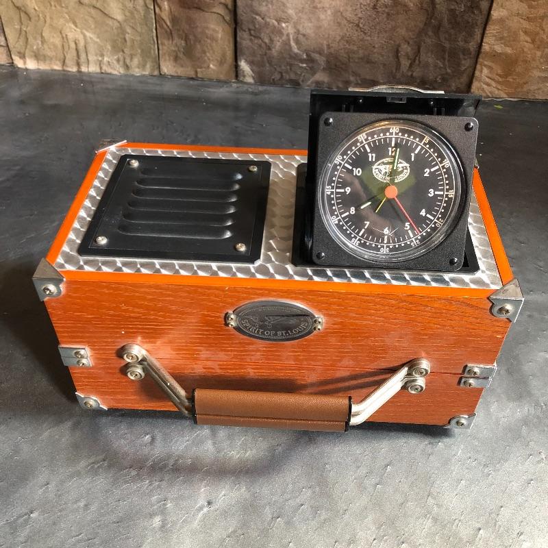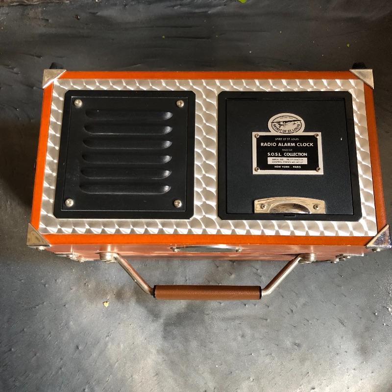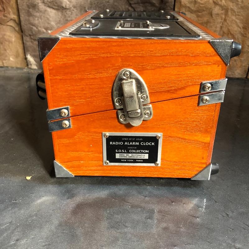 This Spirit of St Louis Collection AM/FM clock radio is in a wooden box. Radio was not tested as it is missing power cord and battery cover. Box measures 5.5” x 10.25” x 5”.
