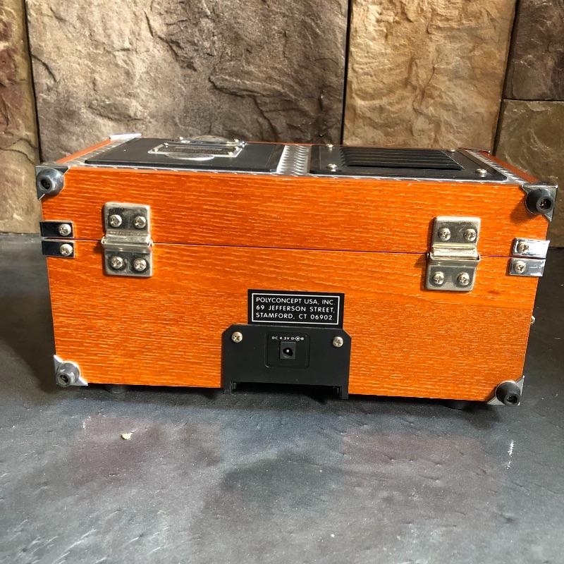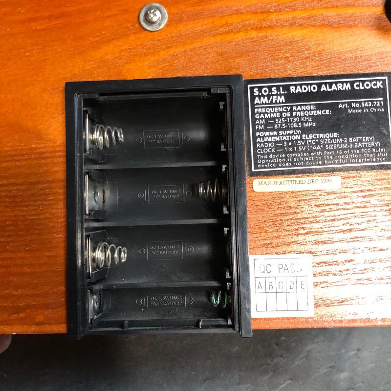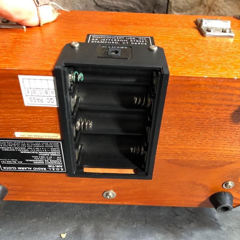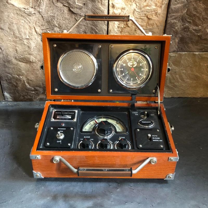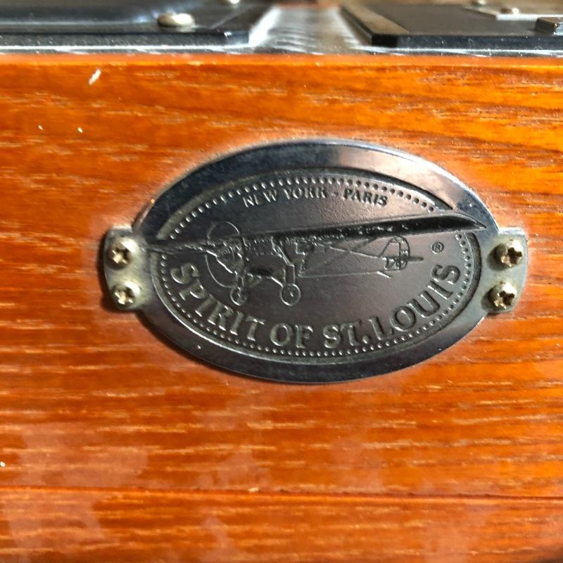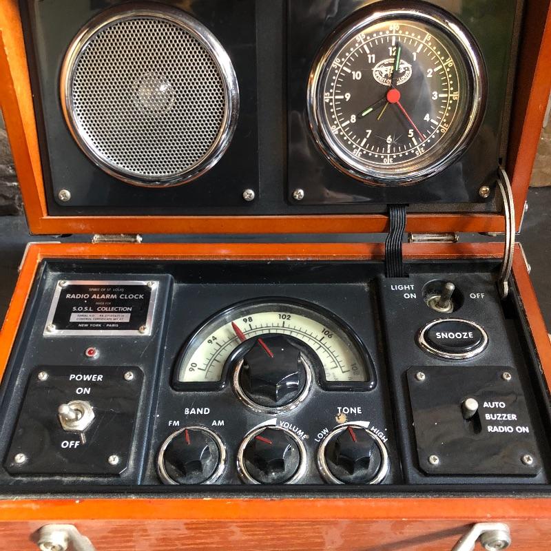 This Spirit of St Louis Collection AM/FM clock radio is in a wooden box. Radio was not tested as it is missing power cord and battery cover. Box measures 5.5” x 10.25” x 5”.