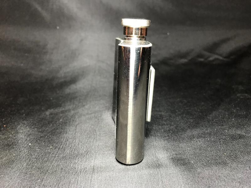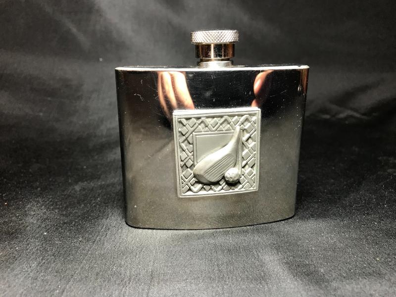 Nice stainless steel 5 oz. flask. Screw type lid. Pewter golf club and ball plaque on front.