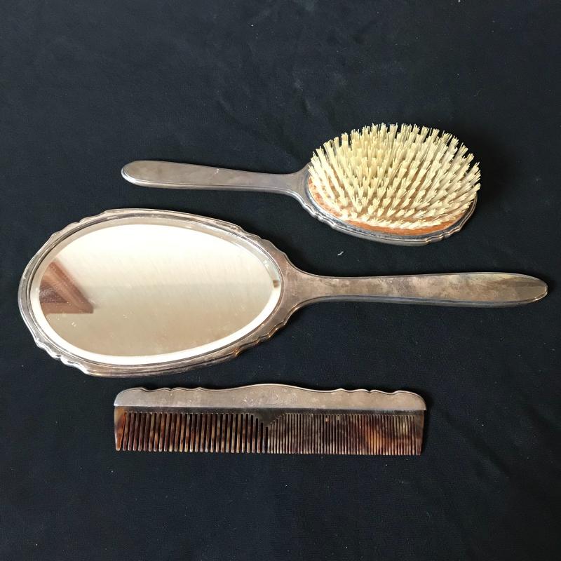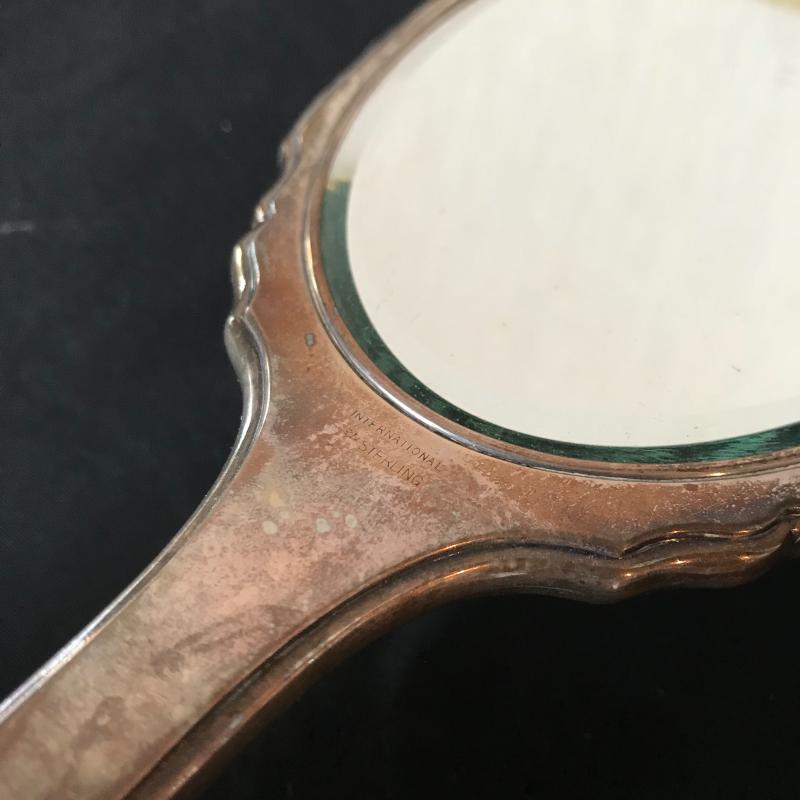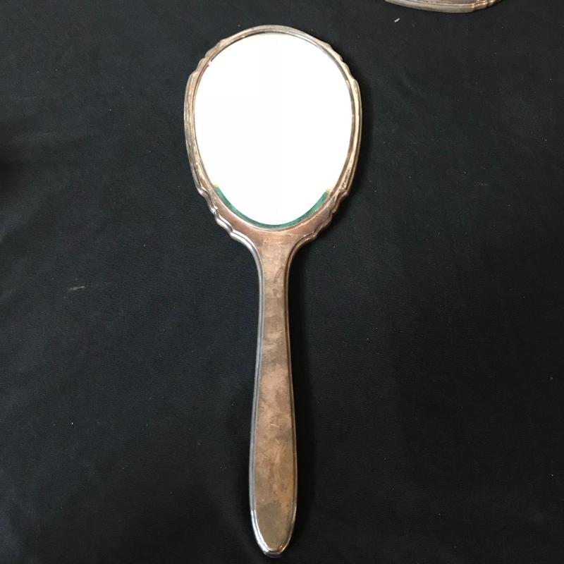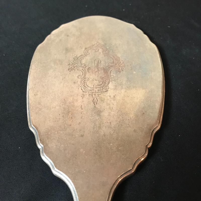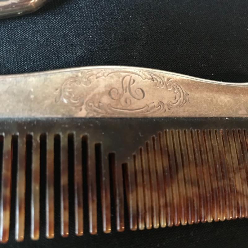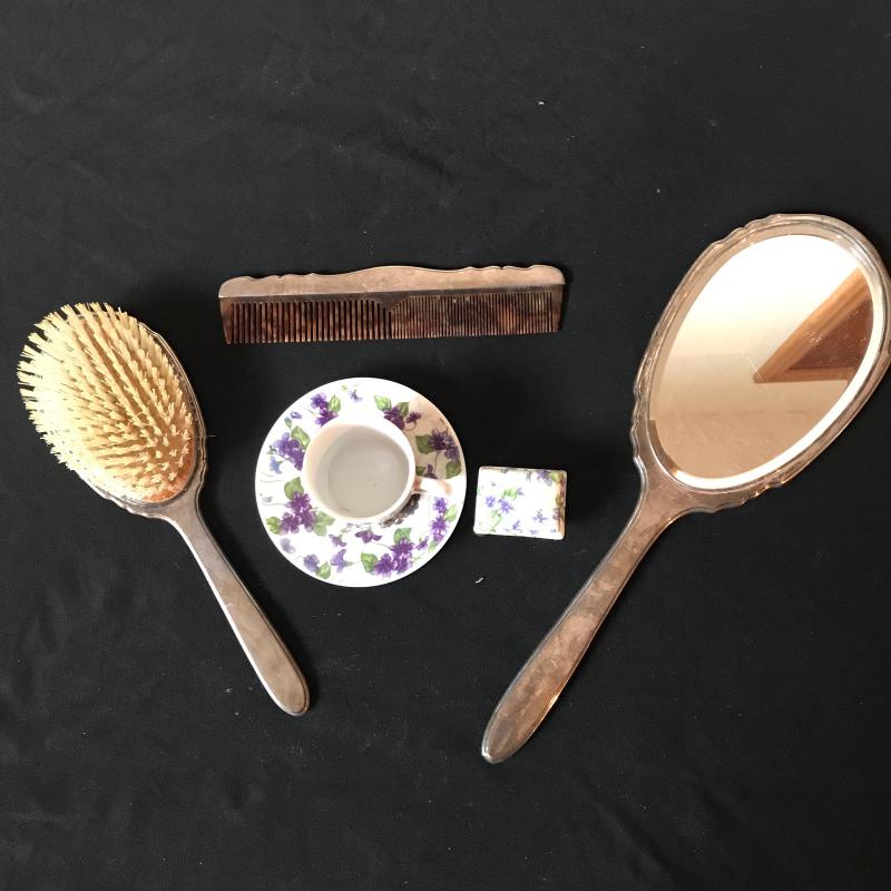 Three matching Sterling Silver antique vanity pieces monogrammed A. The mirror is the largest at 13.5” x 4.75” and the mirror itself has some faint spots and scratches. Quaint matching teacup with attached saucer and lidded box are also included. Shipping available.