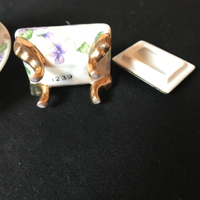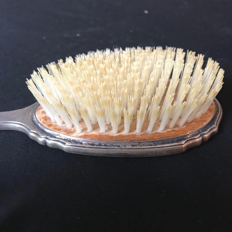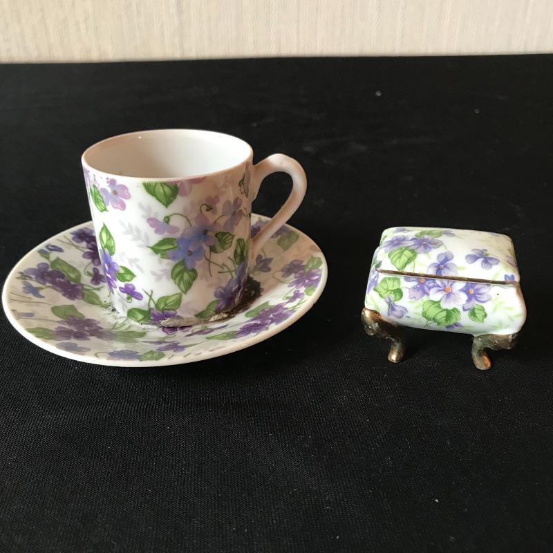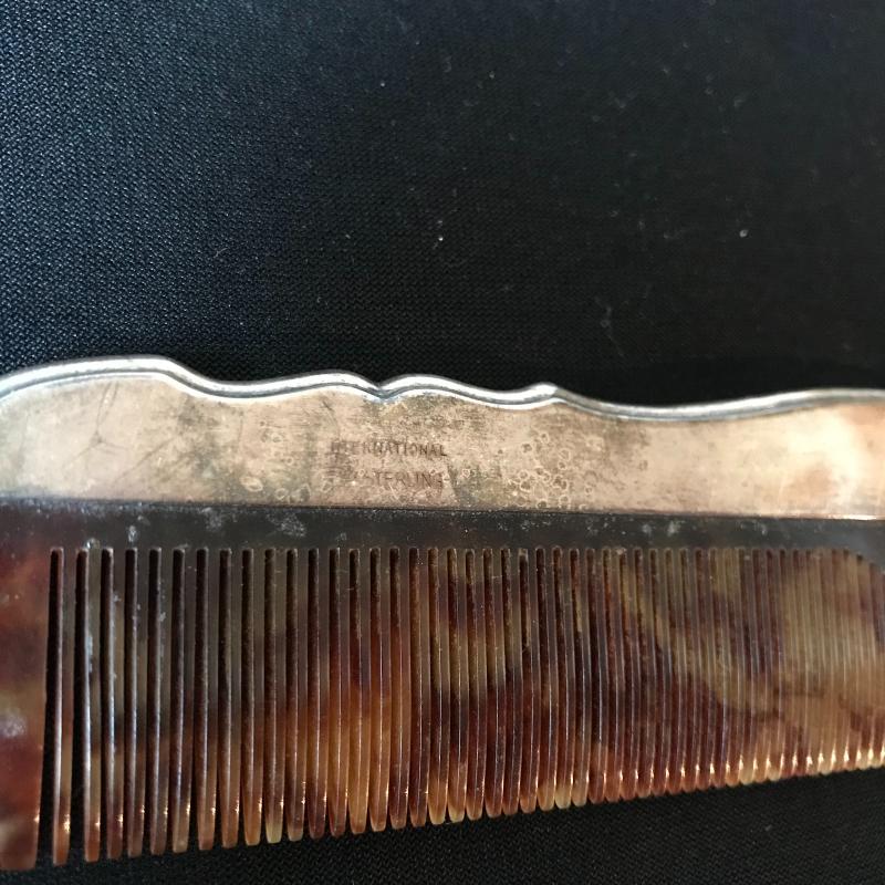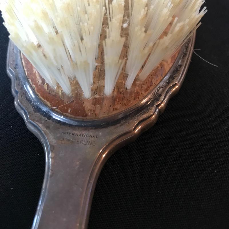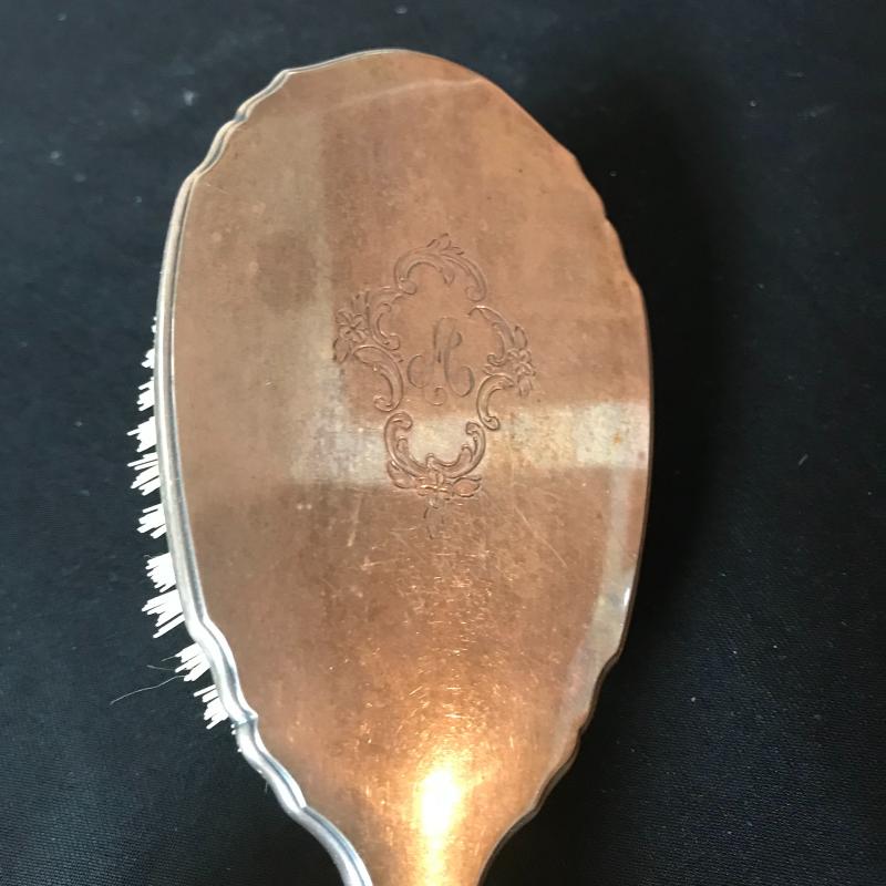 Three matching Sterling Silver antique vanity pieces monogrammed A. The mirror is the largest at 13.5” x 4.75” and the mirror itself has some faint spots and scratches. Quaint matching teacup with attached saucer and lidded box are also included. Shipping available.