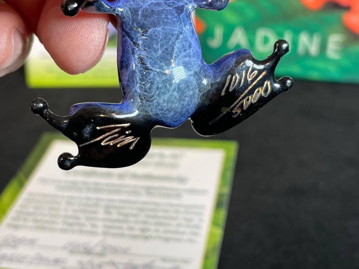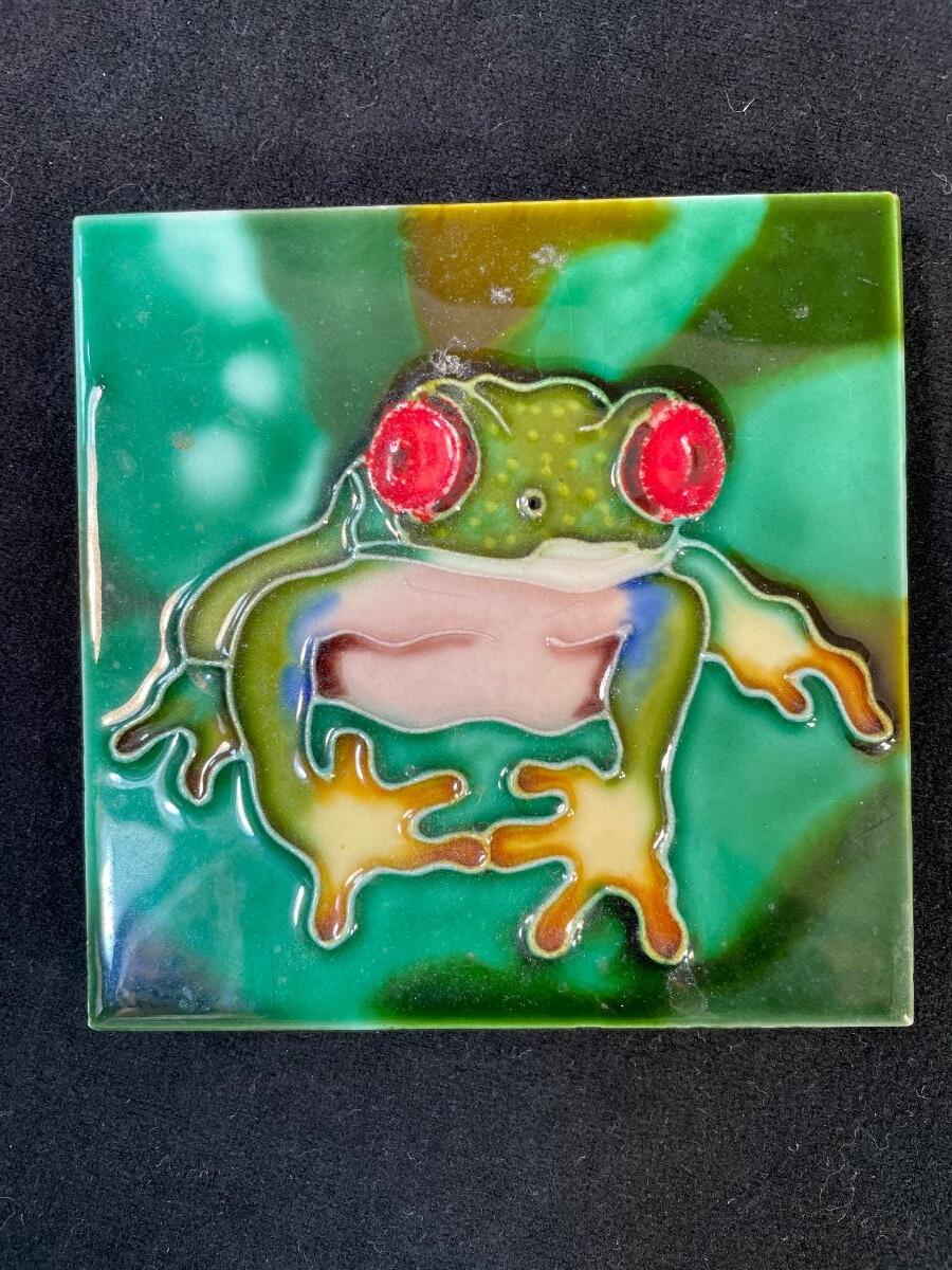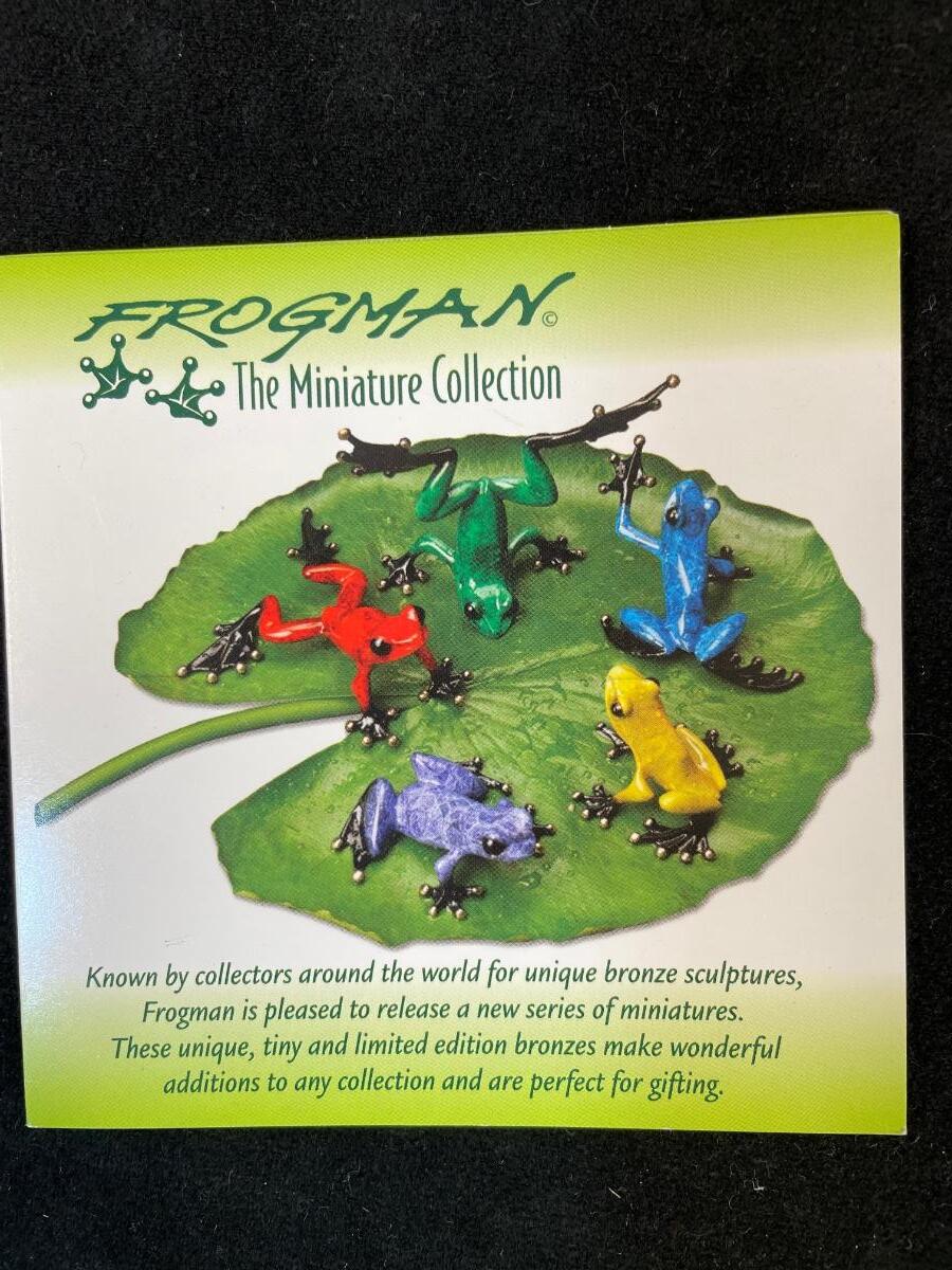 Frogman Enamel over bronze metal frog figurines by artist, Tim Cotterill. Measures 1" X 2" X 2". Signed and numbered 1016/5000 and includes COA. Also included is a 5" X 5" handmade ceramic tile with built-in stand
