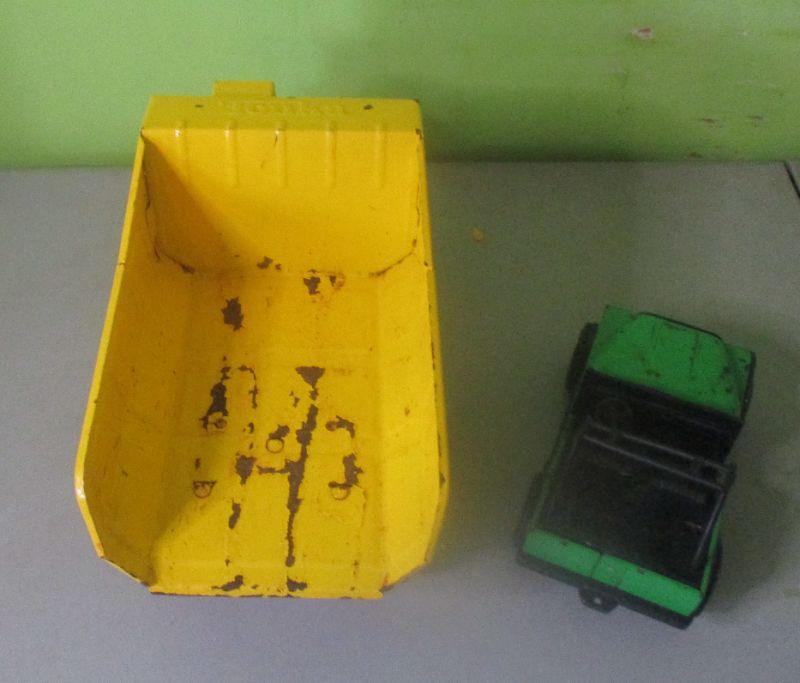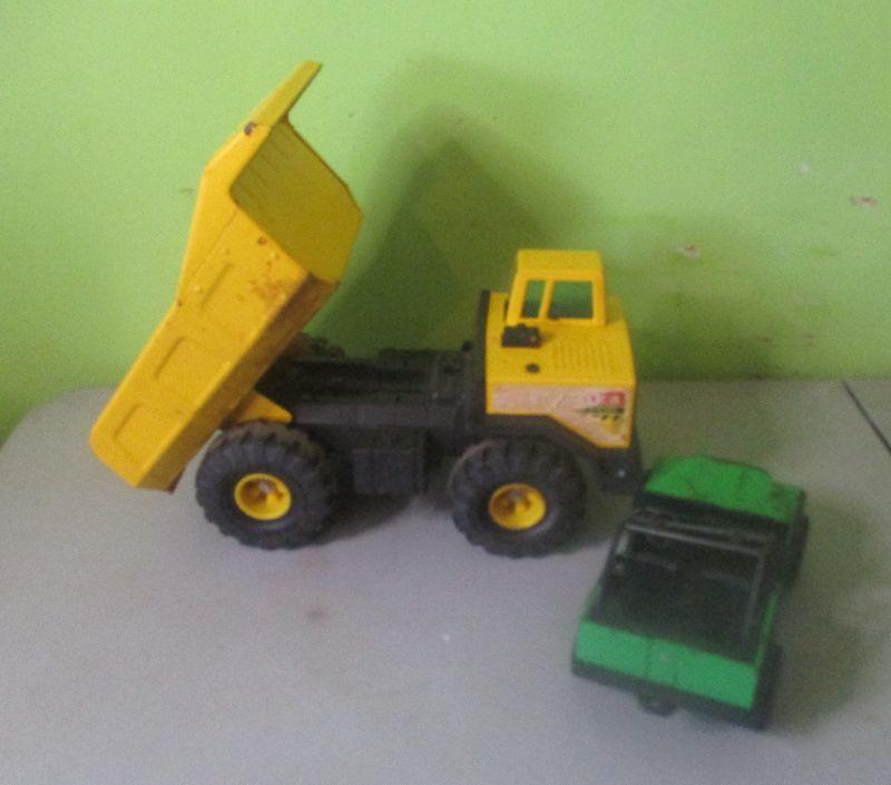 Both have metal bodies and the wheels are well attached and roll smoothly. The rest is from being played. Both are marked Made in USA and the dump truck has a 1993 copyright.