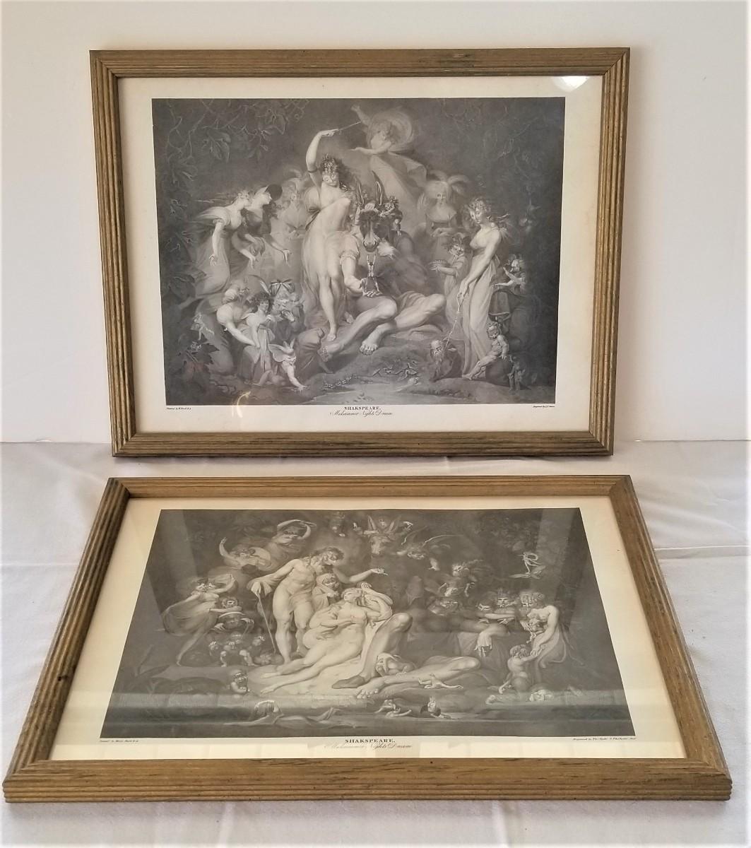 Nice pair of framed antique British engravings - both from "A Midsummer Night's Dream" - original art is by Henry Finch (Royal Academy). One engraving is by J.P Simon, the other by Thos. Ryder Senior & Junior. Each is 13" x 17" framed. Good antique condition.