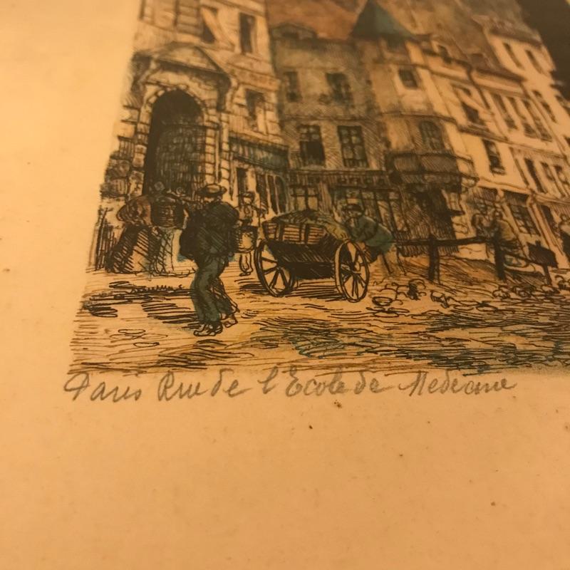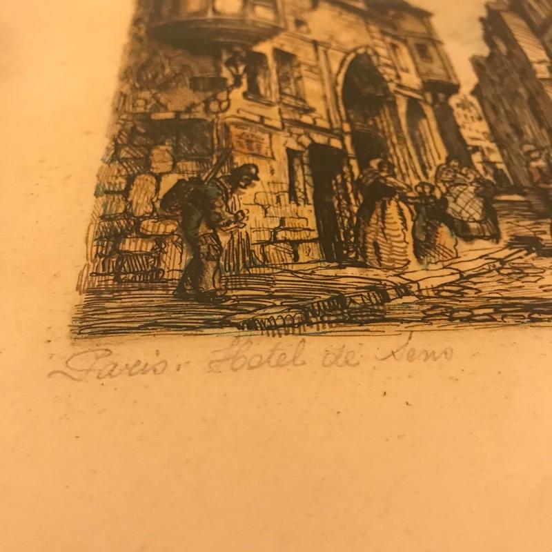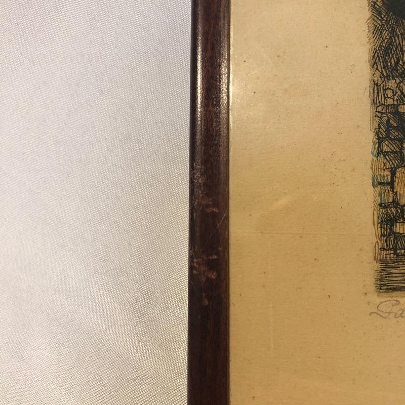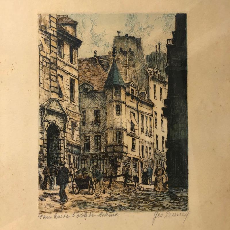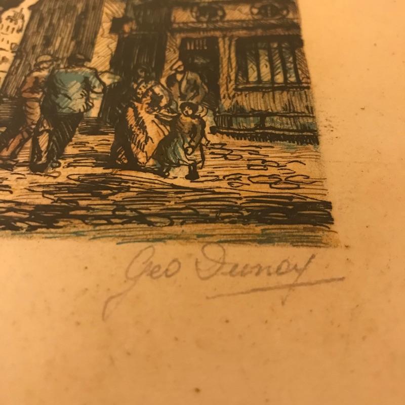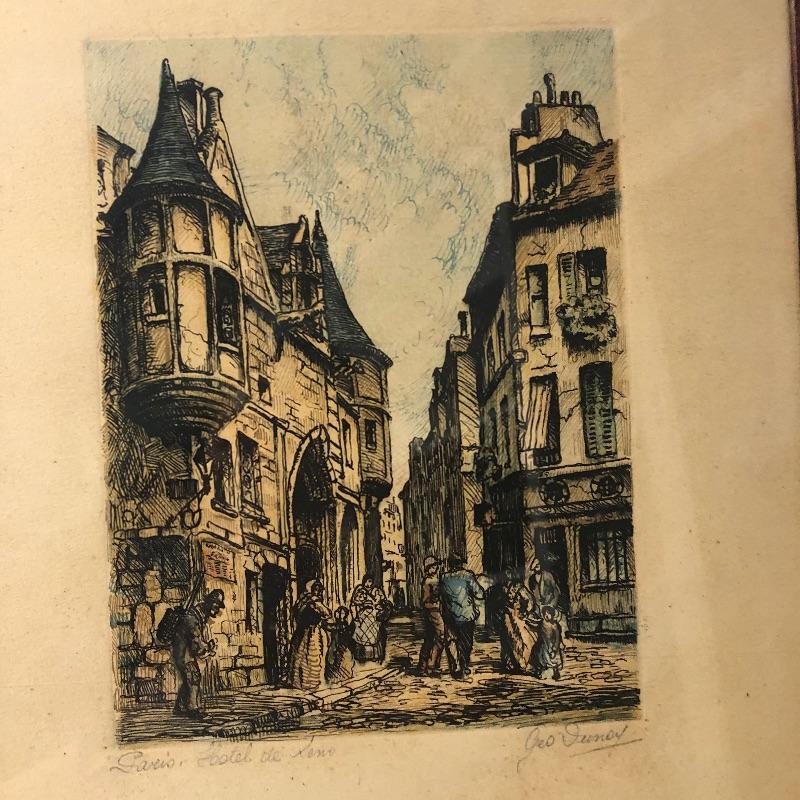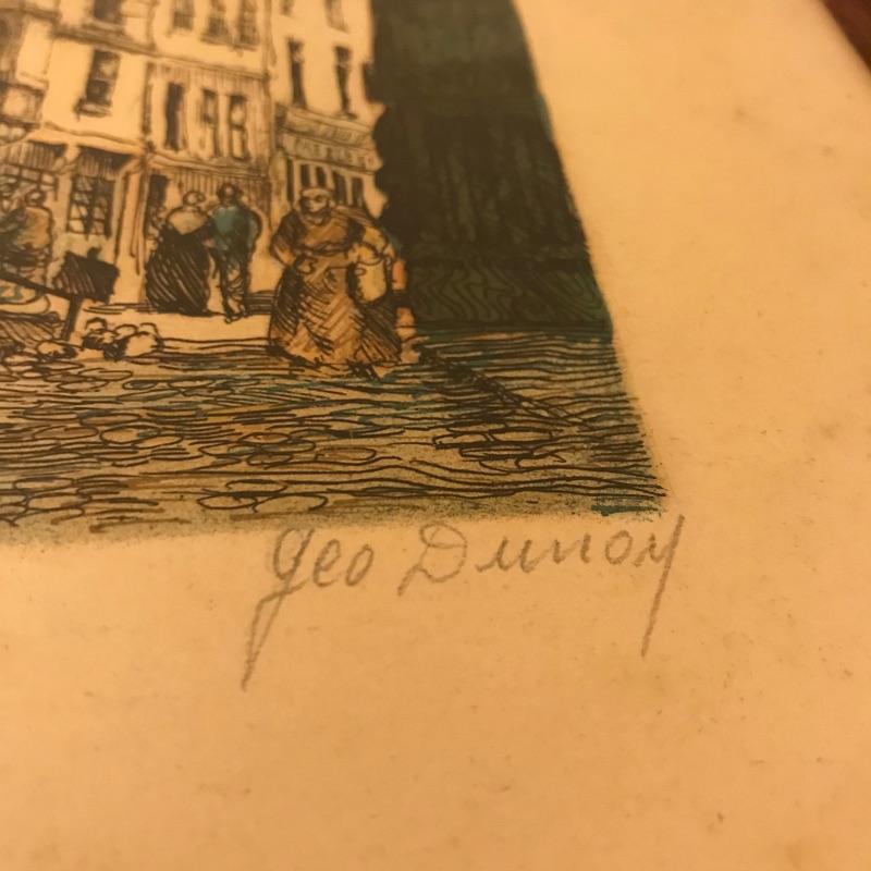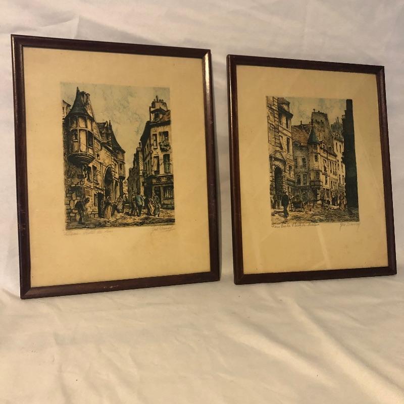 Two wood framed pen and ink cityscapes of Parisian neighborhoods. Both pencil signed by artist, Geo Dunoy. There are slight blemishes on the frames and the backside paper for each frame is slightly torn. The images are on dark ivory paper with the illusion of being matted. The paper “mat” might have very mild discoloring, but it could possibly be the style of the paper. The pictures are approximately 11” x 14” and are in great shape. Shipping Available.