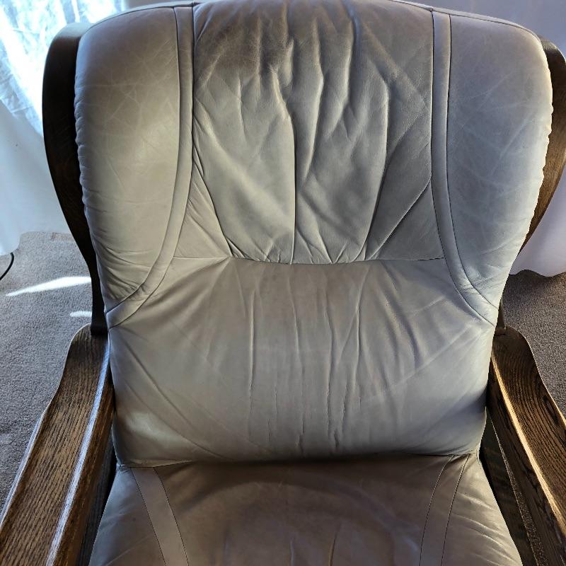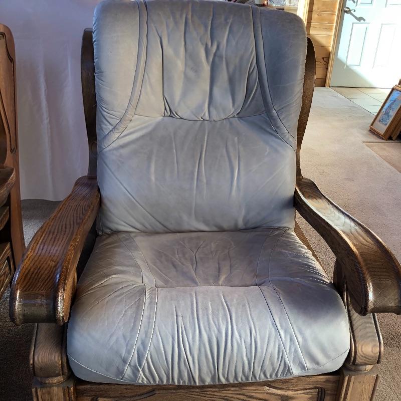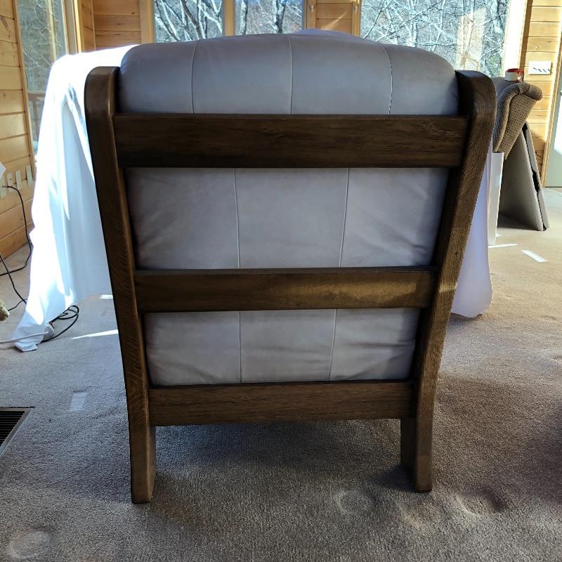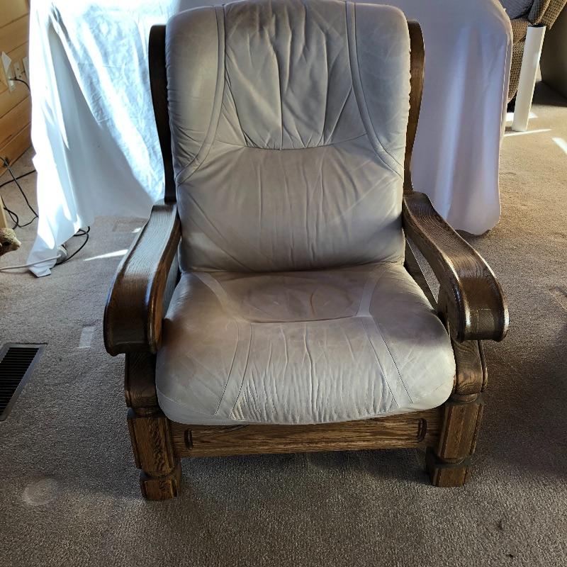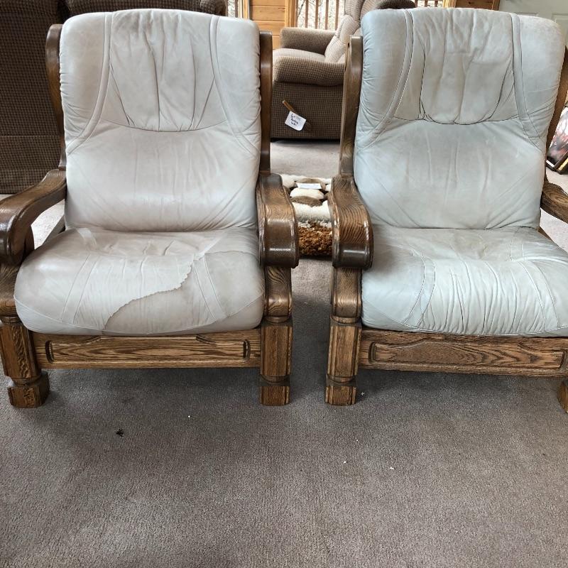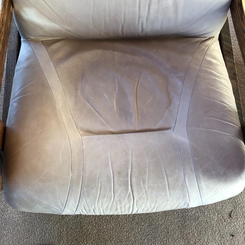 Sit back and relax in this pair of comfortable chairs. Lot includes two matching chairs with leather covered cushions and solid frames that were made in Belgium by the European American Furniture Company. The leather is completely sun bleached from a tan/brown color and though not too obvious the leather is different coloring on the two sets of cushions. Chairs measure 31” x 35” x 39”. Matches lot 26. One chair has a water stain on the leather, see pictures.