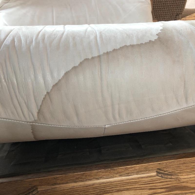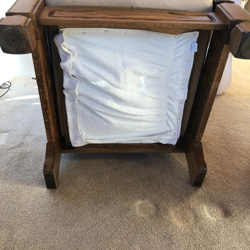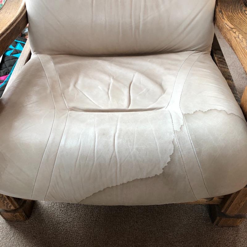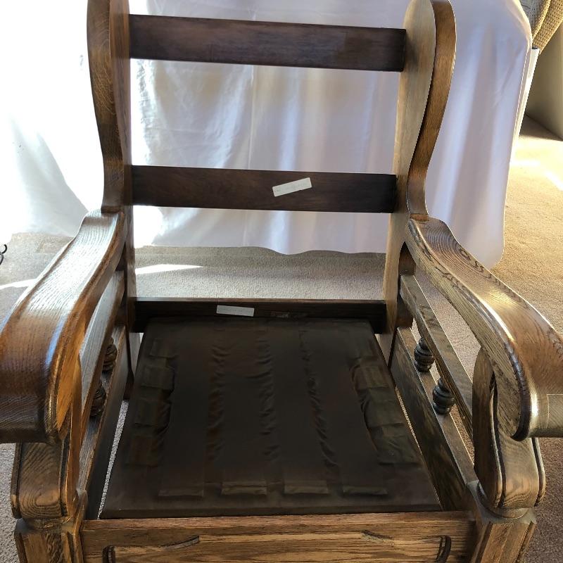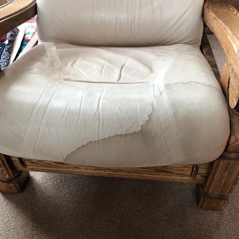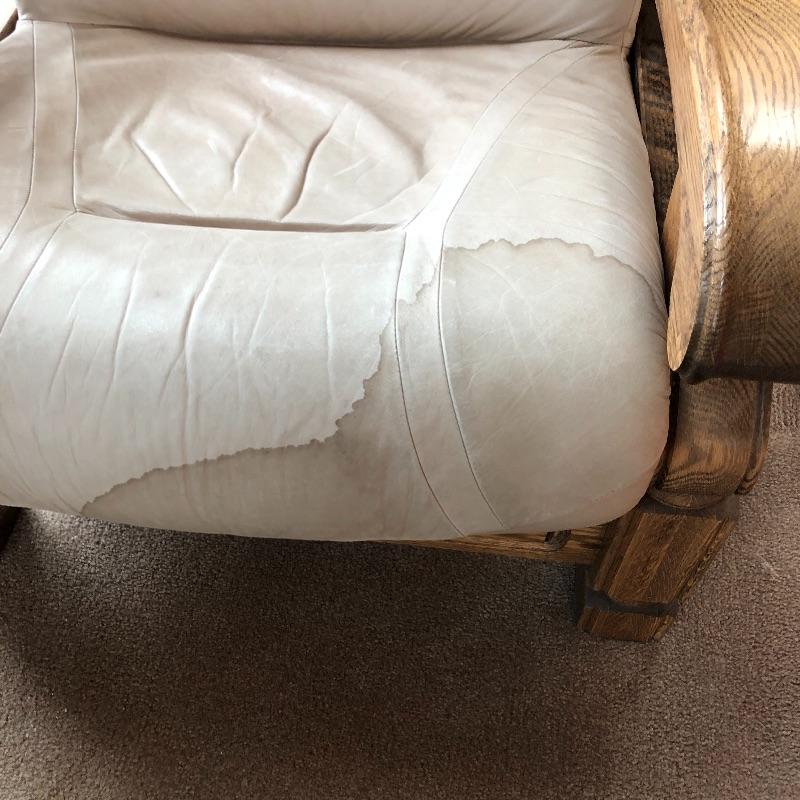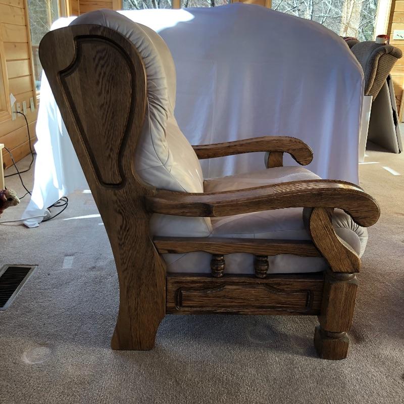 Sit back and relax in this pair of comfortable chairs. Lot includes two matching chairs with leather covered cushions and solid frames that were made in Belgium by the European American Furniture Company. The leather is completely sun bleached from a tan/brown color and though not too obvious the leather is different coloring on the two sets of cushions. Chairs measure 31” x 35” x 39”. Matches lot 26. One chair has a water stain on the leather, see pictures.