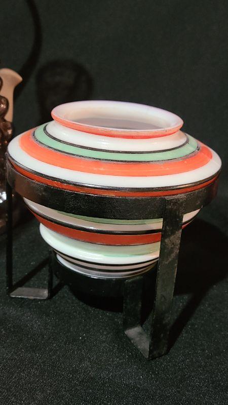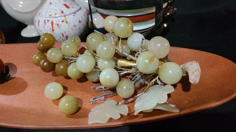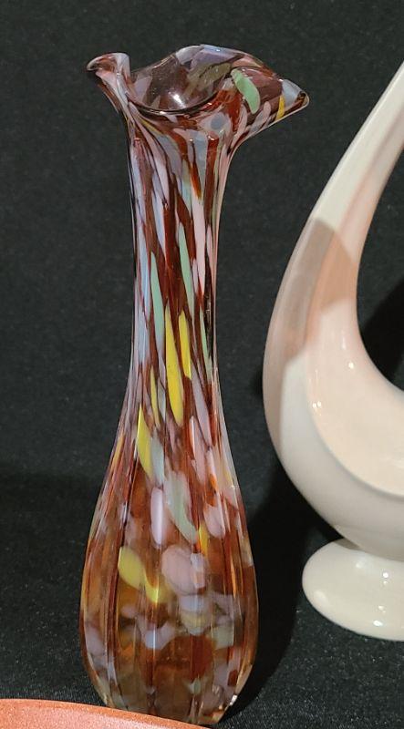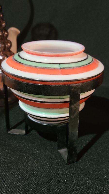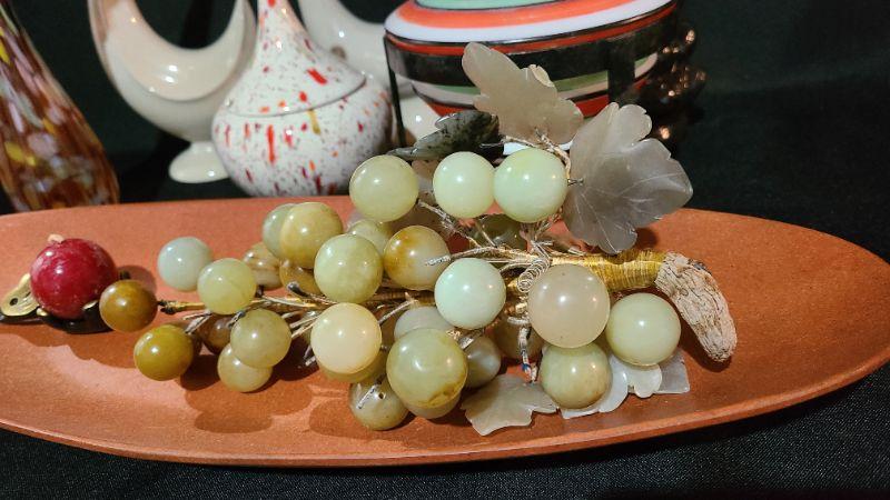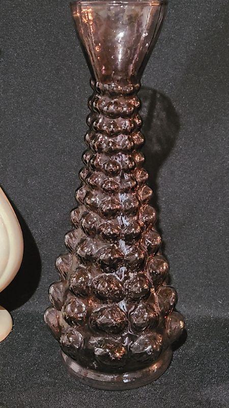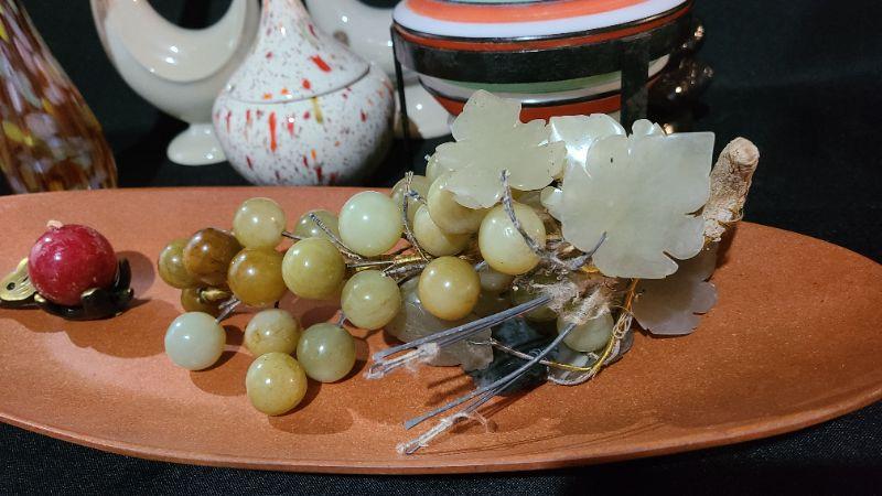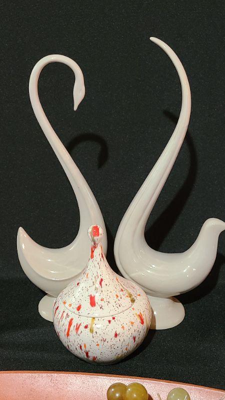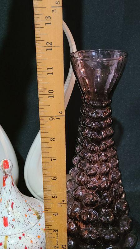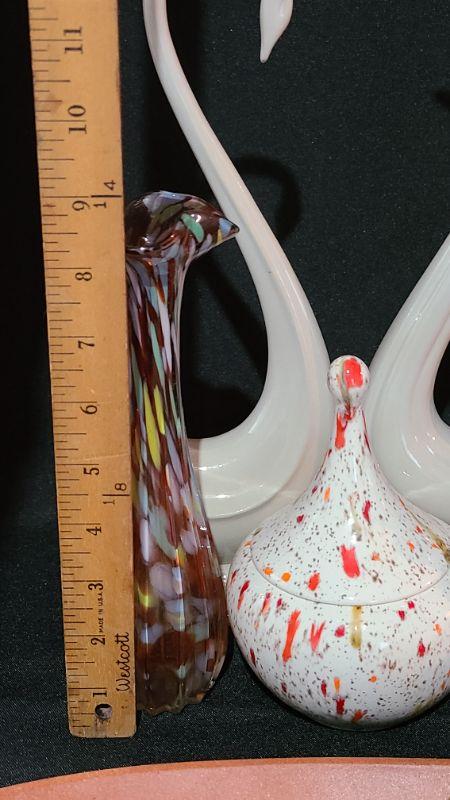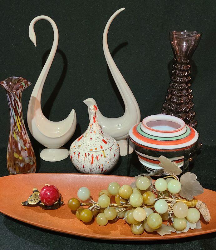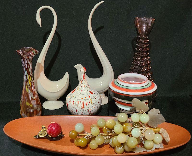 This lot contains some unique and fun MCM pieces: Alabaster grapes (as-is) Flintwood California 17 inch centerpiece, cast iron cat candle, speckled small candy/trinket vase, purple glass bubble vase, ceramic long neck birds, and a very unique mid century flush-mount glass shade with 3 inch opening and metal cage! Can also be used as vase!