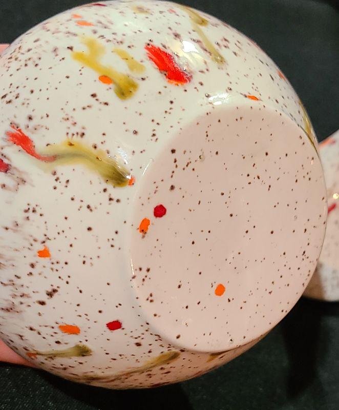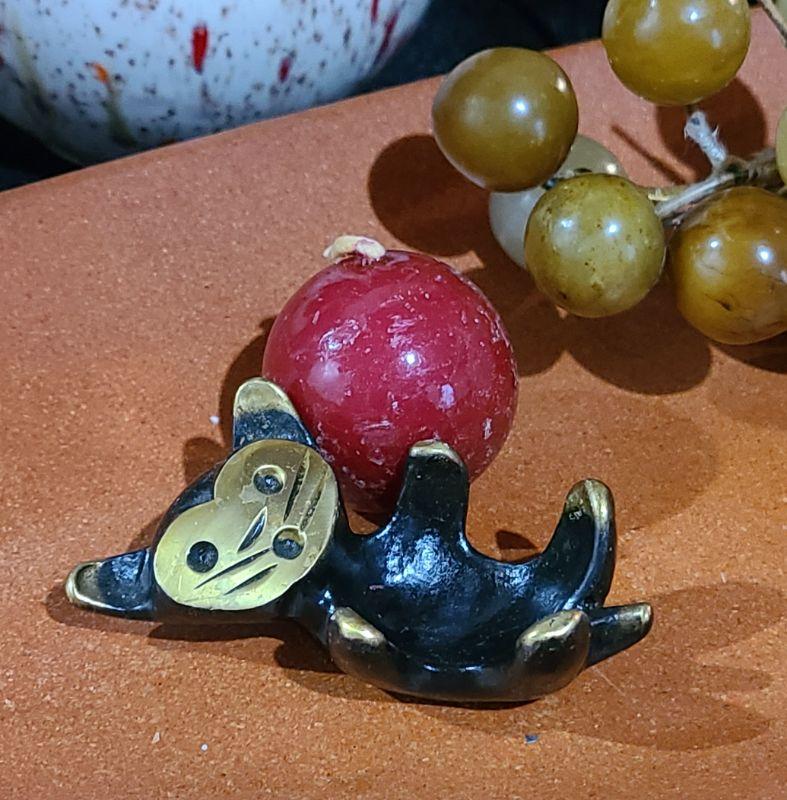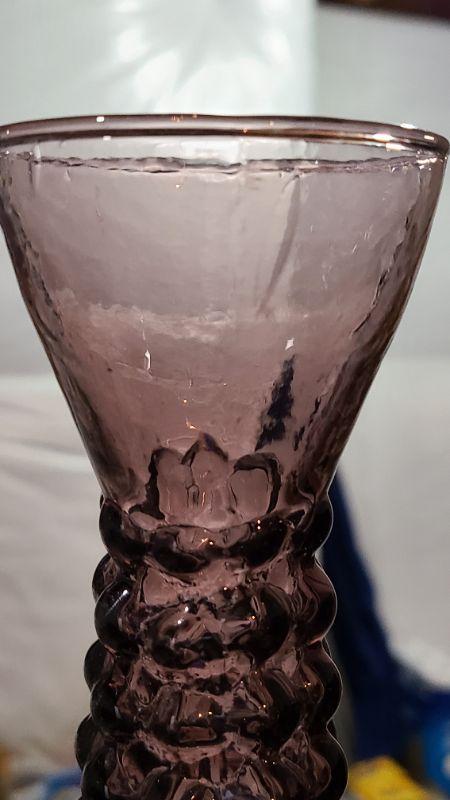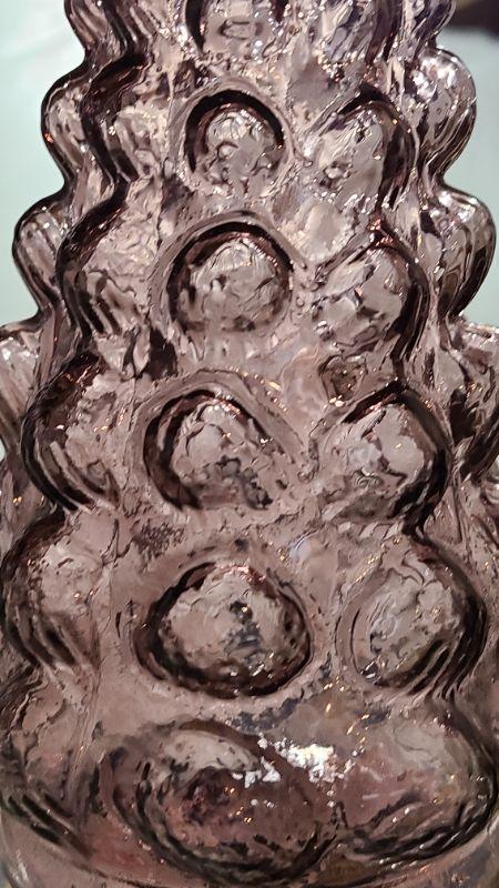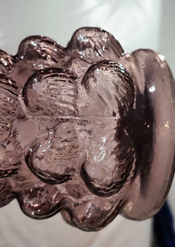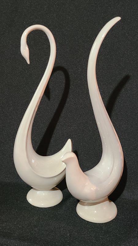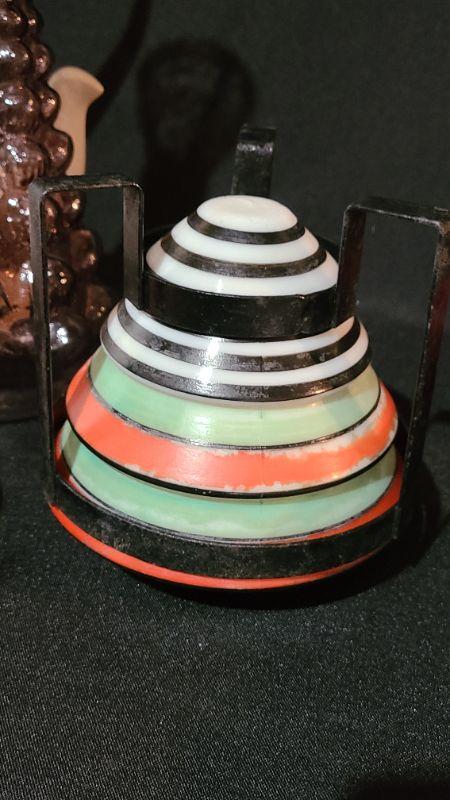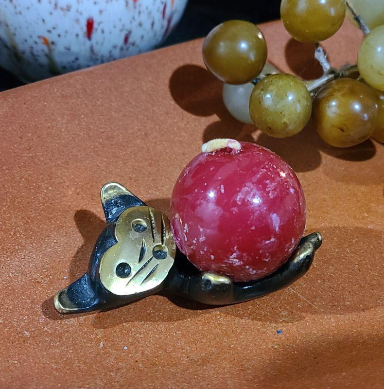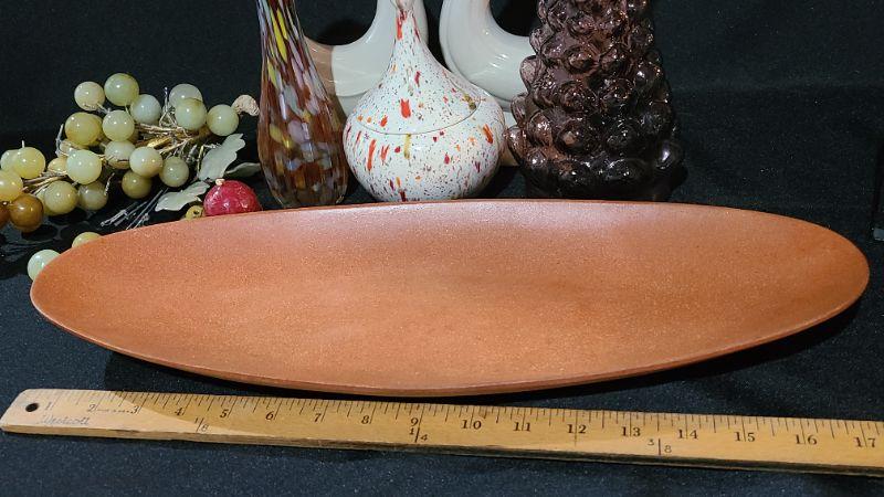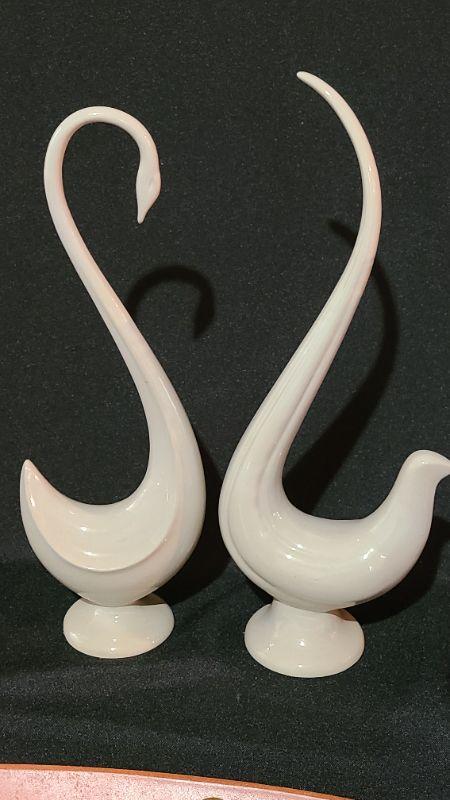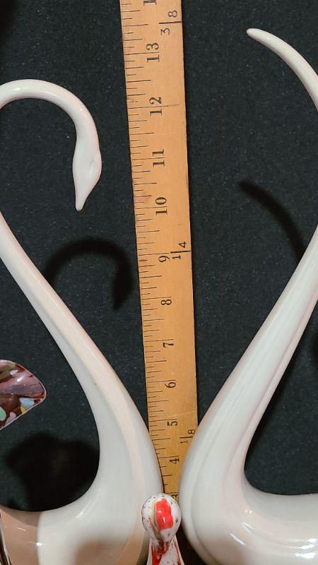 This lot contains some unique and fun MCM pieces: Alabaster grapes (as-is) Flintwood California 17 inch centerpiece, cast iron cat candle, speckled small candy/trinket vase, purple glass bubble vase, ceramic long neck birds, and a very unique mid century flush-mount glass shade with 3 inch opening and metal cage! Can also be used as vase!