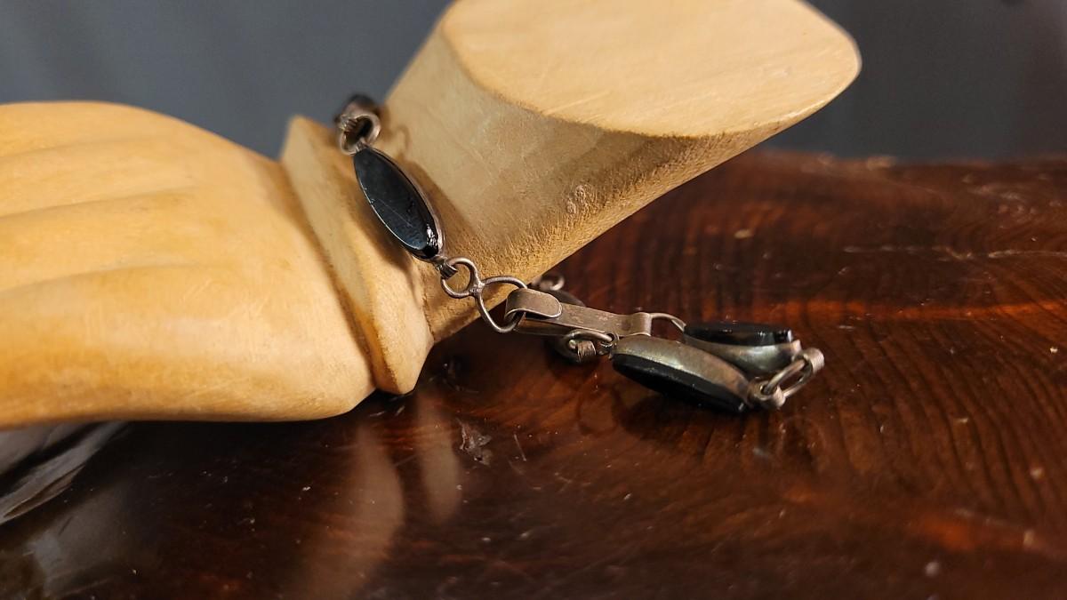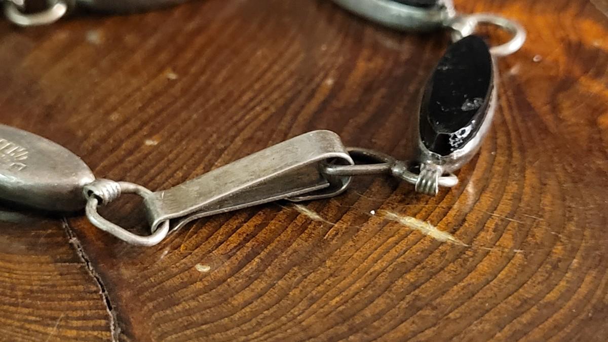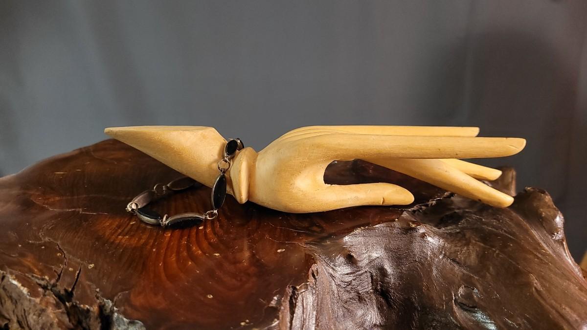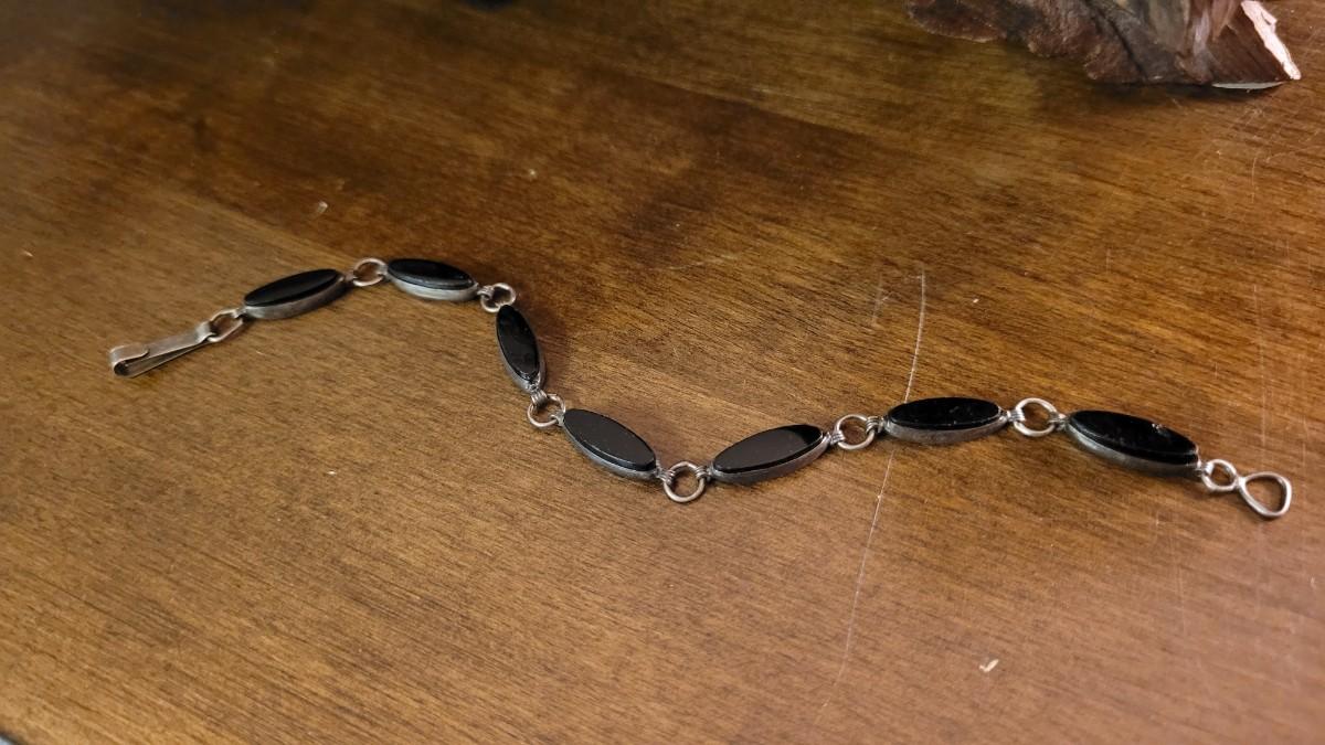 This lot features a 7" Vintage Sterling Silver HECHO EN MEXICO Bracelet with a stunning bed of black oval shaped onyx stones that drape elegantly across the entire wrist. Although a few of the stones do show some minor wear To be expected with age, the piece still has many years of compliments left. Unpolished. Just over 7 grams total.