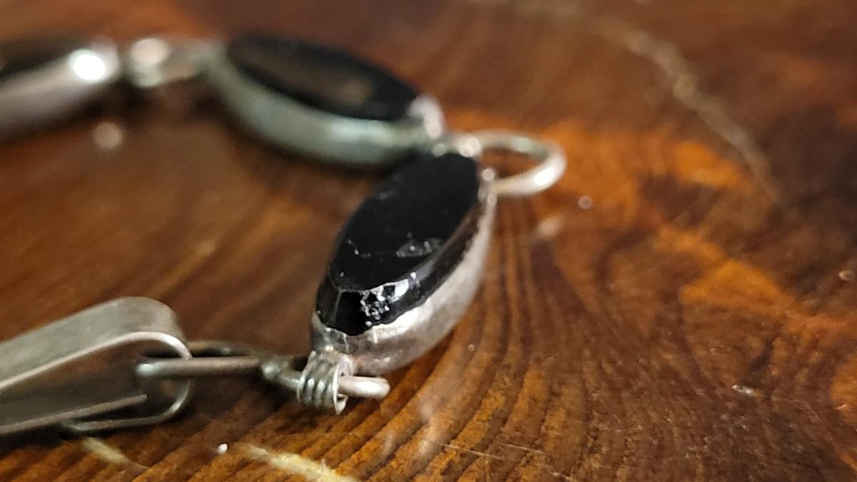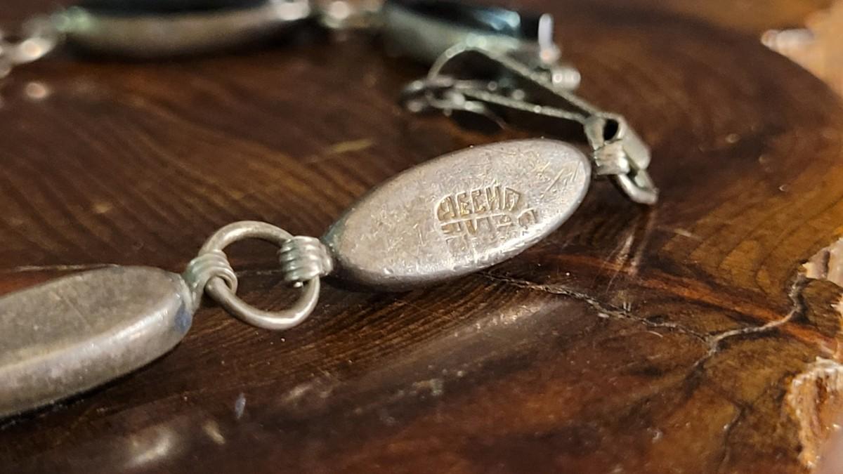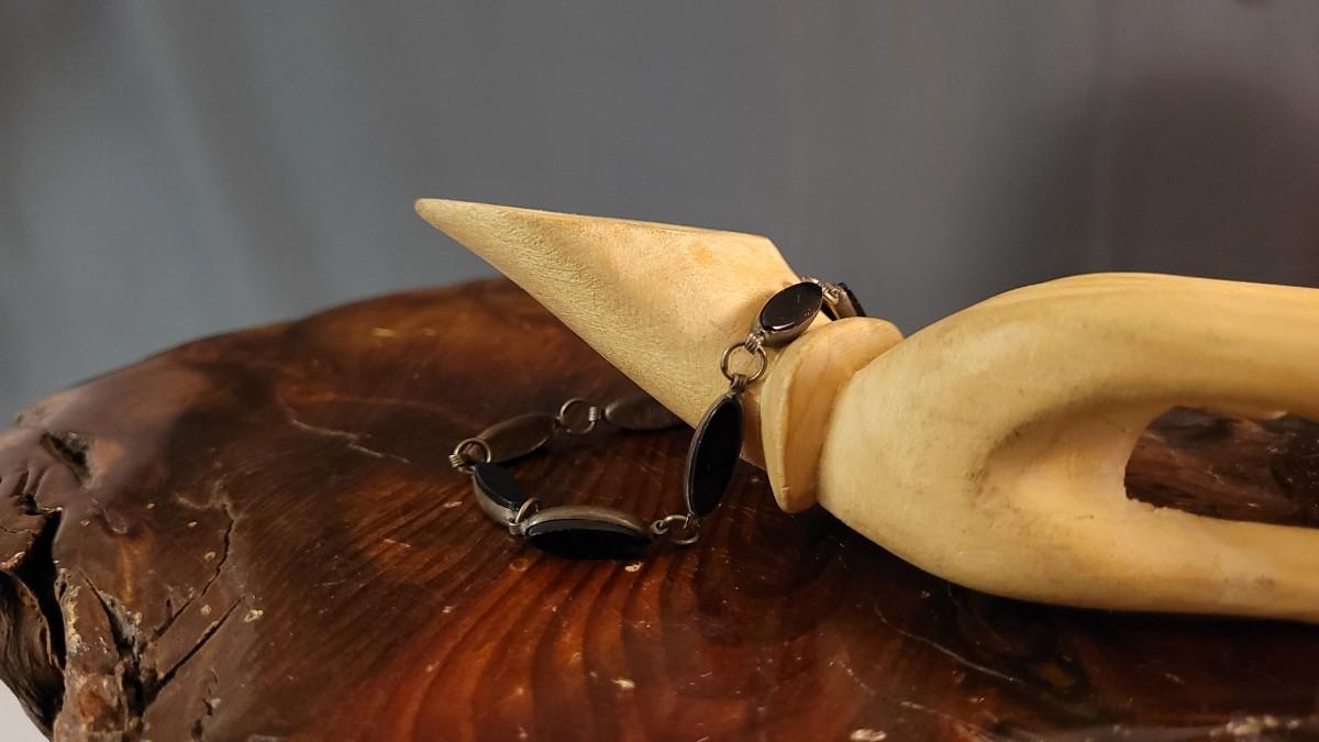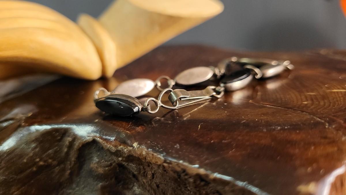 This lot features a 7" Vintage Sterling Silver HECHO EN MEXICO Bracelet with a stunning bed of black oval shaped onyx stones that drape elegantly across the entire wrist. Although a few of the stones do show some minor wear To be expected with age, the piece still has many years of compliments left. Unpolished. Just over 7 grams total.