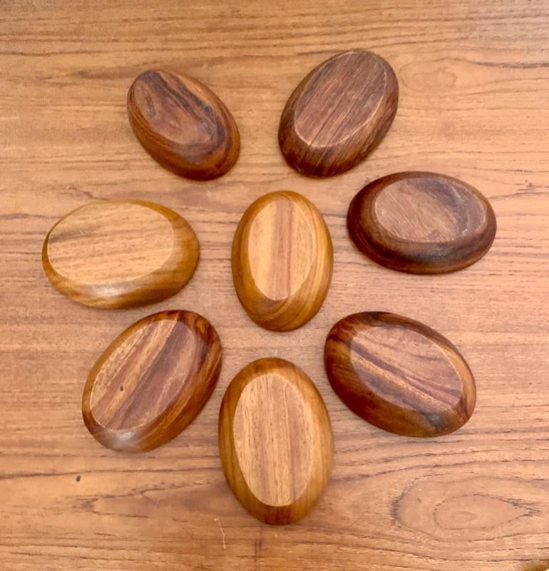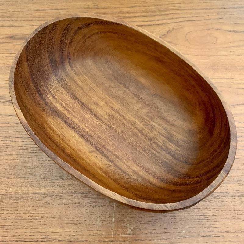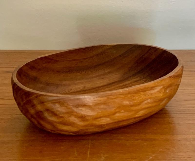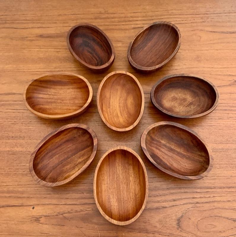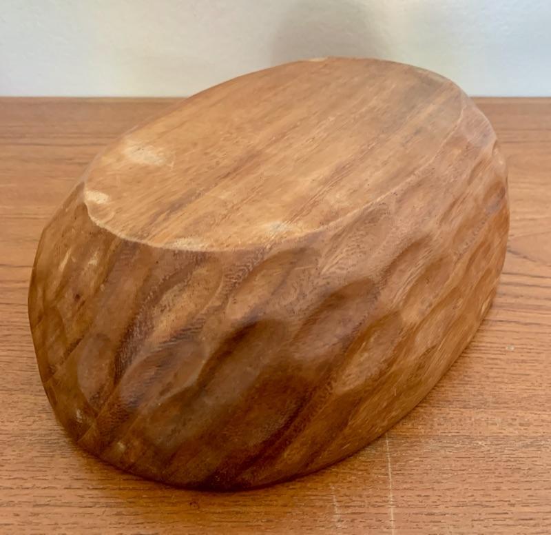 11 piece, wooden salad bowl serving set, includes: 1 very large salad bowl (10 3/4" x 15 3/4" x 4 7/8") , thumbprint design on outside. 8 oval individual bowls (6 1/4" - 6 3/4" x 4 1/4" - 5"). Serving utensils are 10" long. All have typical wear for age.